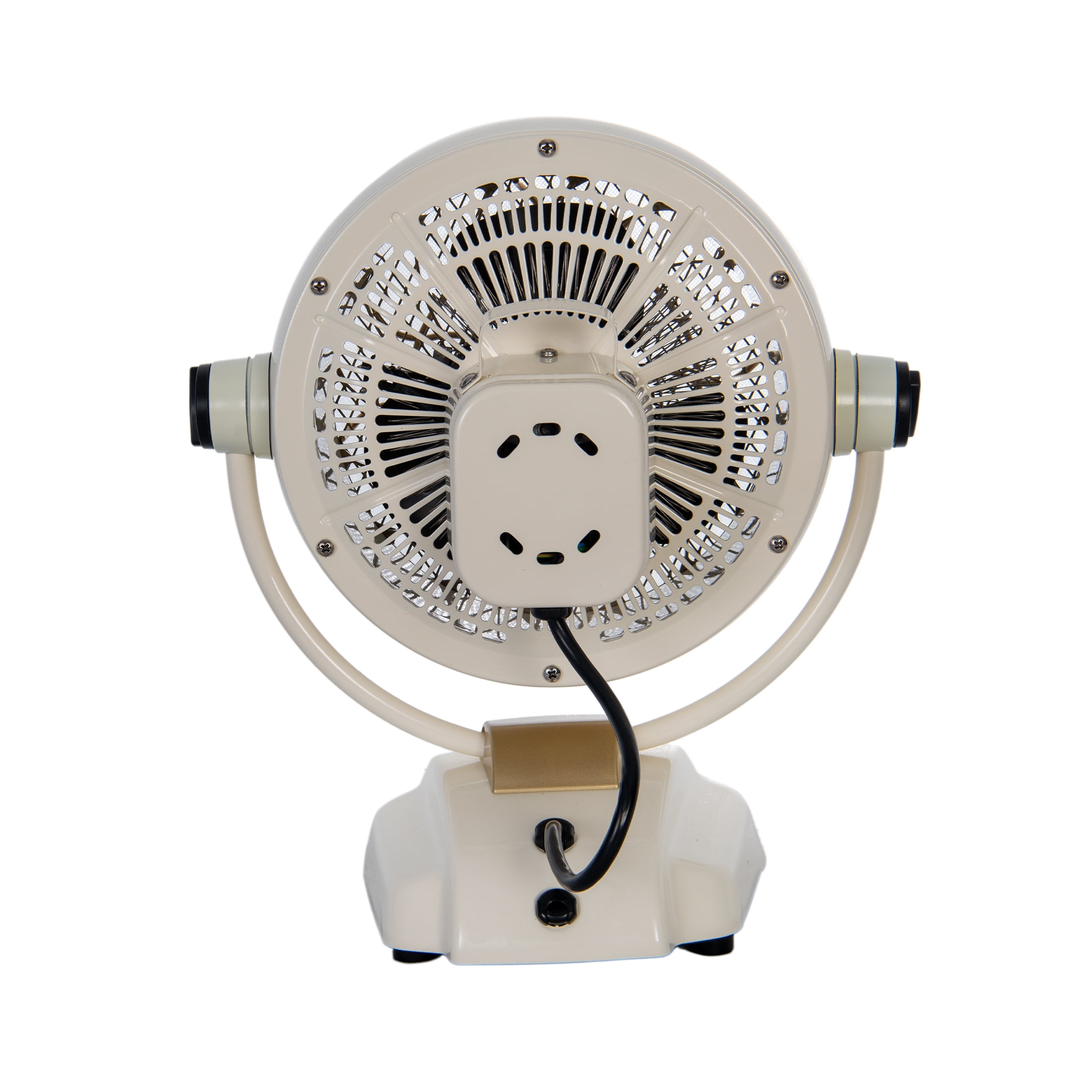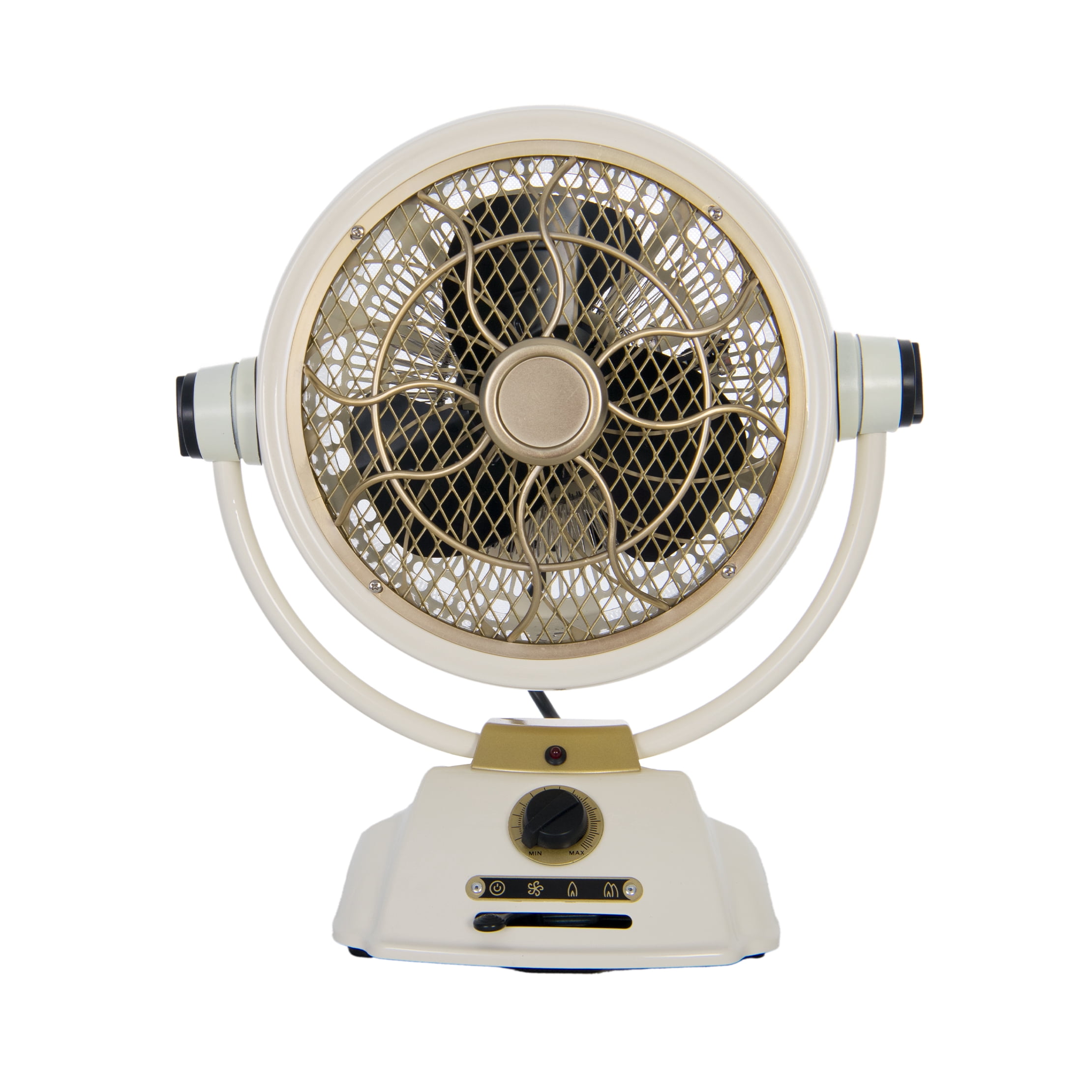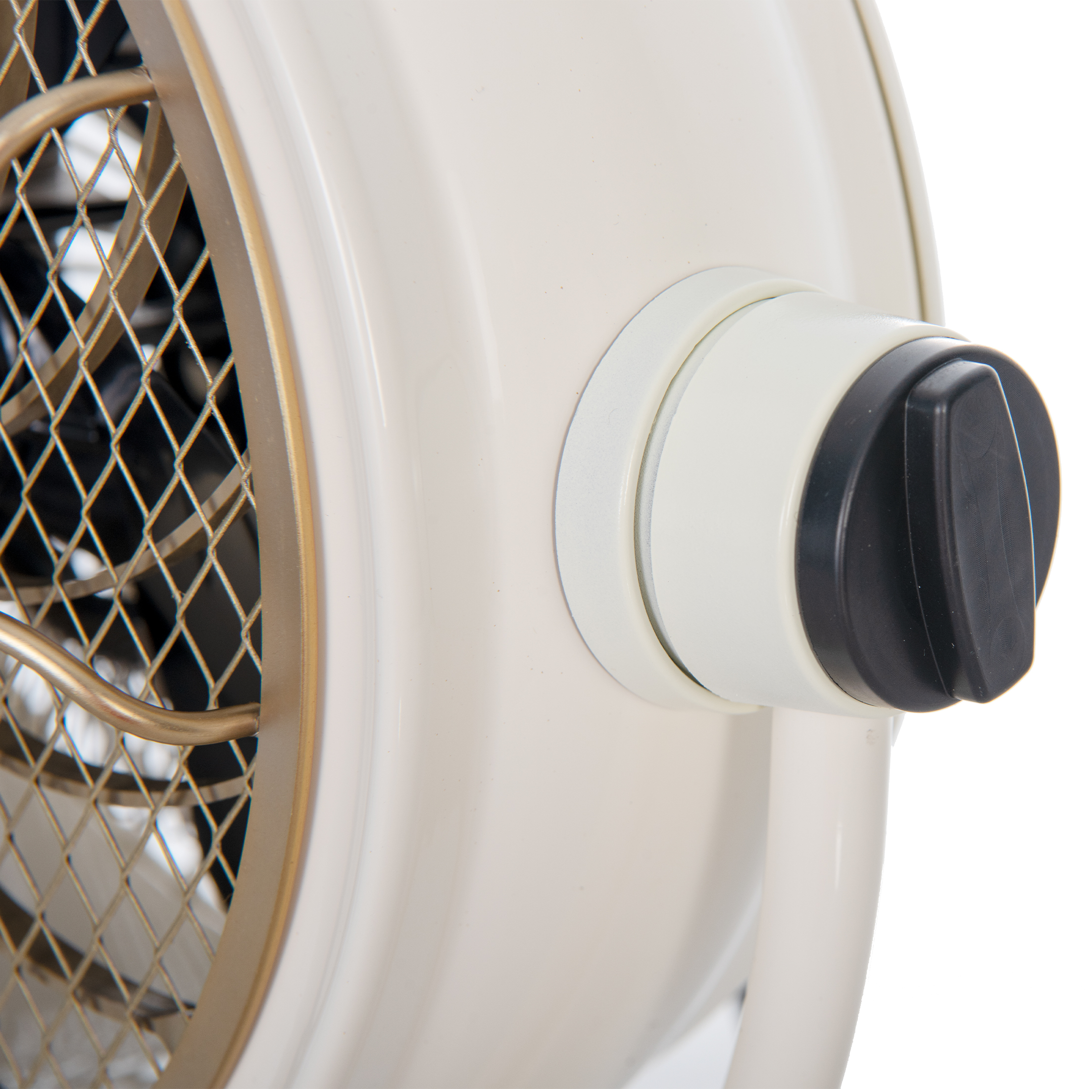 BHG NEW RETRO TABLETOP HEATER features 2 heat settings & 1 -fan mode with safety tip over & overheat protection. This heater with retro design and strong metal construction, fan head can be 110-degree tilting adjustable, suitable for personal use on your office table or other household places such as bedroom etc. The heater arrives in fully assembly so that you can use it directly out of boxes. There are two heating options of 1000W & 1500W for your choice. Adjustable thermostat switch can be determined the warmth level according to your requirement. This product with UL certified for your safety use. There are two colors for the heater, one is black & brass finish for model BHF136163273001, the other is cream white & brass for model BHF136163273002 that you can choose either of one for the decor of your house. The product size is 32 x 20.8 x 36 cm with carry handle in the back.