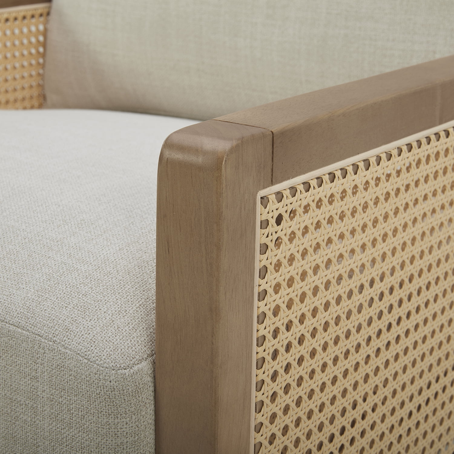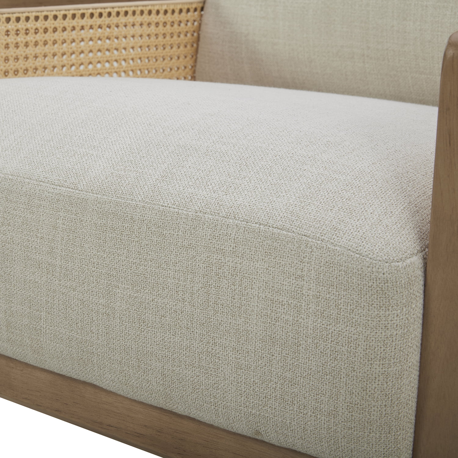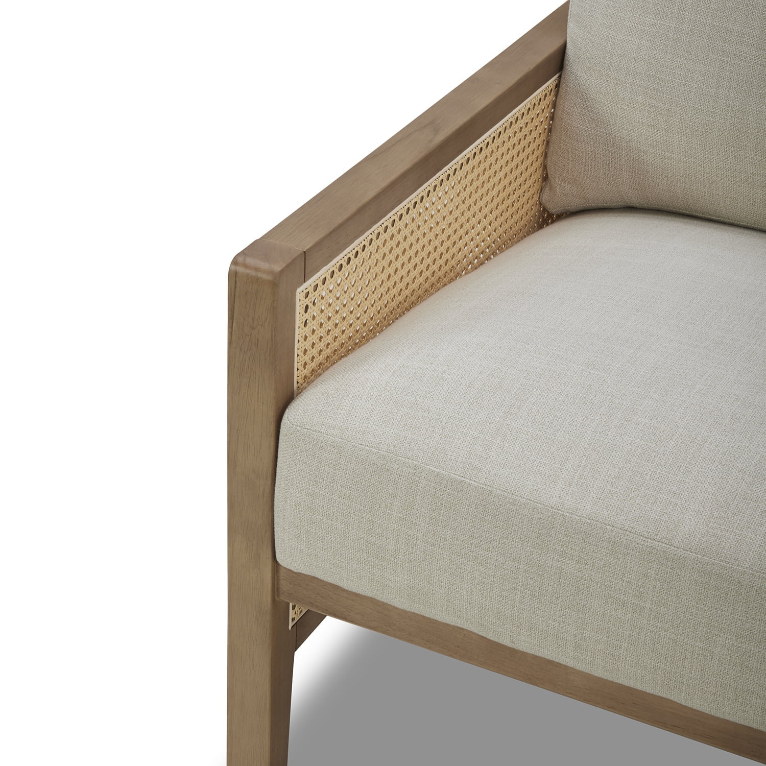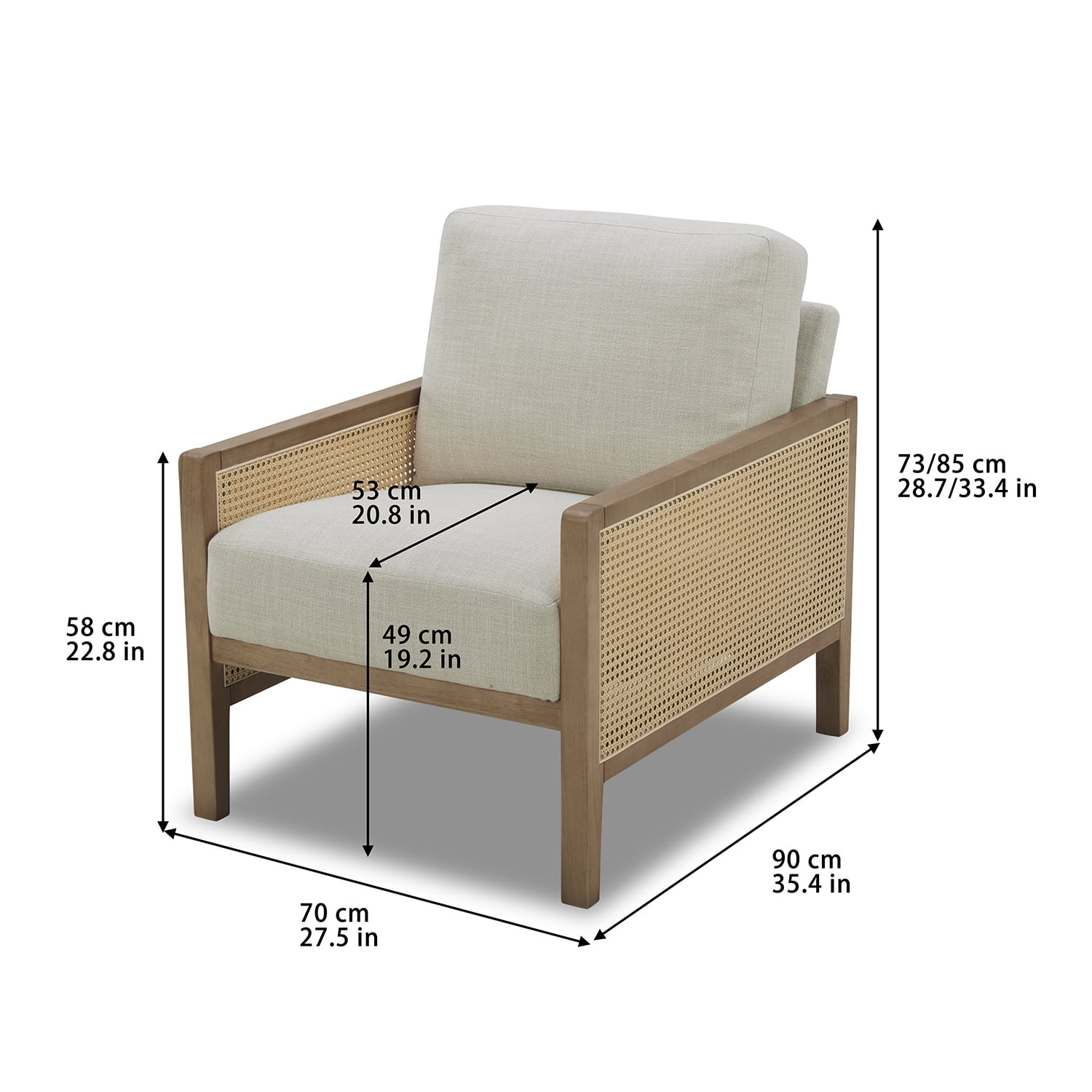 The Better Homes & Gardens Springwood Rattan Accent Chair, Honey, is a stylish and comfortable addition to any home. With square arms and matching stitching, this chair boasts attention to detail and plush cushions for relaxing seating. The removable back cushion adds versatility, while the rattan accent and linen-look fabric provide natural beauty and elegance. Durably constructed with solid and engineered wood, this chair ensures long-lasting comfort and support. No assembly required, this hassle-free chair is perfect for any living space, captivating with its style and comfort.