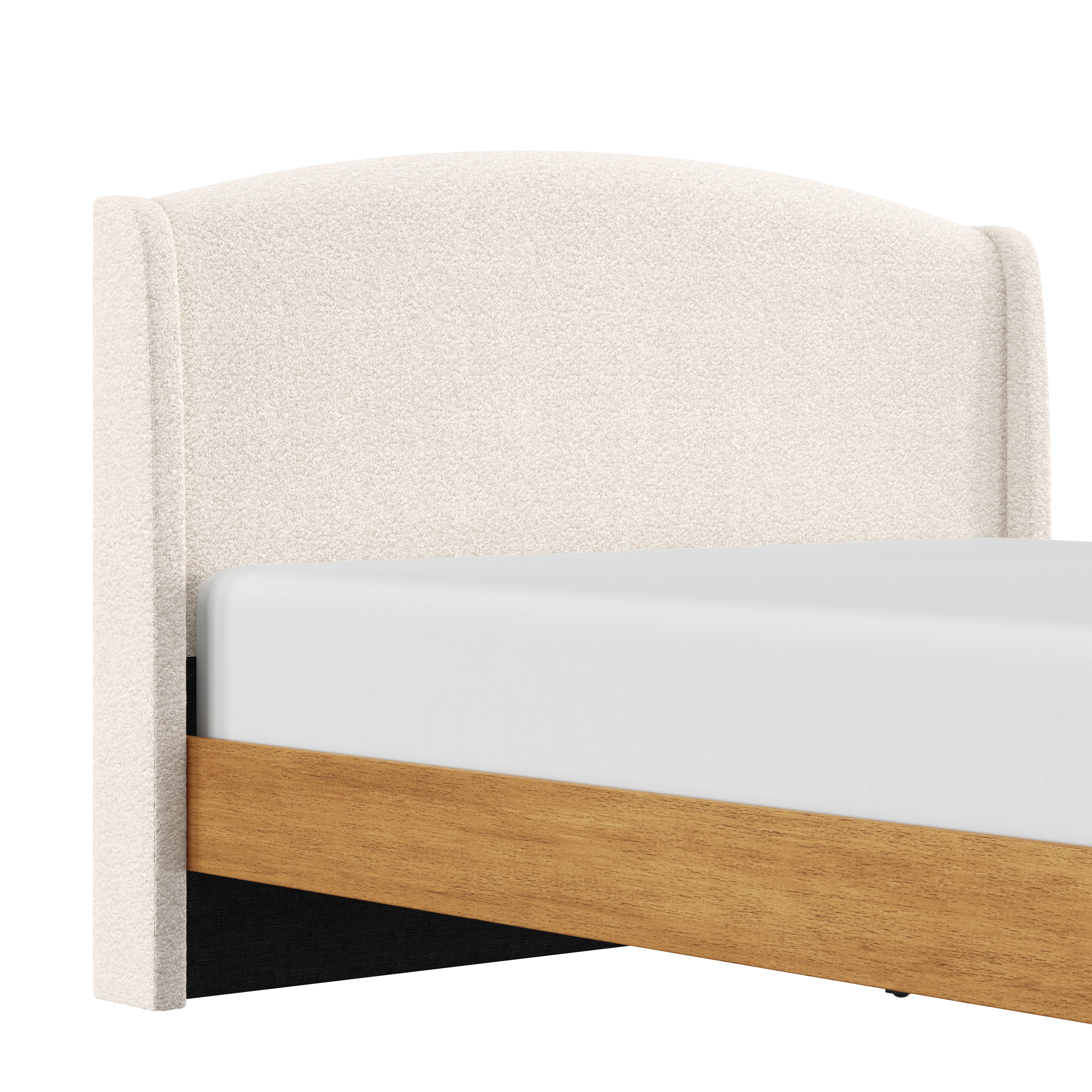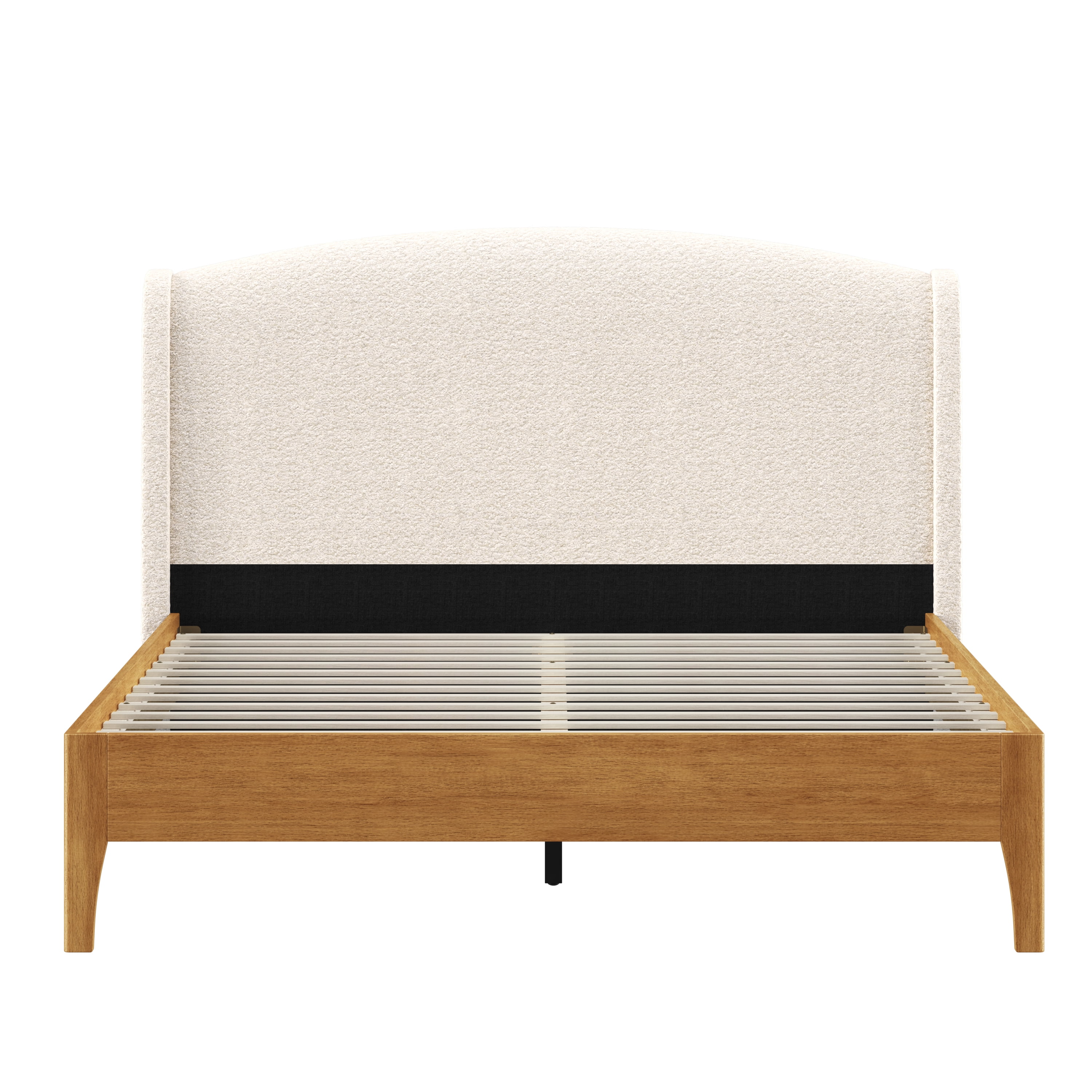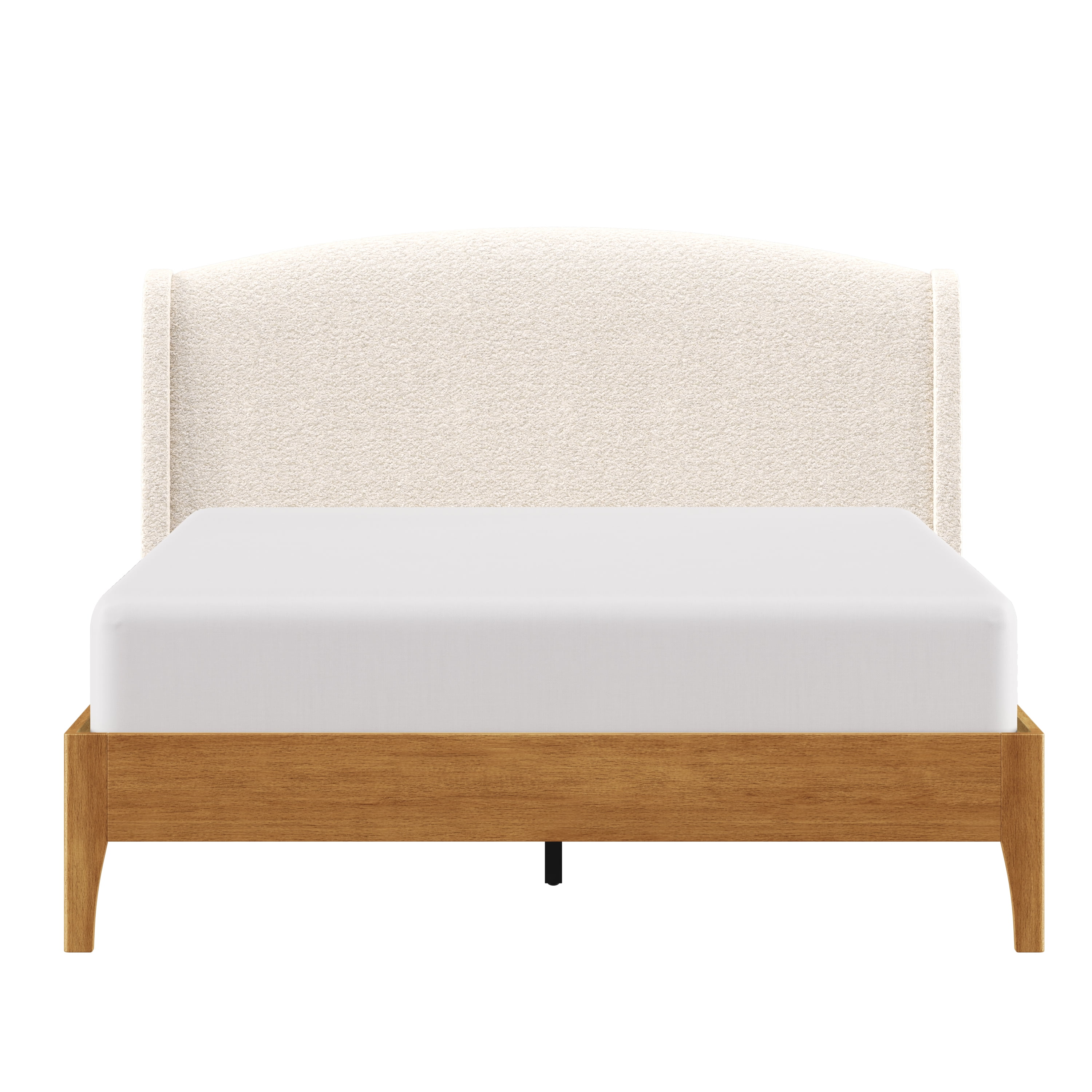 Sink back into the plush headboard of this queen platform bed, luxuriously upholstered in an oh-so-soft cream faux shearling. With an elegant wingback silhouette and a sleek wooden frame, this piece is as easy on the eyes as it is on your back as you take a moment to yourself after a long day. The arched shelter headboard joins the oak veneer-finished frame for an intriguing contemporary modern aesthetic. This adult platform bed doesn’t require a box spring. Mattress required; not included. Assembly required.
