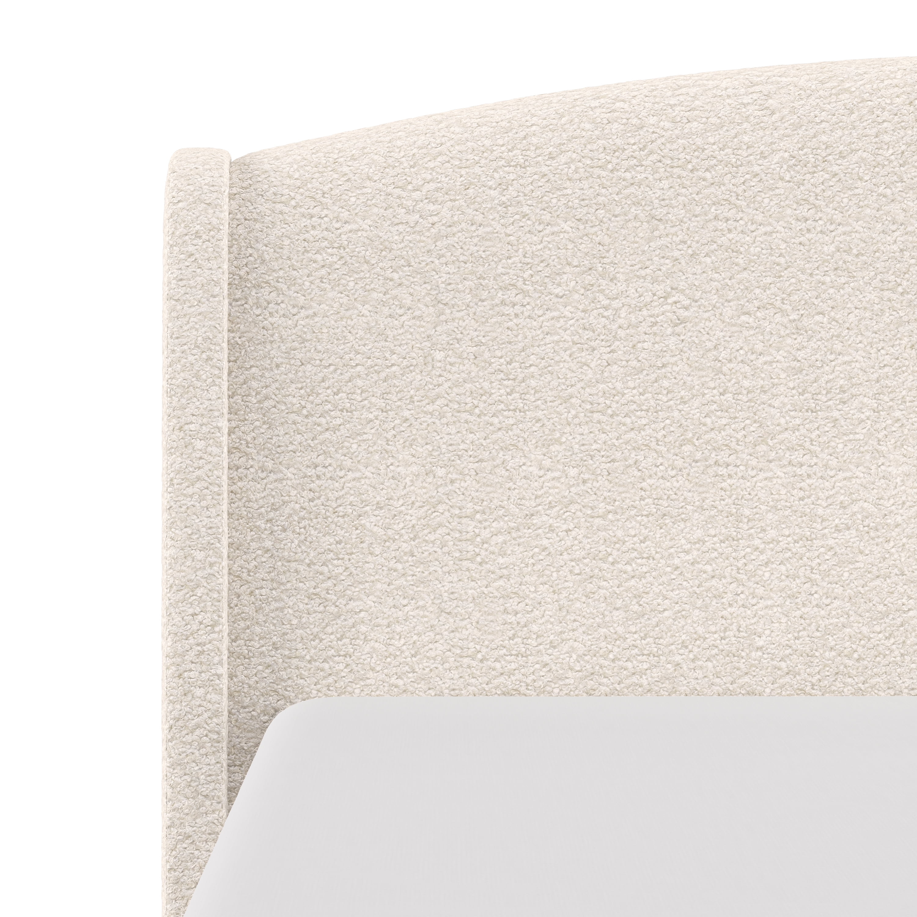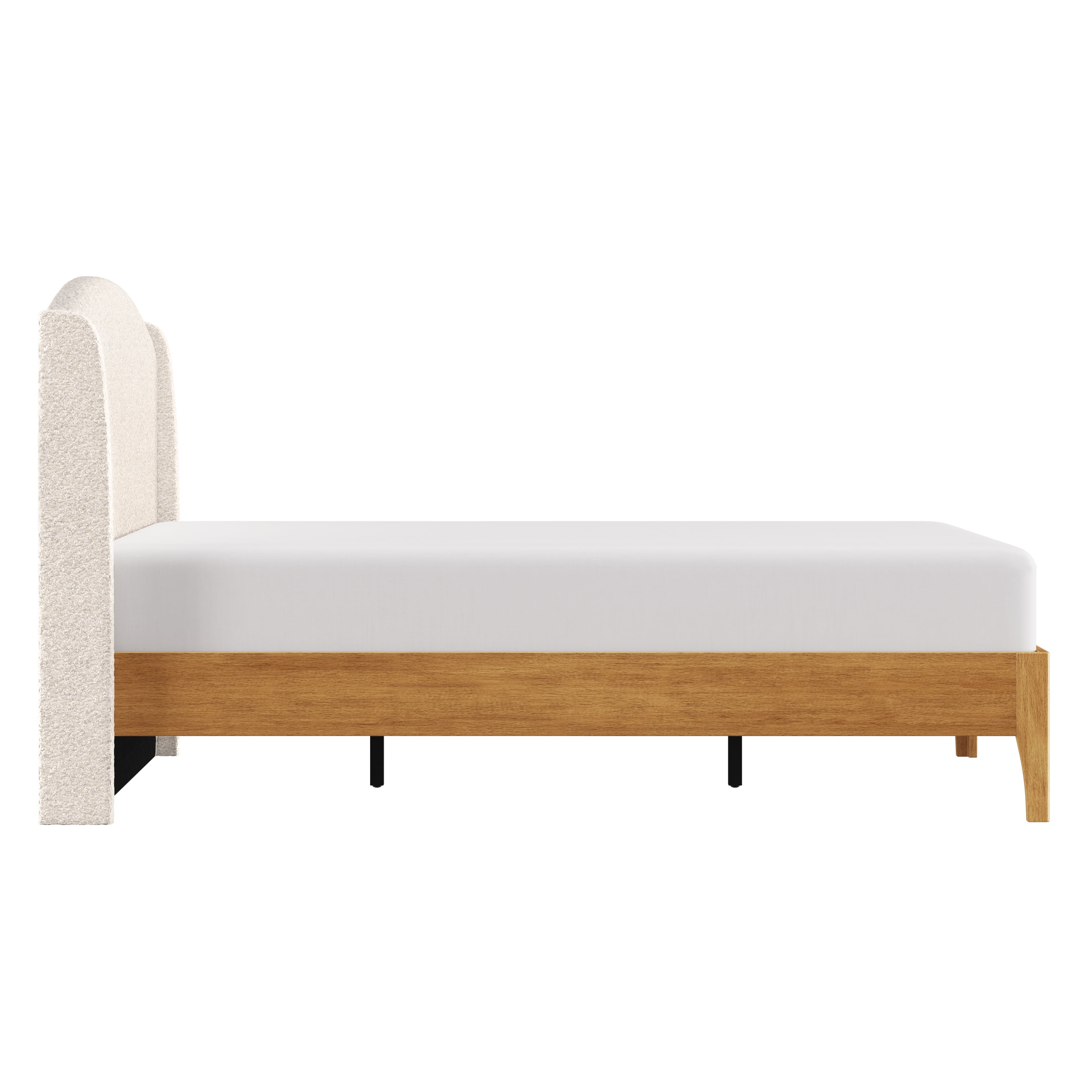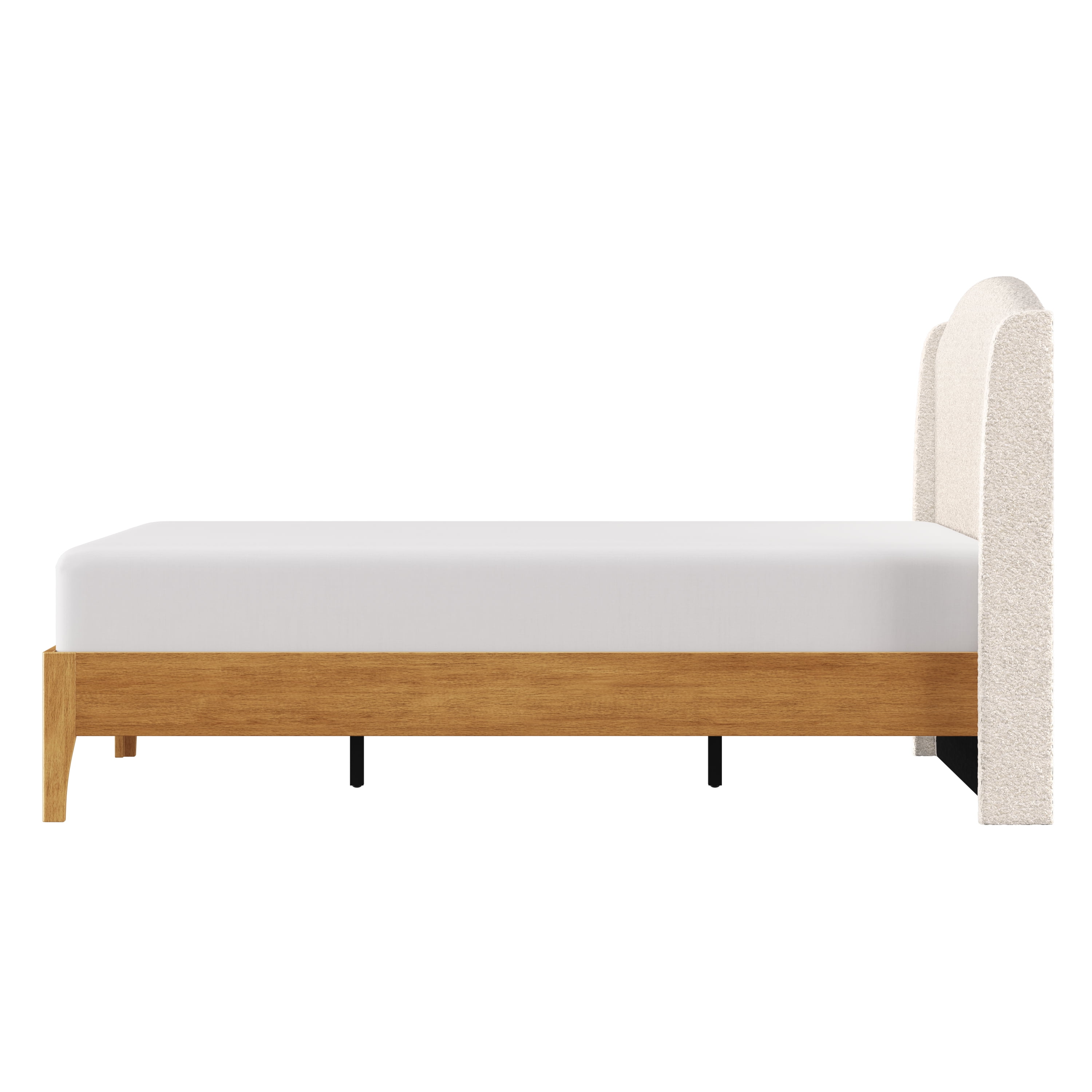 Sink back into the plush headboard of this queen platform bed, luxuriously upholstered in an oh-so-soft cream faux shearling. With an elegant wingback silhouette and a sleek wooden frame, this piece is as easy on the eyes as it is on your back as you take a moment to yourself after a long day. The arched shelter headboard joins the oak veneer-finished frame for an intriguing contemporary modern aesthetic. This adult platform bed doesn’t require a box spring. Mattress required; not included. Assembly required.