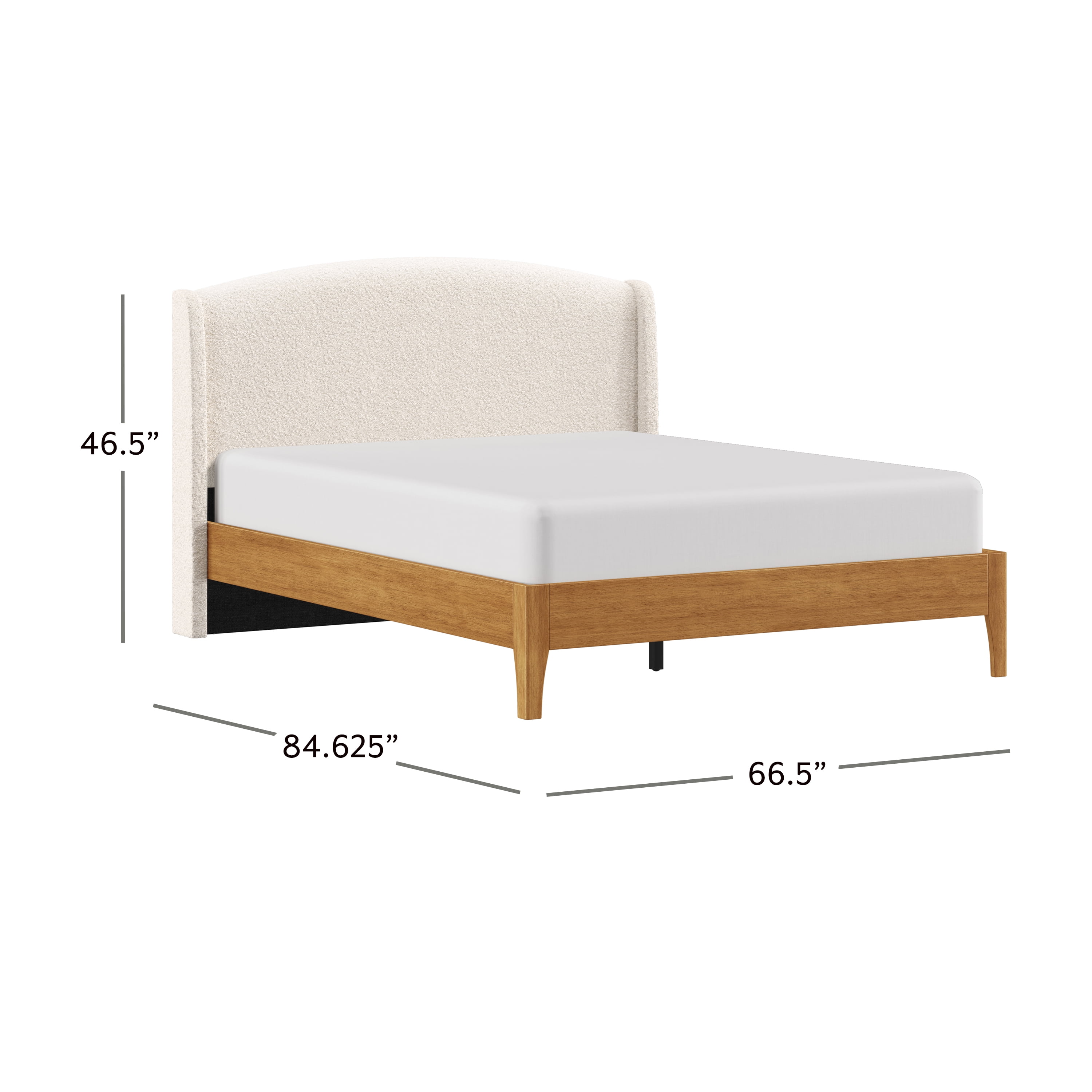 Contemporary modern adult queen platform bed combines a sleek wingback design with luxurious faux shearling upholstery Arched shelter silhouette evokes an easy elegance Rubberwood, MDF, Veneer construction in an oak finish; Upholstery is 100% polyester in a cream shade Overall Dimensions: 46.5H x 66.5W x 84.625D; Headboard Height: 46.5H Assembly required Item will ship in two boxes which may arrive separately Platform style does not require a box spring 500 lb. Recommended weight capacity For residential use only