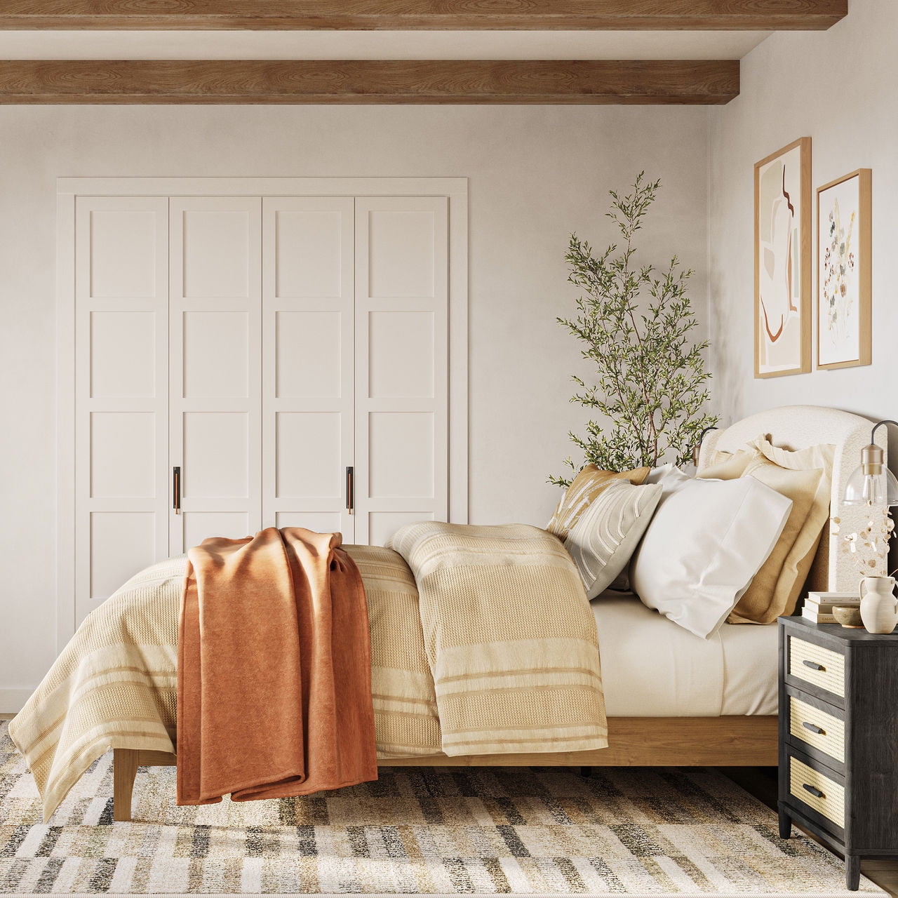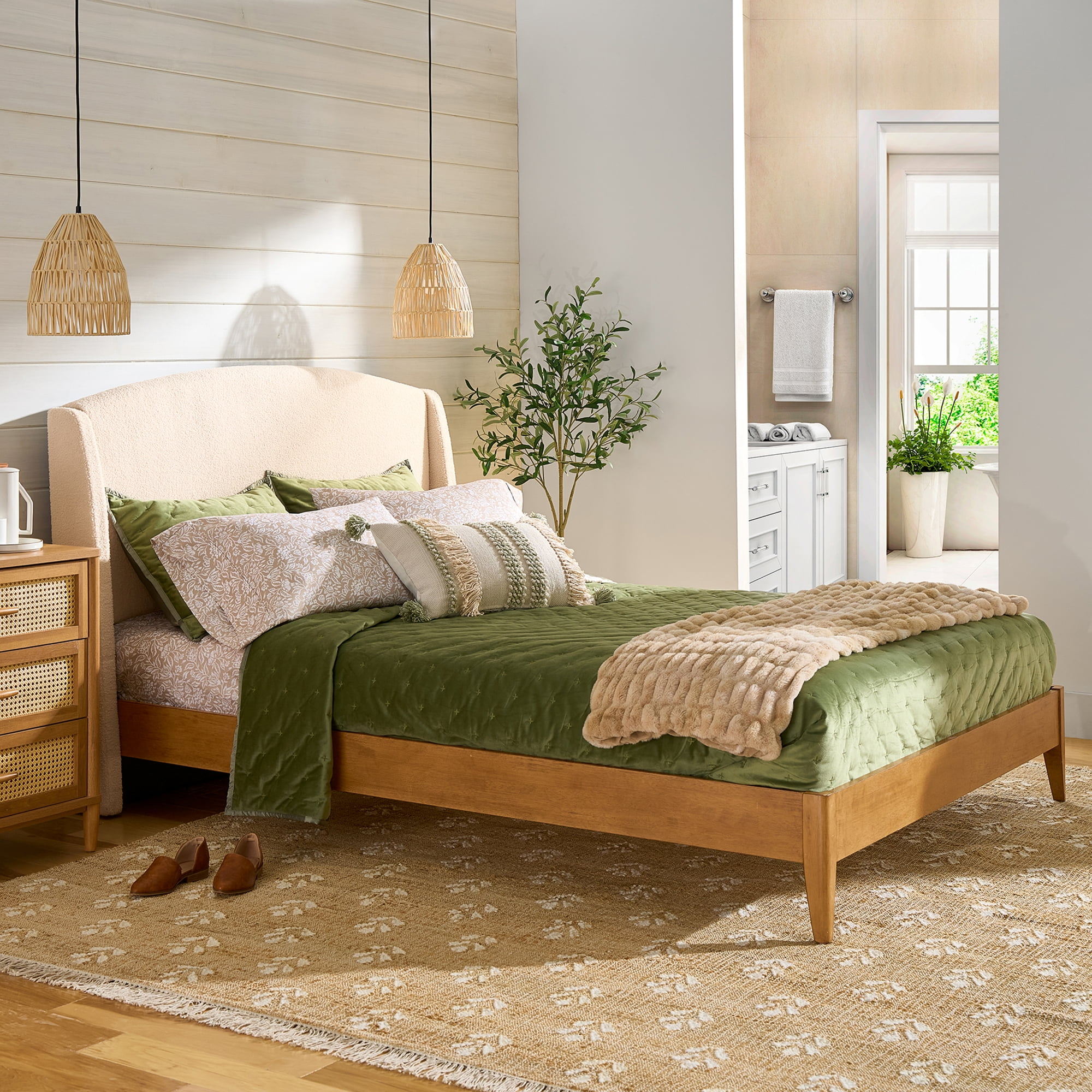 Better Homes & Gardens Springwood Upholstered Queen Bed, Shearling and Light Honey Finish