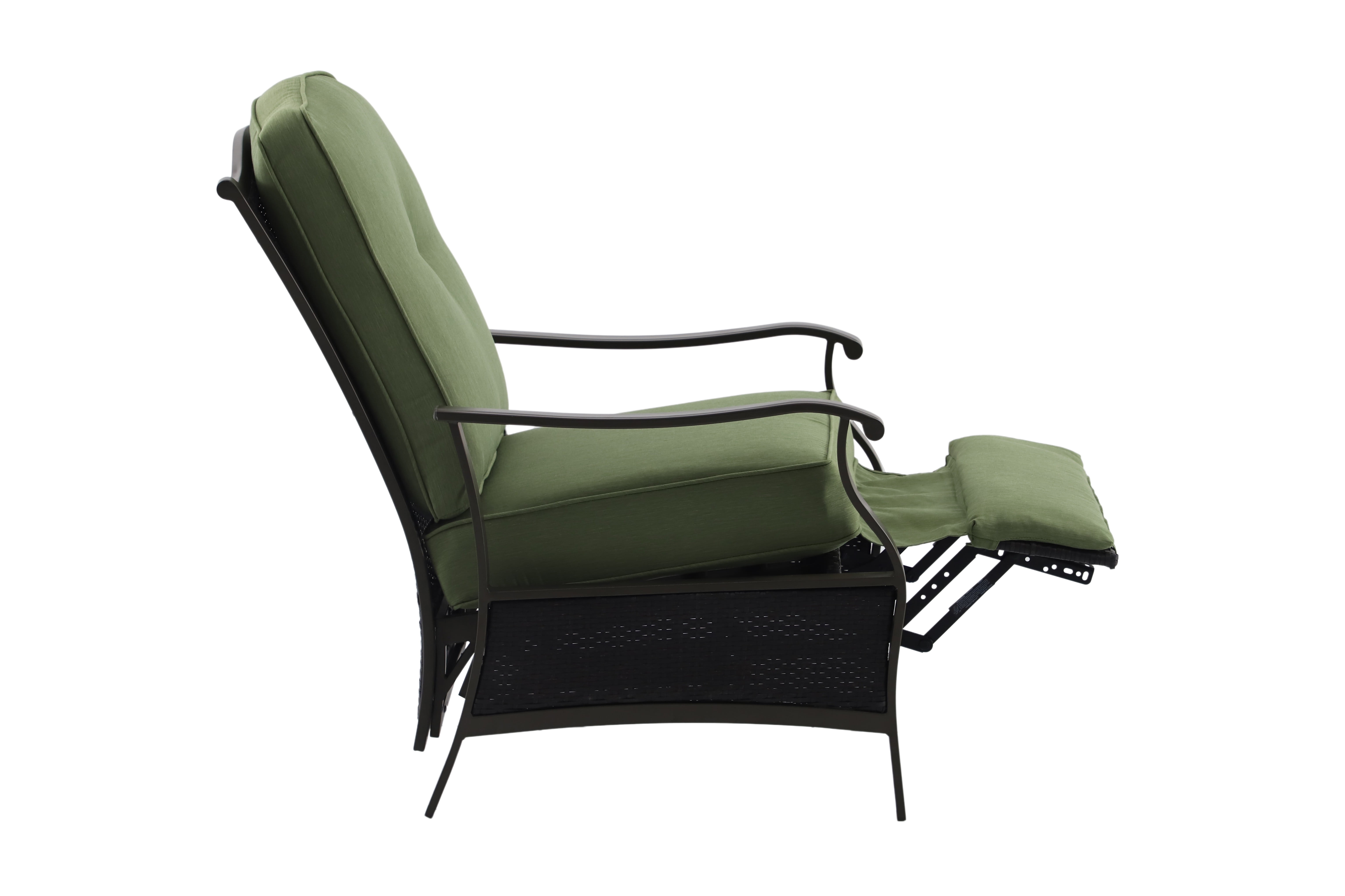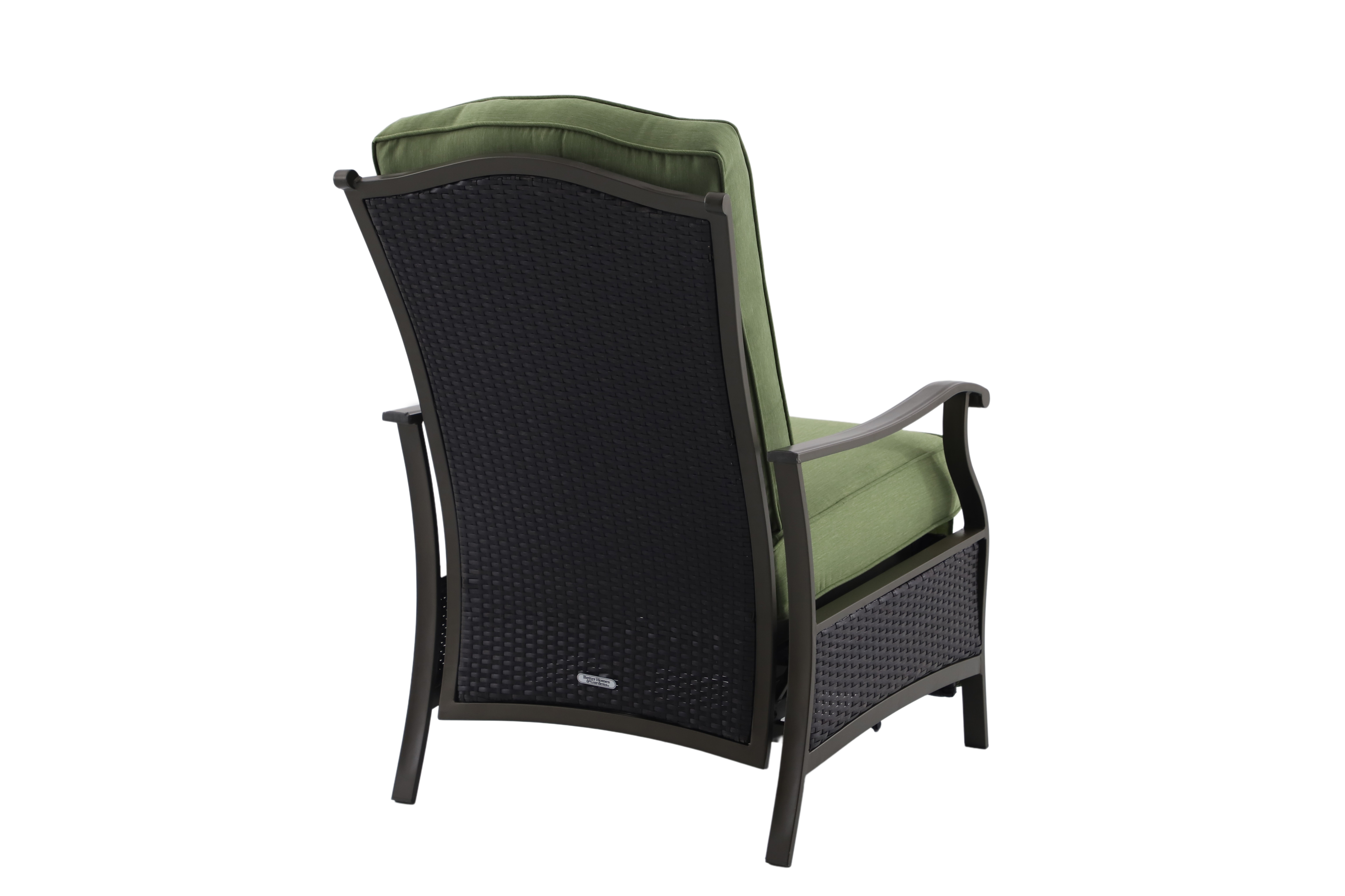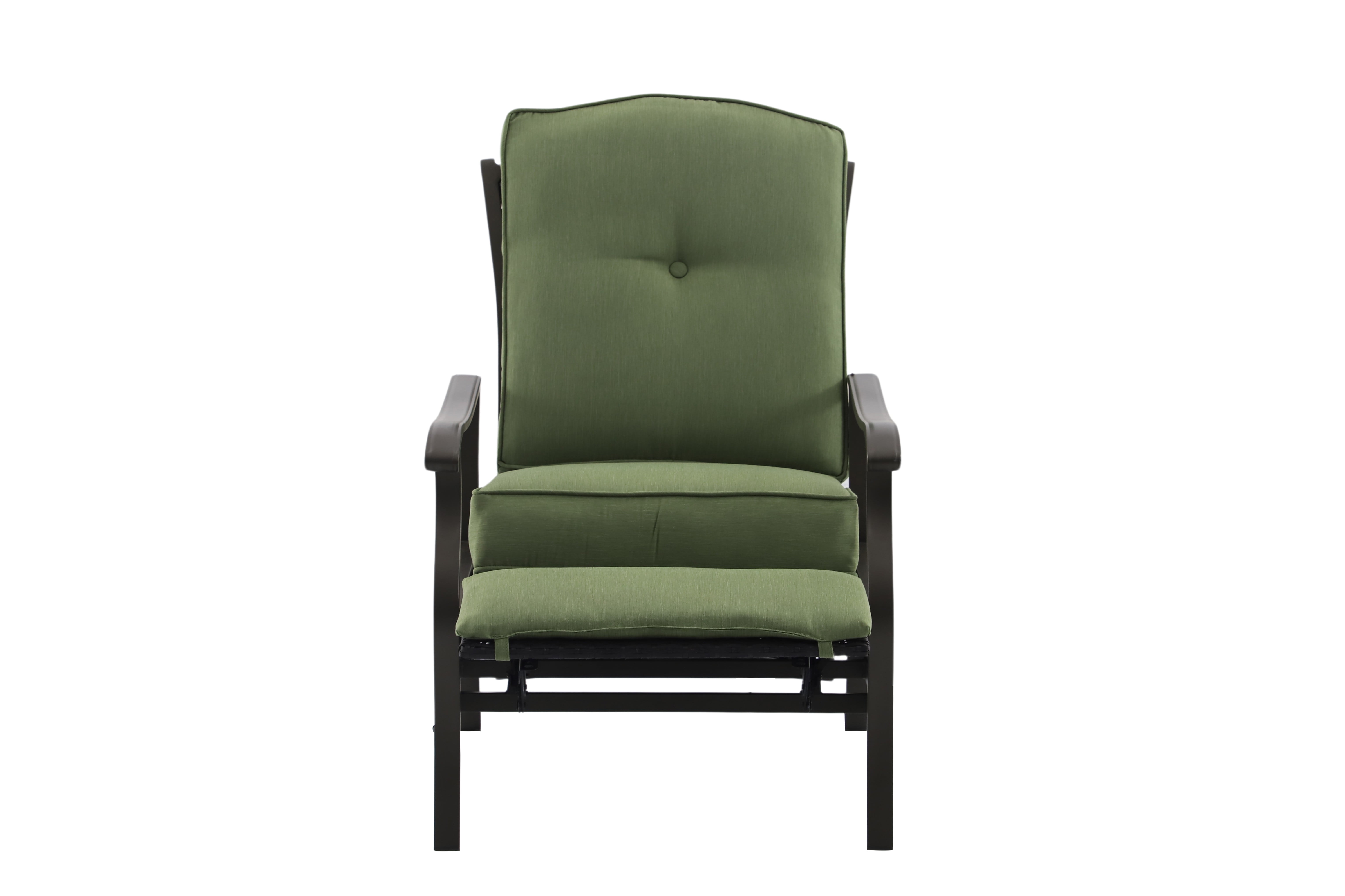 Create a serene and comfortable outdoor space with the Better Homes & Gardens Providence Steel Outdoor Recliner with Cushions, Green/Bronze. This recliner is perfect for unwinding and enjoying nature. The cushions are wrapped in green, fade-resistant, and moisture-wicking olefin fabric for ultimate comfort. The sturdy frame is made of powder-coated, rust-resistant steel with a bronze finish, and wicker accents add a touch of traditional style. This recliner is part of the Providence outdoor furniture collection and comes with assembly instructions. Relax, read, or have a pleasant conversation on the Providence Steel Outdoor Recliner, a cozy addition to any outdoor area.