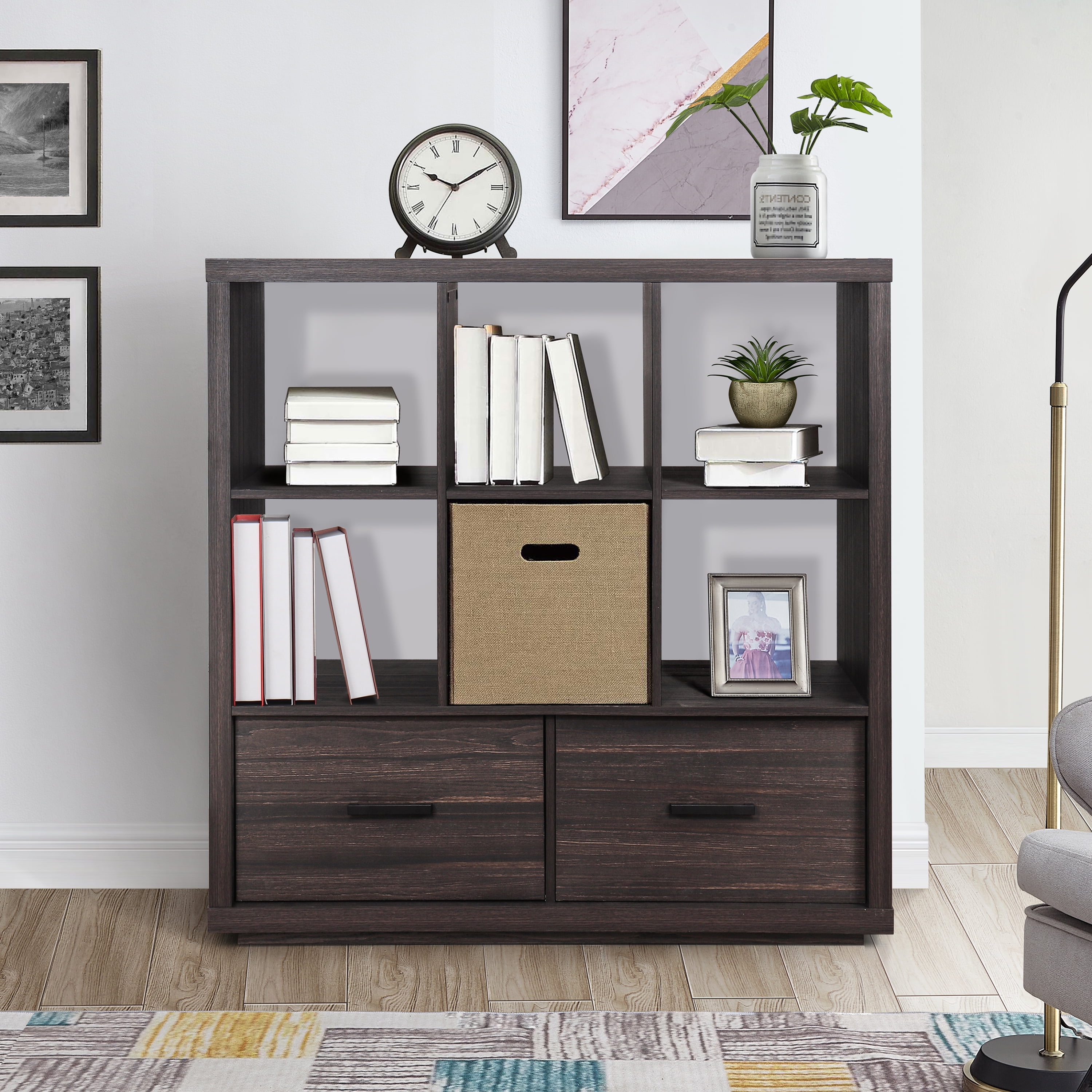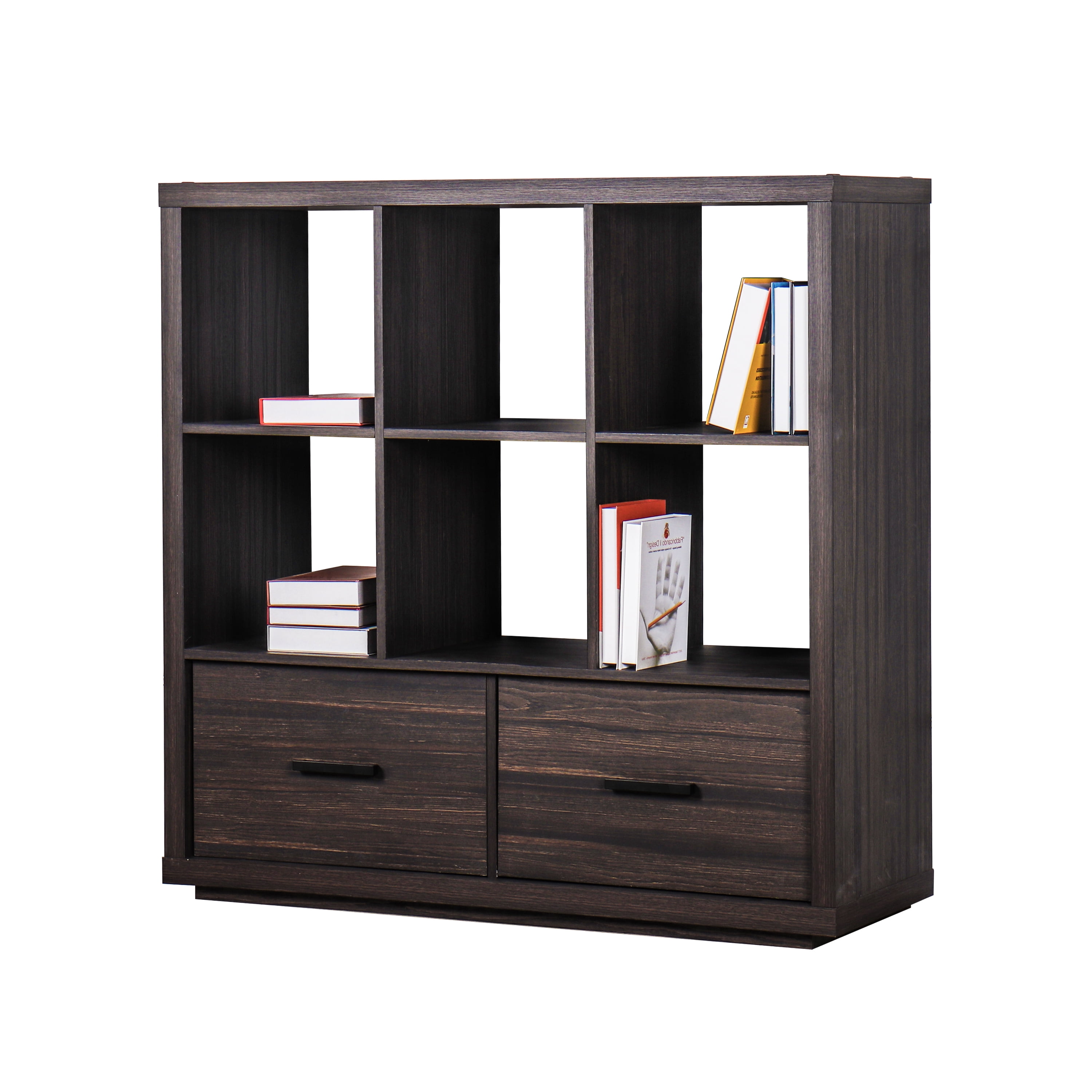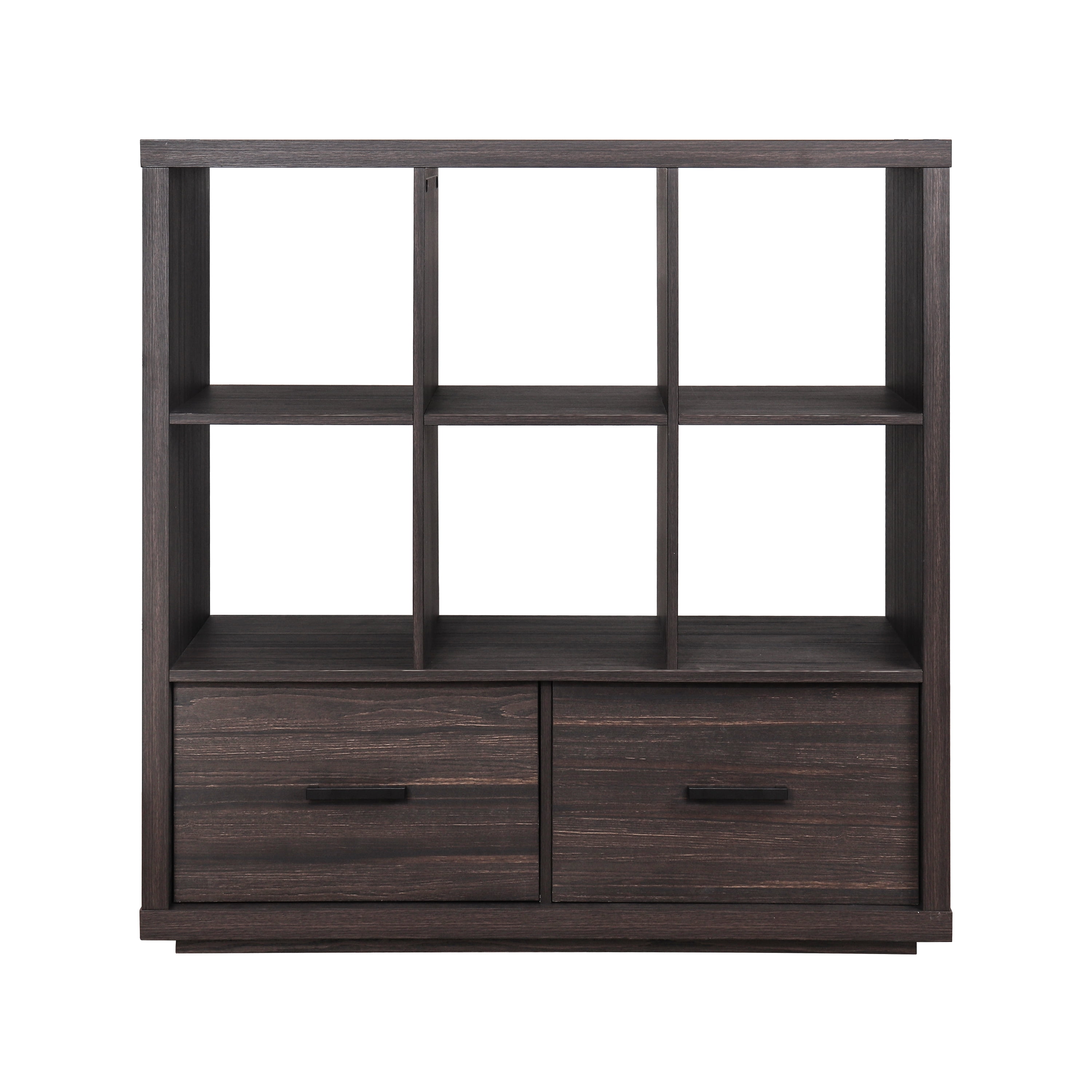 Better Homes & Gardens Steele 6 Cube Organizer with Drawer is the perfect addition to any space in your home. Stylish and contemporary shelves feature clean lines and a rich finish that will complement almost any decor. The open cube structure and two large storage drawers make it the ideal solution for all of your storage and display needs. Metal hardware with a black powder-coated finish adds a polished look to the bookshelves to brighten any room. Store any items you want unseen in the spacious drawers that feature drawer glides for easy opening and closing capabilities. You can maximize space in your home and add style to one. This Steele 6 Cube Organizer is perfect for storing your favorite books, cozy blankets and displaying your best photos and decor.
