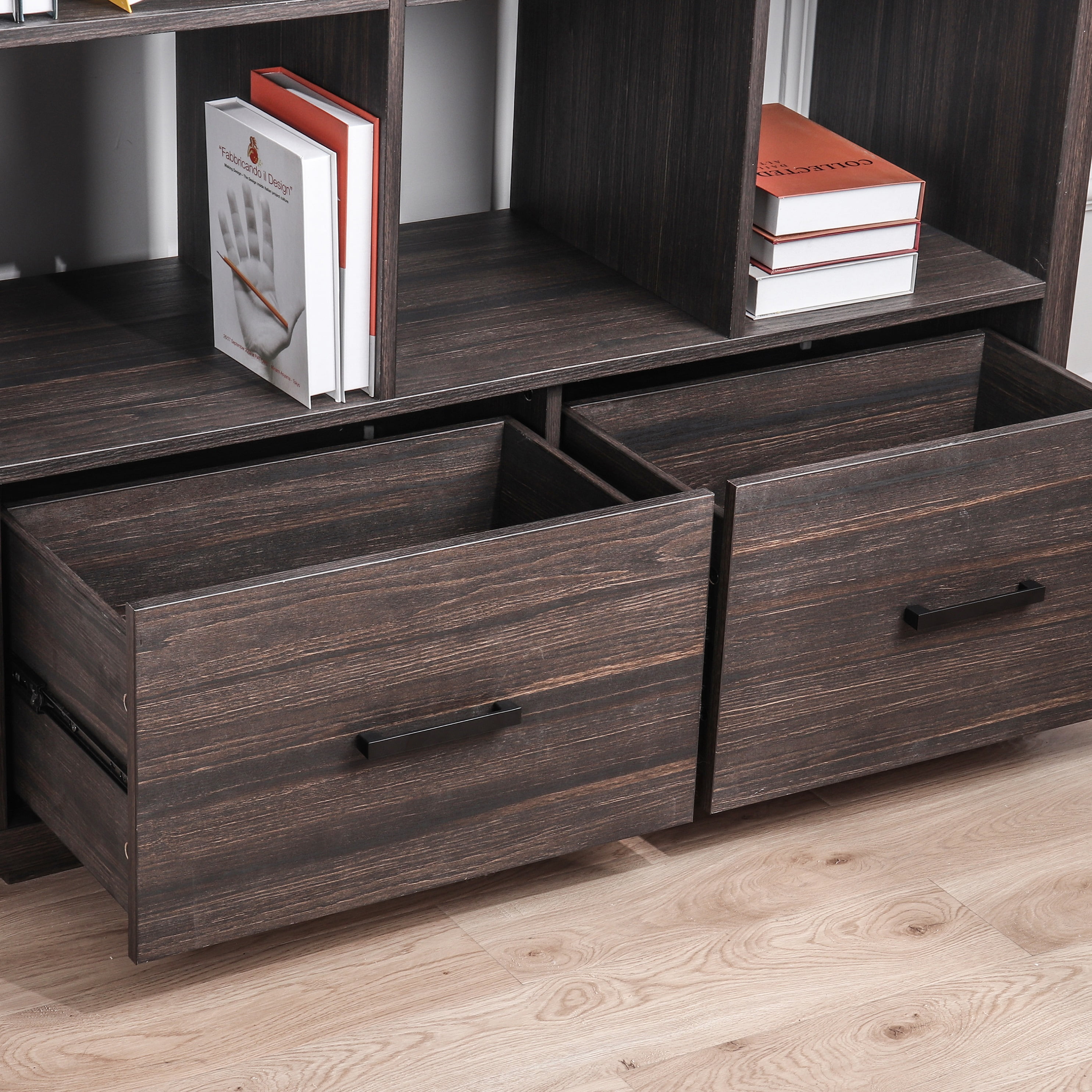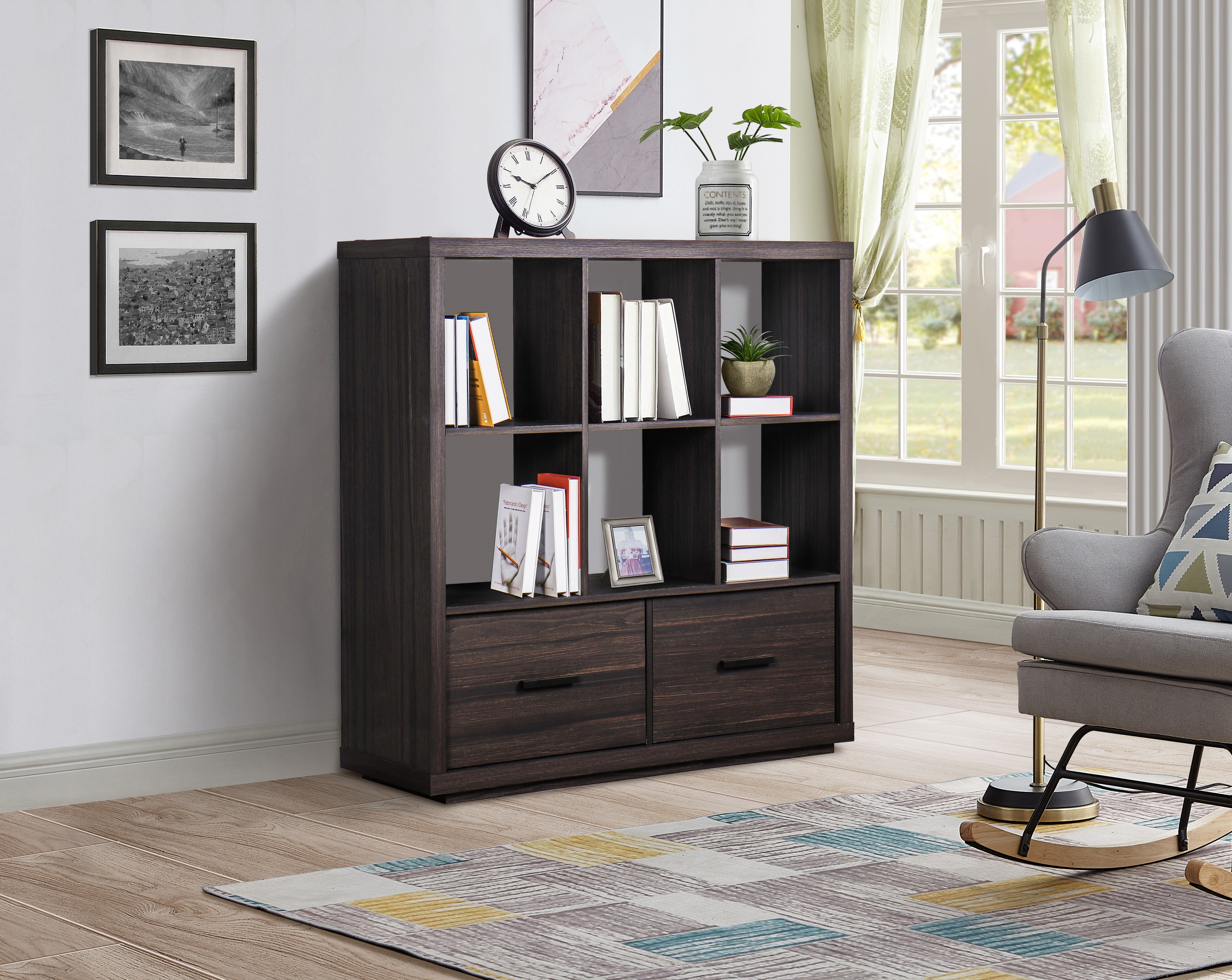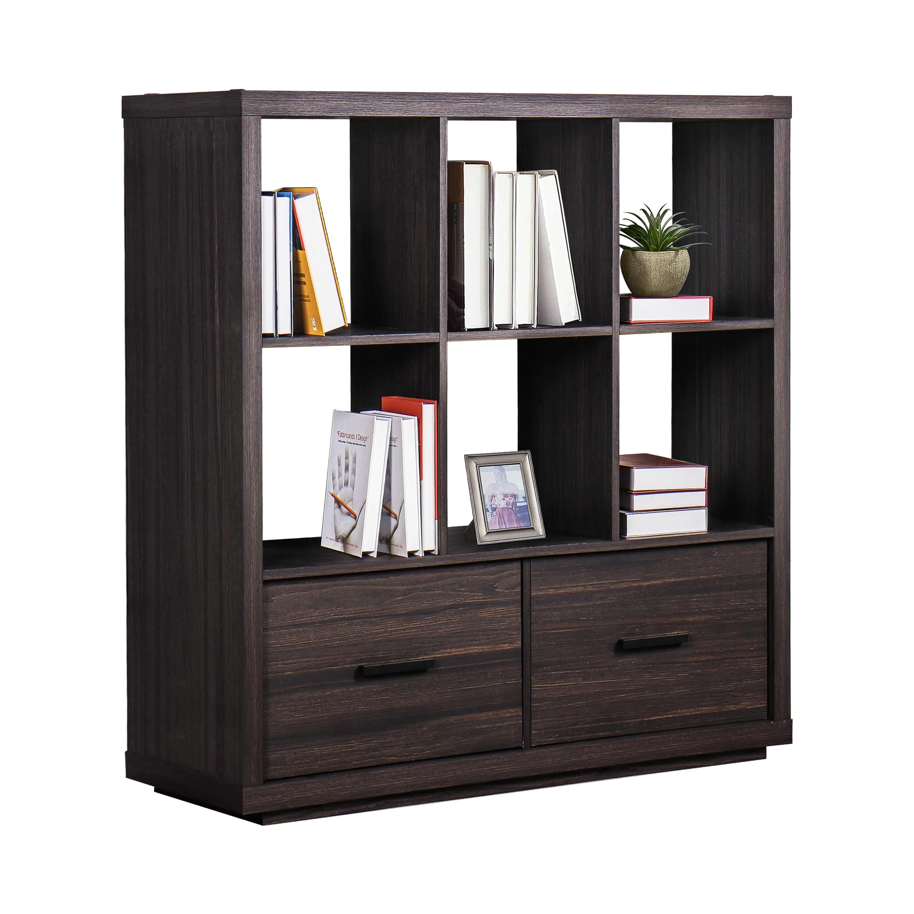 Better Homes & Gardens Steele 6 Cube Organizer with Drawer is the perfect addition to any space in your home. Stylish and contemporary shelves feature clean lines and a rich finish that will complement almost any decor. The open cube structure and two large storage drawers make it the ideal solution for all of your storage and display needs. Metal hardware with a black powder-coated finish adds a polished look to the bookshelves to brighten any room. Store any items you want unseen in the spacious drawers that feature drawer glides for easy opening and closing capabilities. You can maximize space in your home and add style to one. This Steele 6 Cube Organizer is perfect for storing your favorite books, cozy blankets and displaying your best photos and decor.