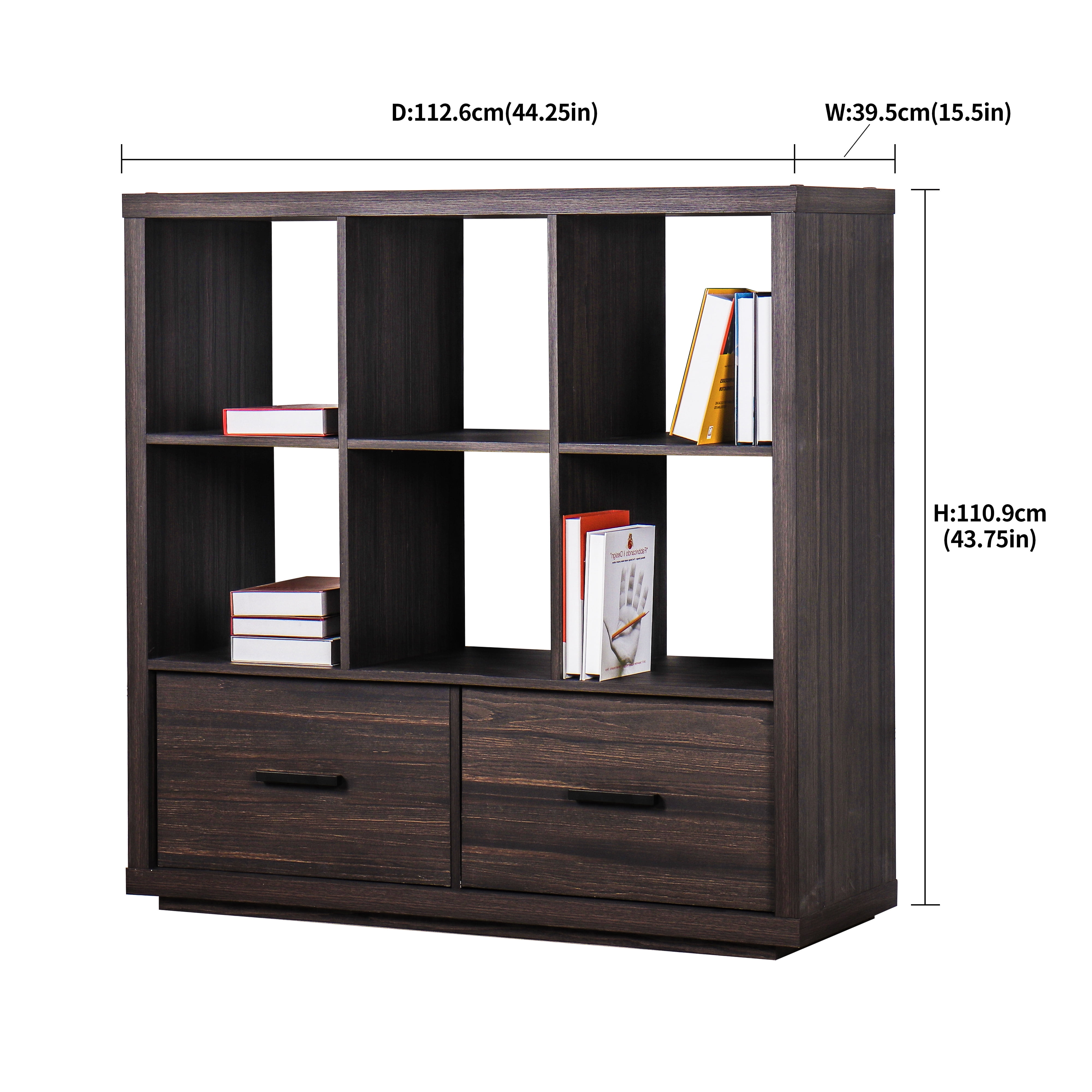 Stylish, contemporary shelves with an open cube structure provide ample storage and display options Coordinates with other items in the Better Homes & Gardens Steele collection Two large drawers allow you to store things out-of-sight N.W.: 48Kg/105.8lb G.W.: 54Kg/119lb Assemble Dimensions: 44.3″W*15.5″D*43.6″H/112.4W*39.4D*111.1H CM Accommodates most Better Homes & Gardens collapsible fabric bins ( Sold separately) Packaging dimensions: 48.8″W*19.3″D*14.8″H/124*49*37.6H CM Color: Tobacco Oak Full-extension metal drawer glides provide added support Easy to assemble