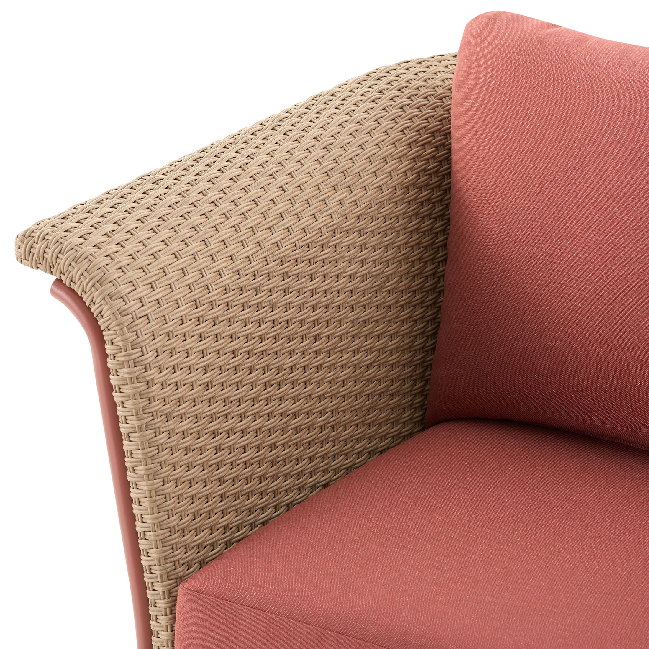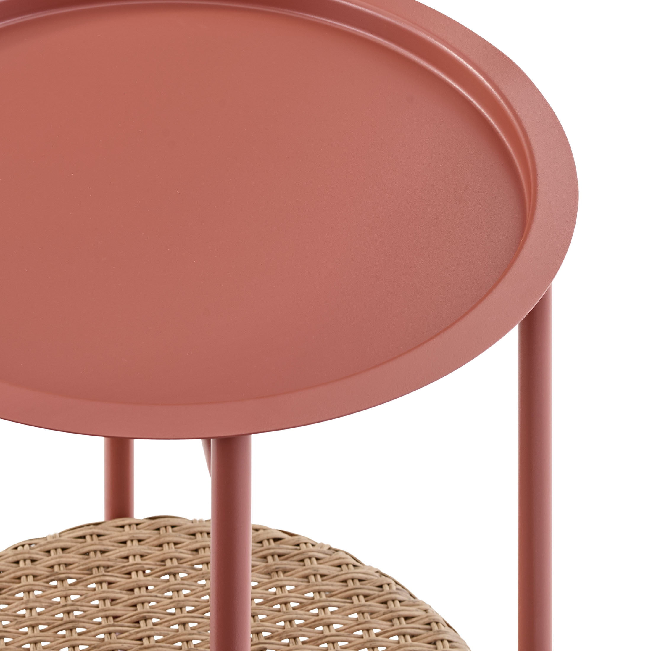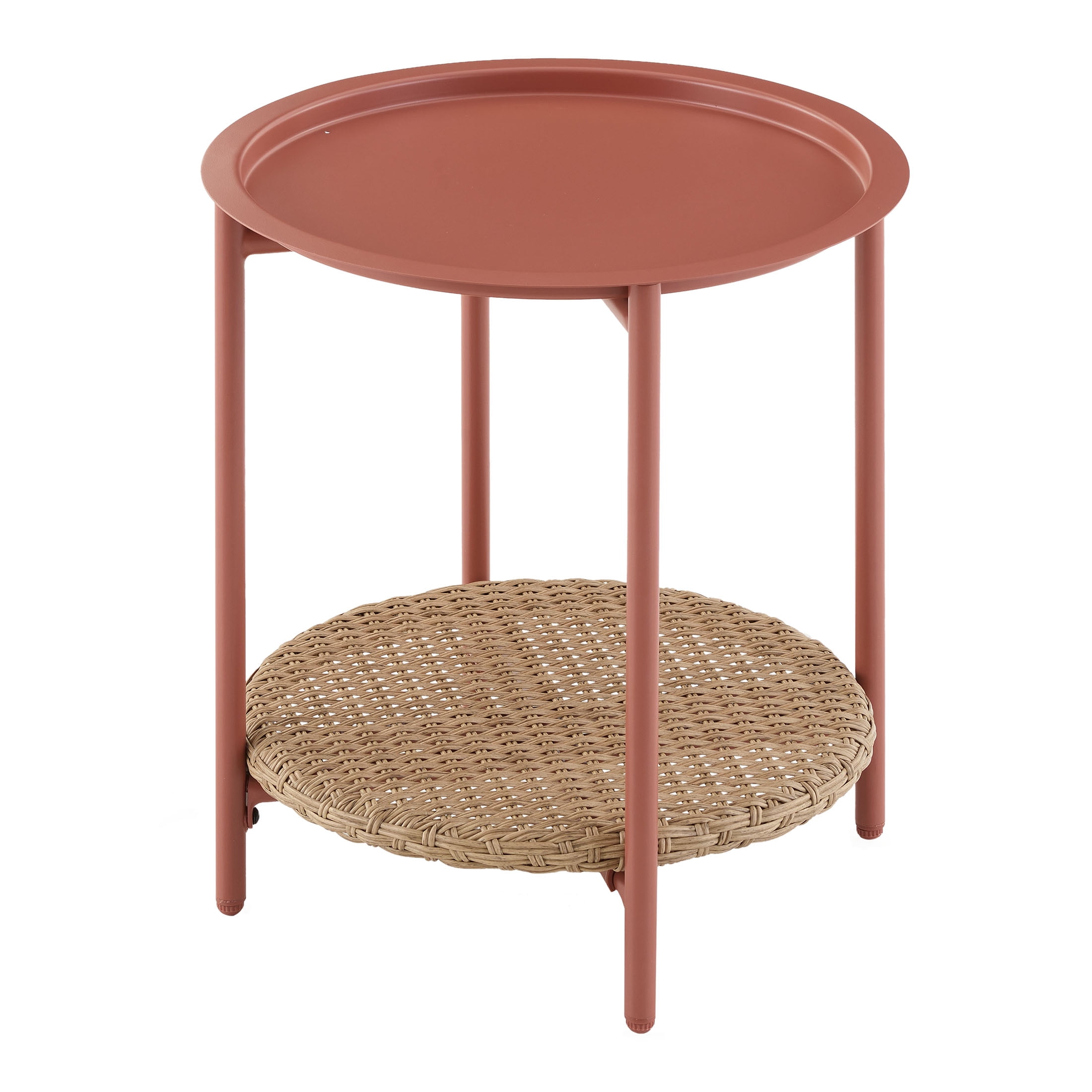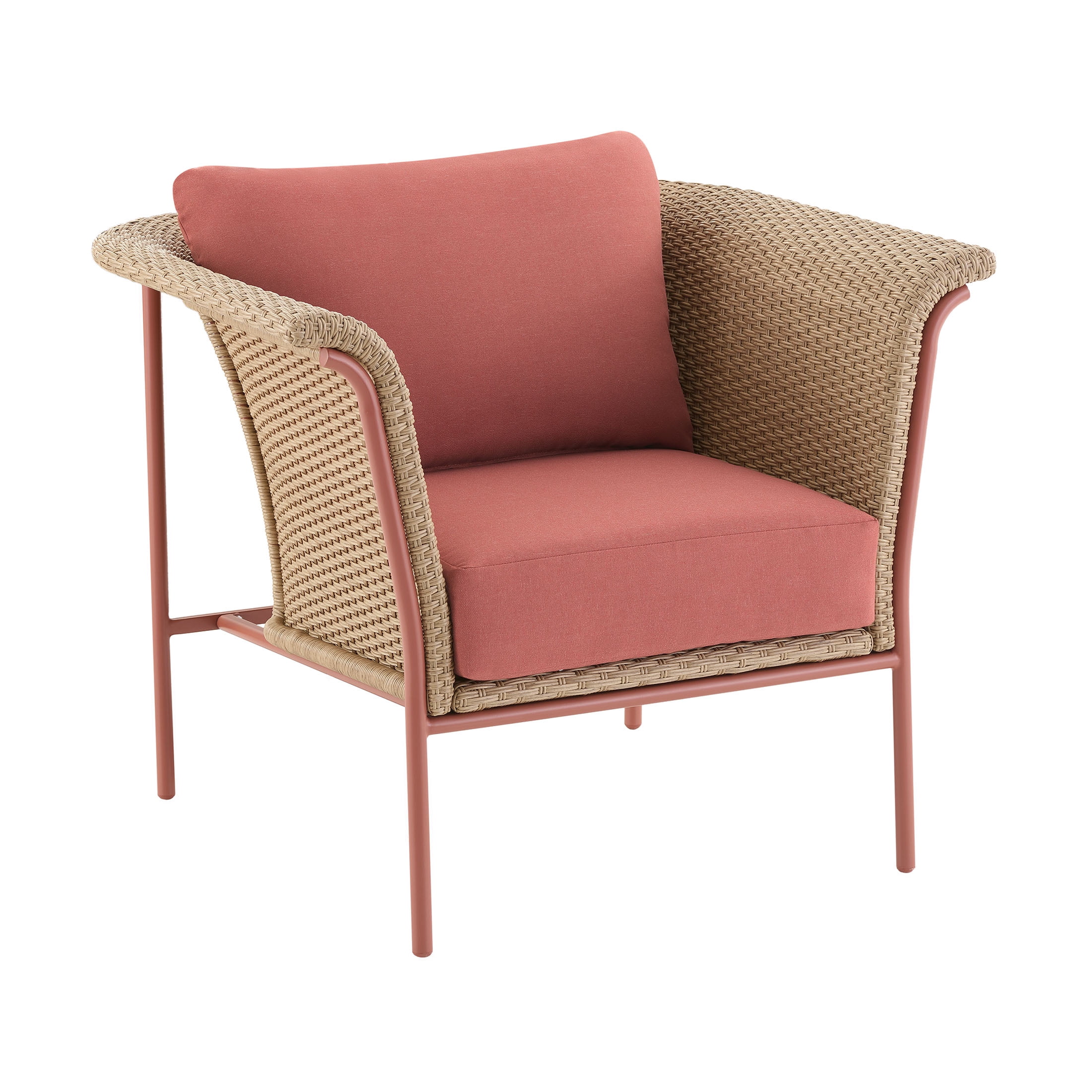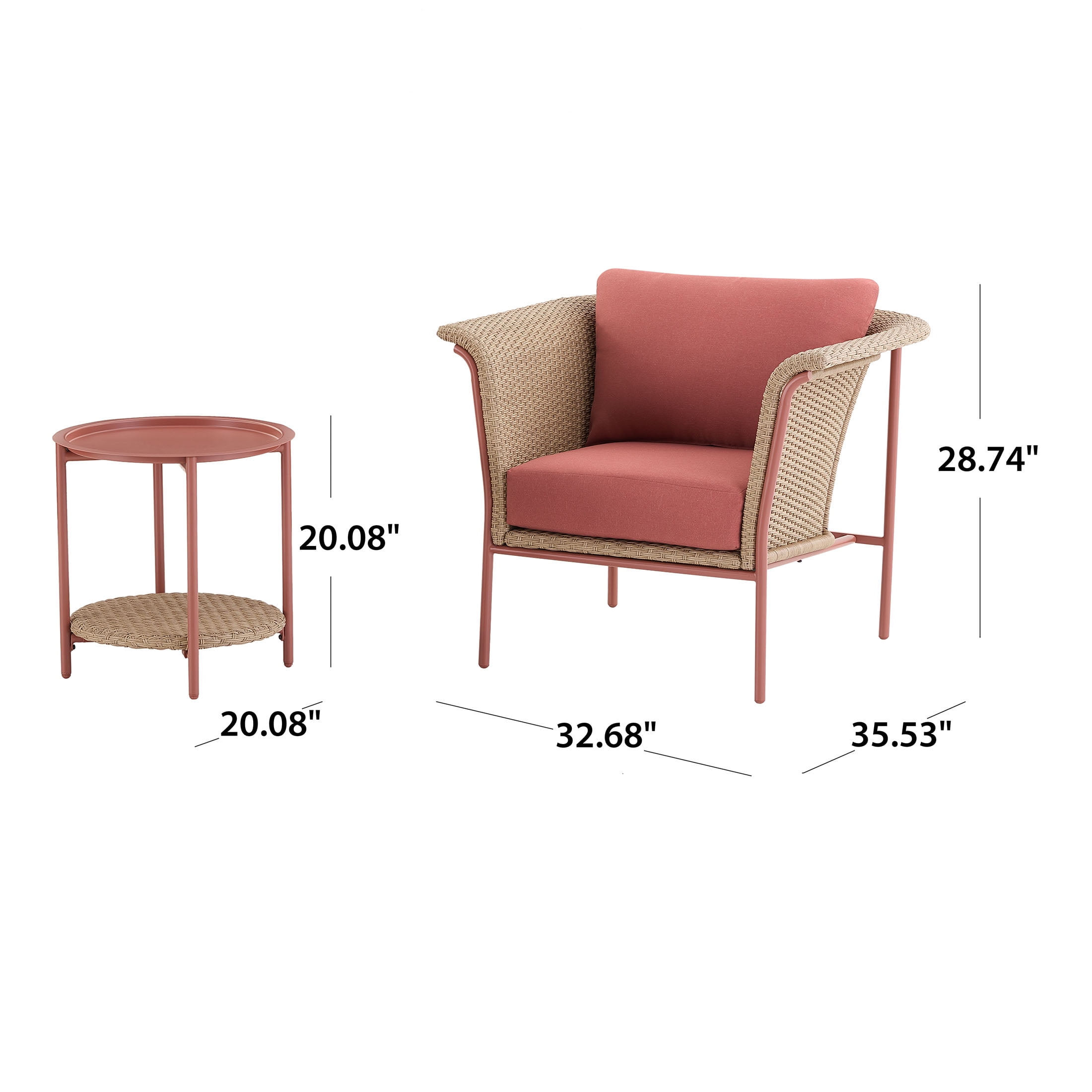 Outdoor, steel and wicker chat set with cushions ideal for conversation and relaxation Includes 2 cushioned armchairs with low-back design and one round bistro table with a lower display shelf Soft cushions and sturdy frame with wicker wrapping crafted with weather-resistant materials for all-season durability Features low-back design with terra cotta red frames and cushions and coordinating tan wicker to complement almost any outdoor furniture and decor