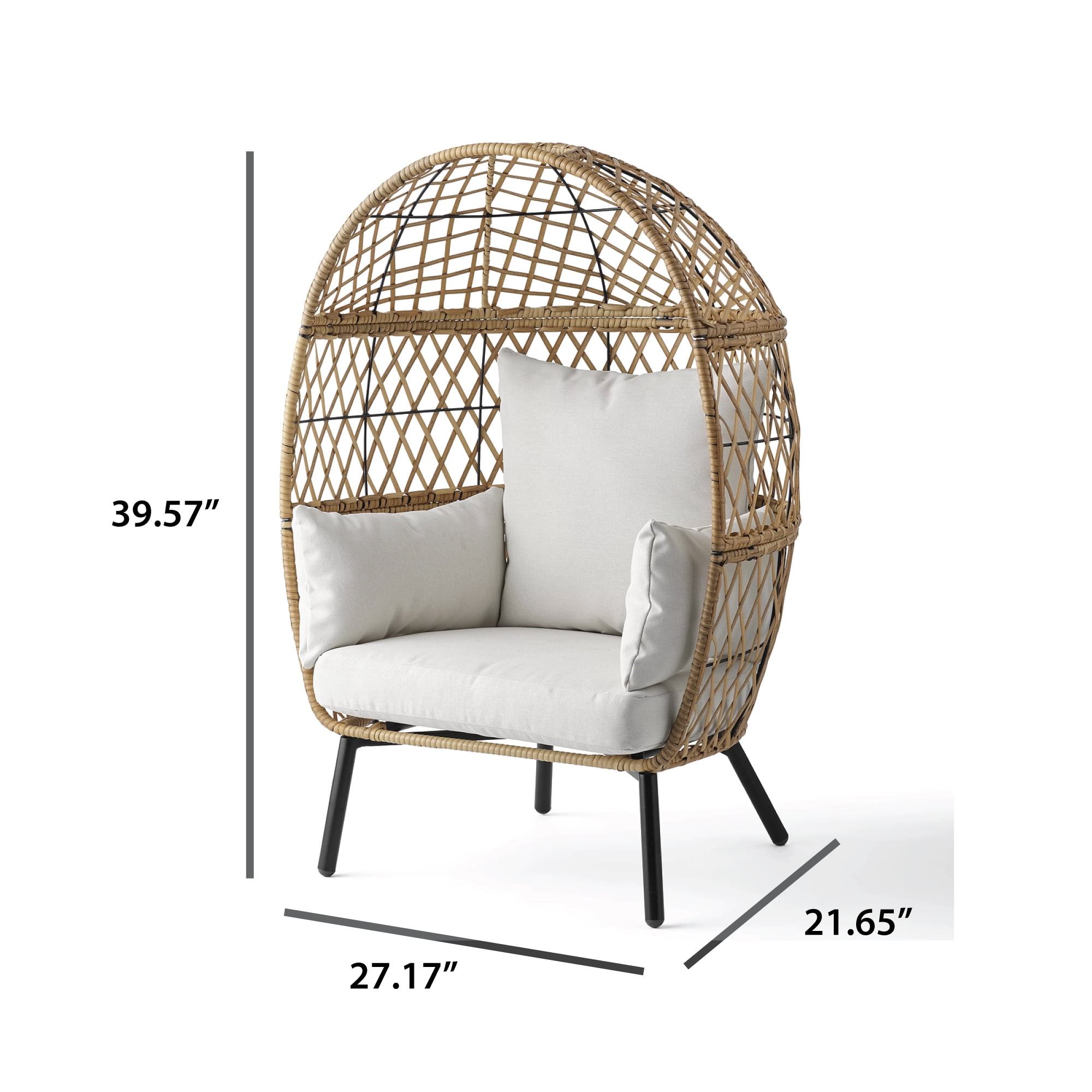 Wicker accented stationary kid’s egg chair gives your little one a special place of their own to sit on your patio, porch, lanai, garden, or back yard Soft cushions covered in durable solution dyed 100% polyester fabric Seat cushions filled with 60% polyester fiber batting and 40% polyurethane foam Back cushions filled with 81% polyester fiber and 19% polyester fiber batting Cushions attach with durable ties Rust resistant metal frame Wipe clean with a damp cloth. Air dry. Do not use bleach or solvent. Furniture cover recommended. Weight capacity: 250 lbs. Coordinating neutral tones match almost any outdoor decor style 1 part of the Better Homes & Gardens Ventura outdoor furniture collection (other pieces sold separately) Chair dimensions: 21.65″ x 27.17″ x 39.57″ Chair weight: 17.55 lbs. Available in Neutral, Pink, and Grey Arrives in 1 box Shipping dimensions: 25″ x 29.75″ x 12.5″; 26.7 lbs.