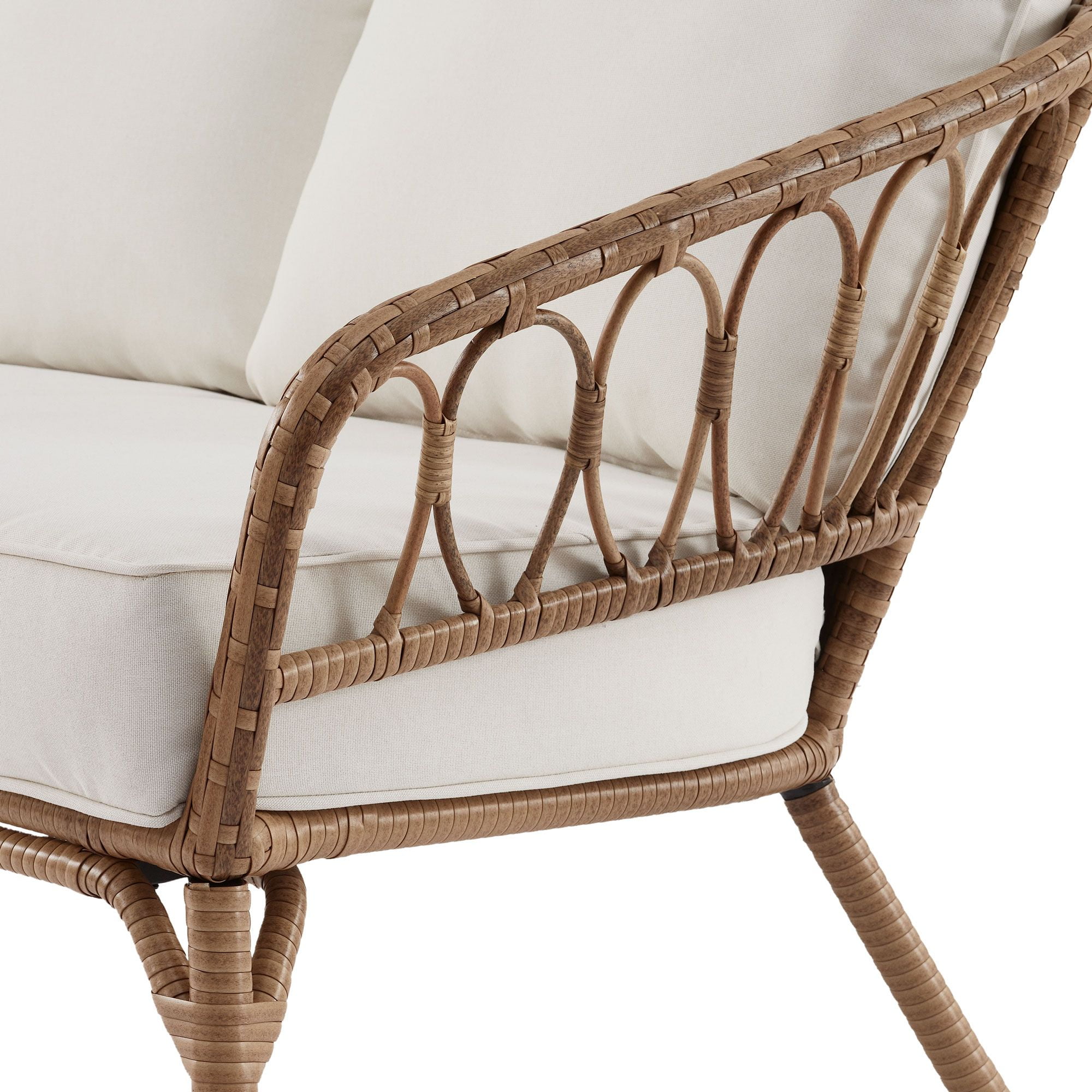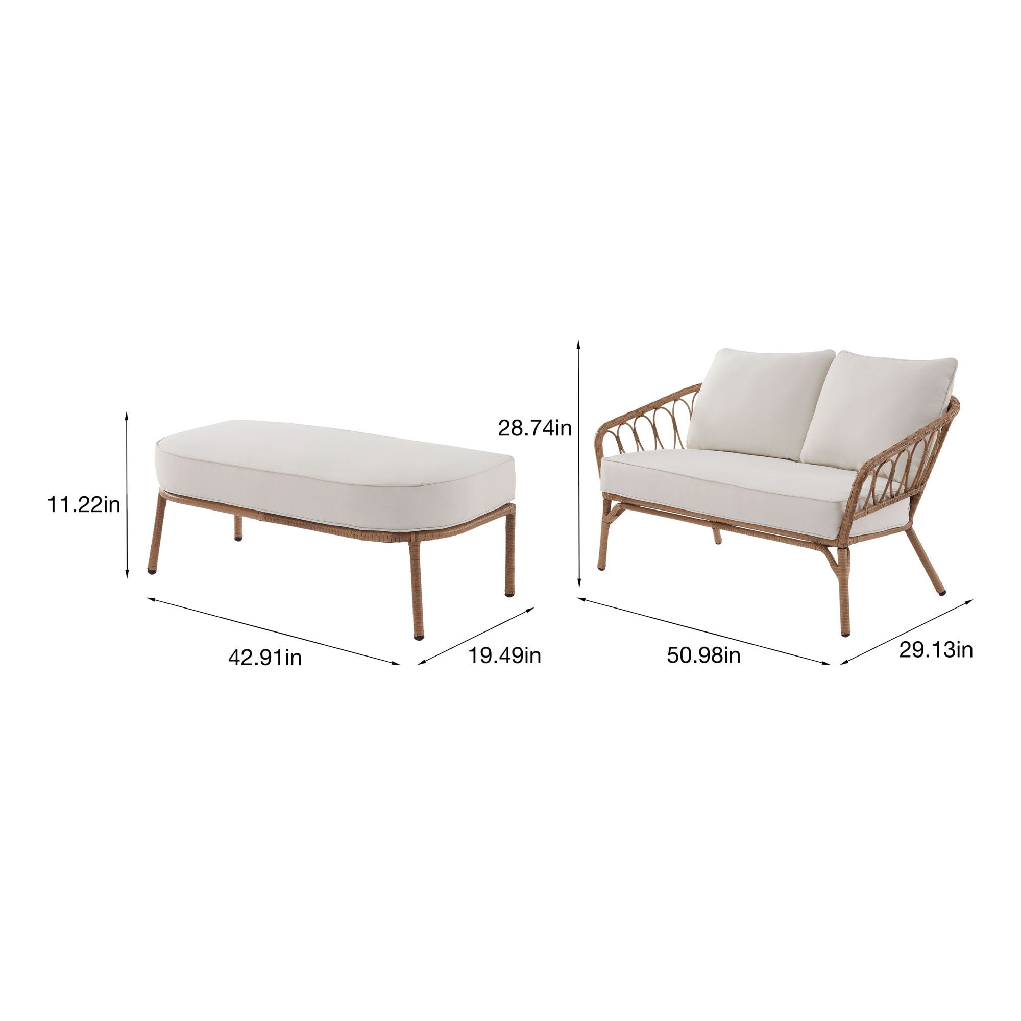 Better Homes & Gardens Willow Sage All-Weather Wicker Outdoor Loveseat and Ottoman Set, Beige Set includes 1 loveseat and 1 ottoman Brown steel frame is e-coated and powder-coated to resist rusting, staining, and peeling in any weather Handwoven, all-weather wicker details Easy to clean 3M Scotchgard™ treated solution-dyed polyester fabric Loveseat supports up to 450 lbs. and ottoman supports up to 225 lbs. Recommended for outdoor use Care: Clean with a soft cloth and mild soap Assembled product dimensions: loveseat, 29.13″ x 50.98″ x 28.74″; ottoman, 42.91″ x 19.49″ x 11.22″ Package dimensions: 53.15″ x 29.53″ x 19.29″, 68.31 lbs. Easy assembly required Product weight: loveseat, 37.22 lbs. Product materials: Steel, wicker, solution-dyed polyester Color: Beige Model # BHD336157386305 Better Homes & Gardens Willow Sage All-Weather Wicker Outdoor Loveseat and Ottoman Set, Beige