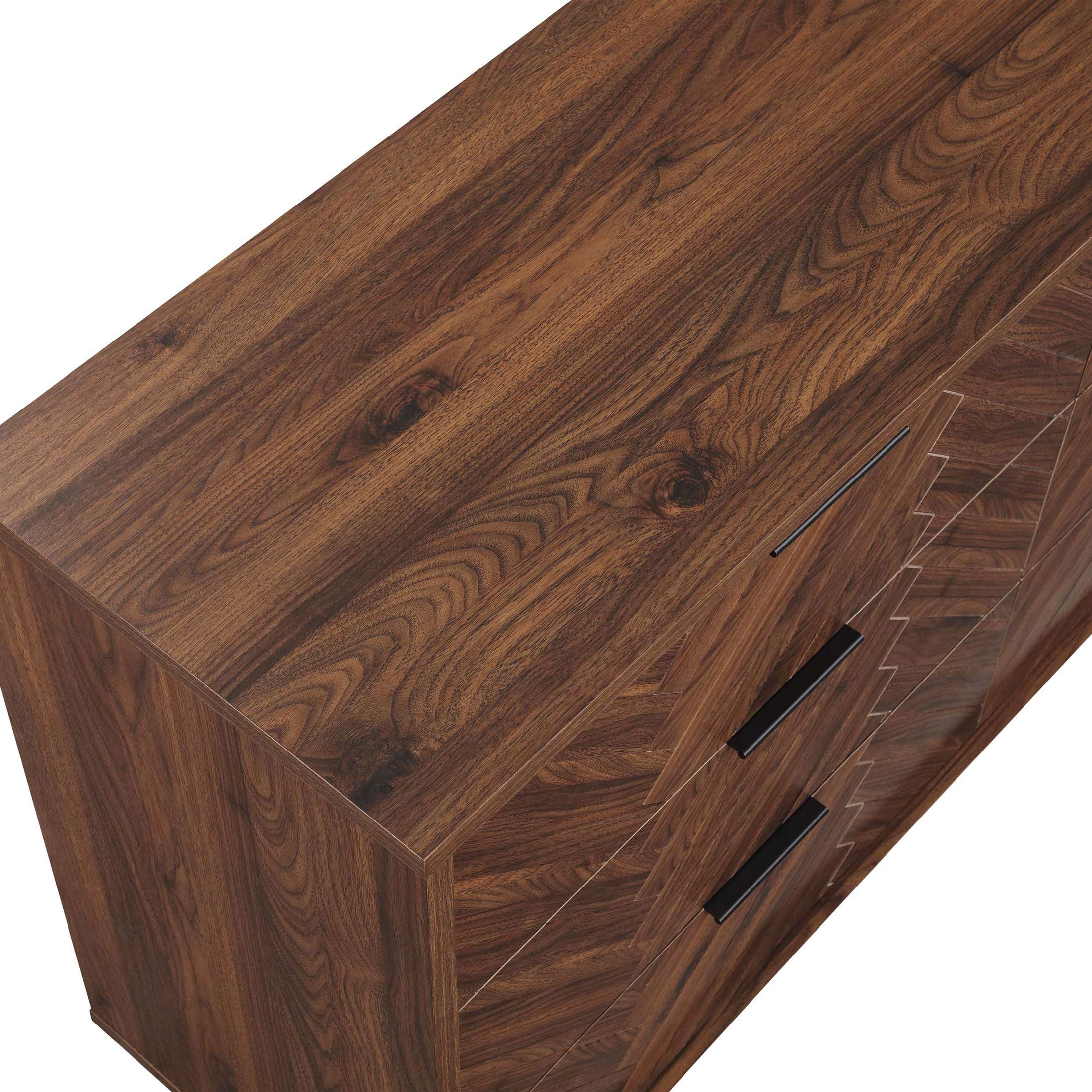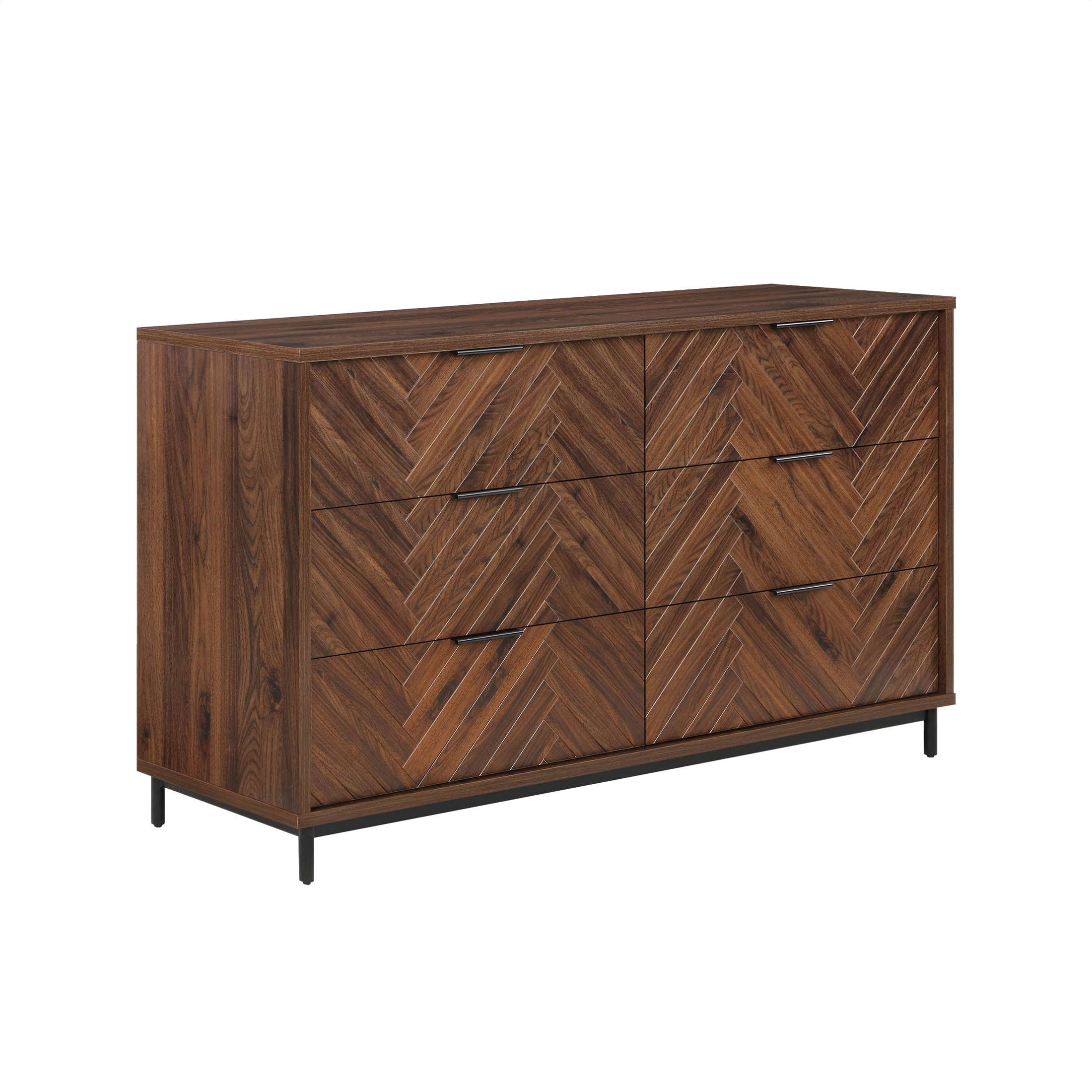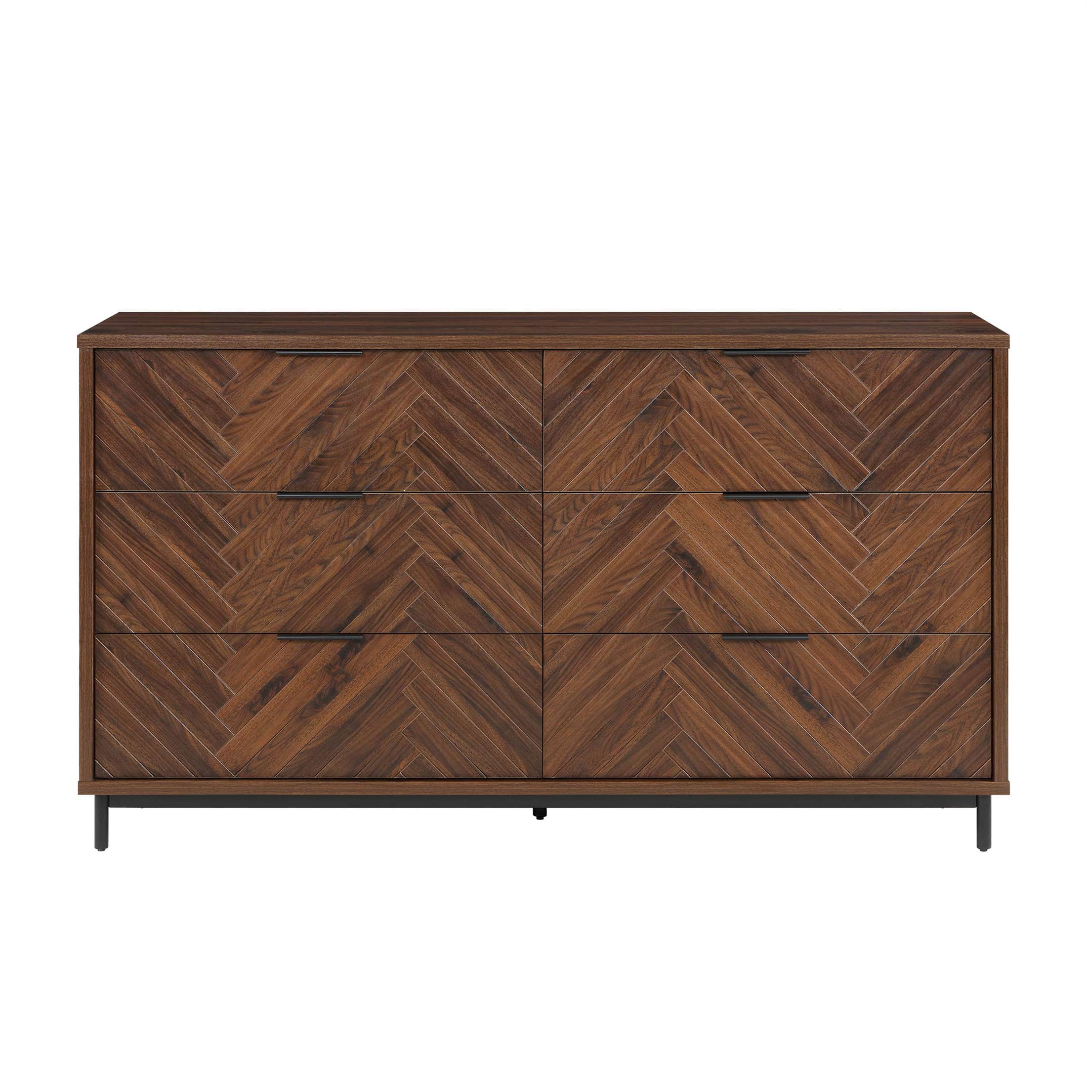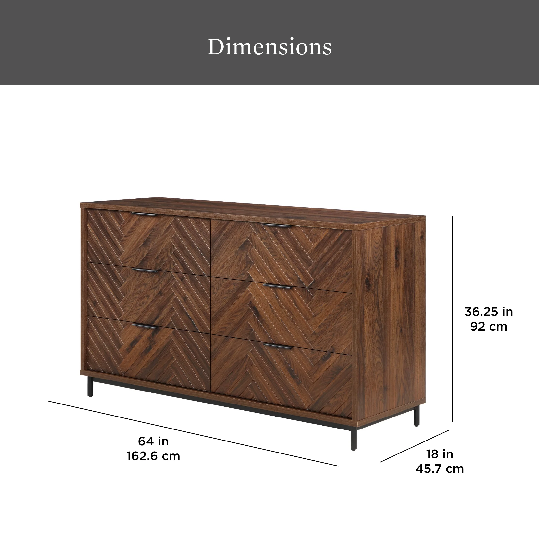 6 spacious storage drawers Stylish herringbone pattern drawer fronts Soft-closing, ball-bearing drawer glides Sleek, modern finger pull drawer handles Walnut brown finish Anti-tipping hardware included Assembly required Dimensions: 64 in W x 18 in D x 36.25 in (162.6 cm x 45.7 cm x 92 cm) Box 1 Packaging Dimensions: 69.125 in x 22.25 in x 8.25 in Box 2 Packaging Dimensions: 35.75 in x 23.75 in x 11.875 in Model: BHF336158813016