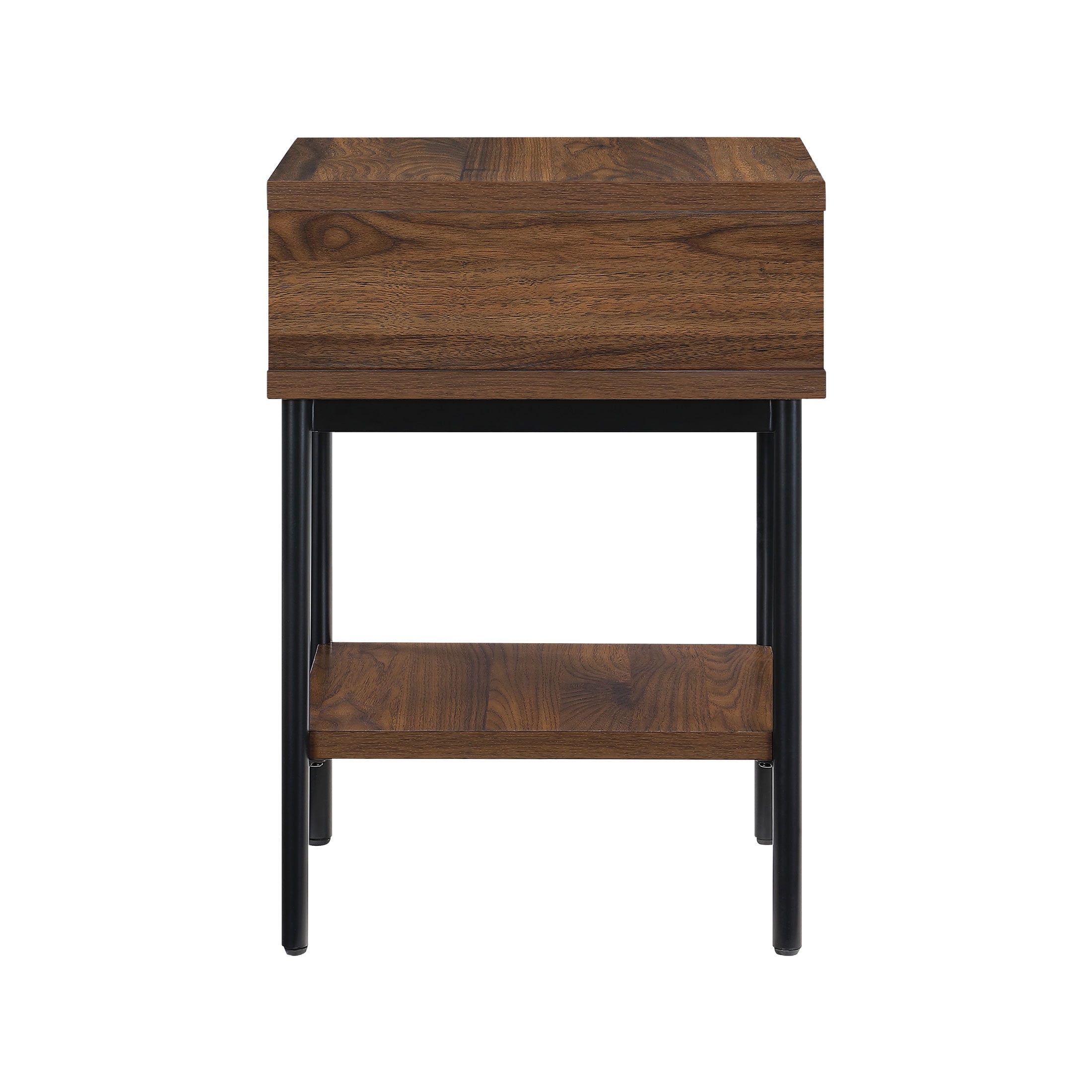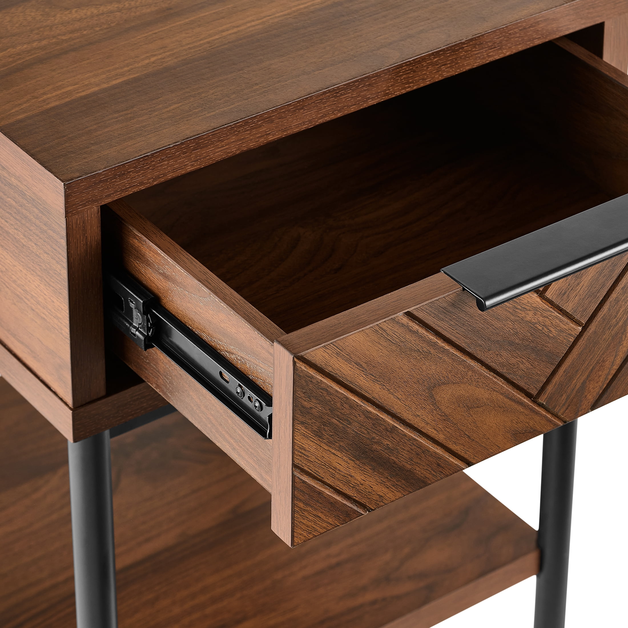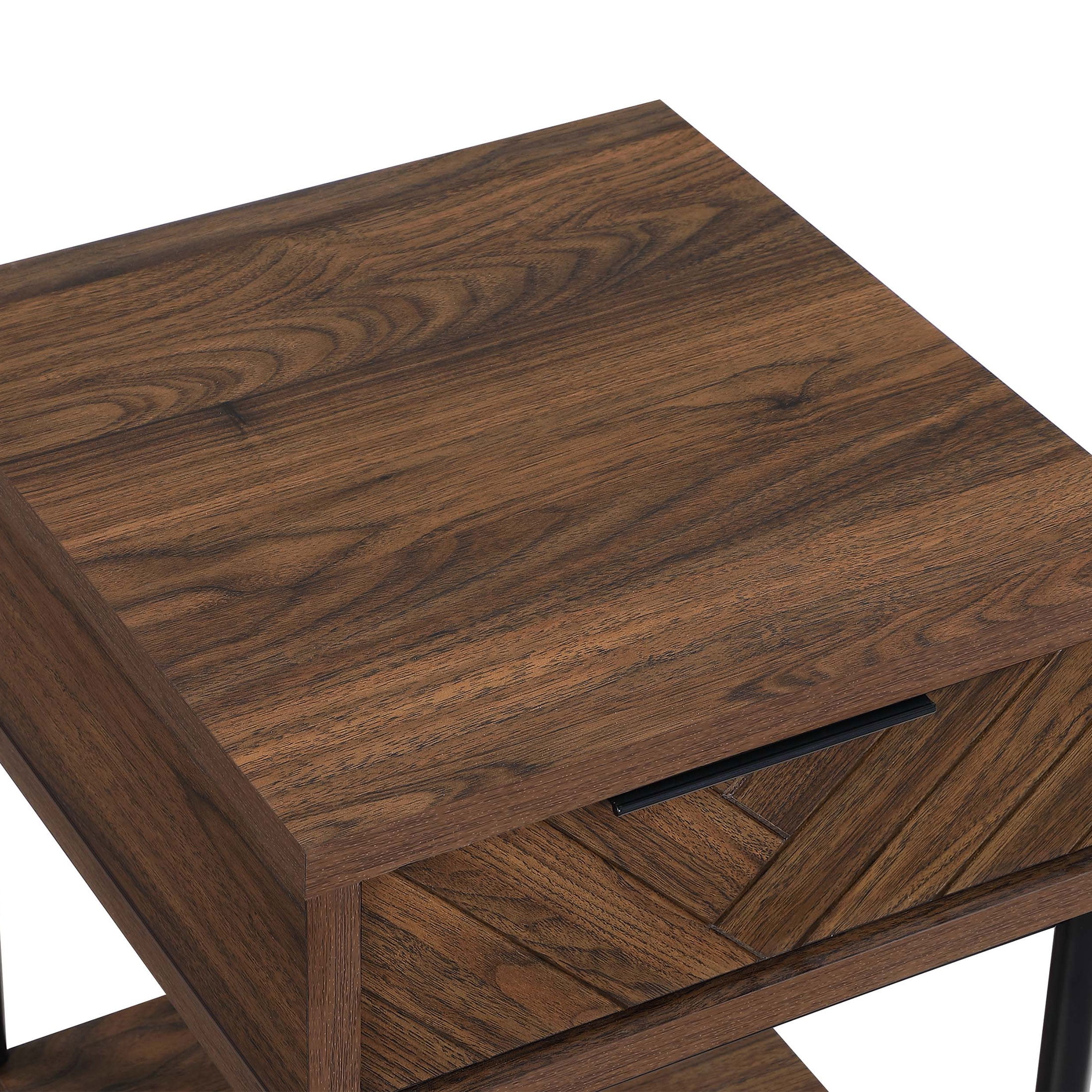 Upper storage drawer for stowing remotes or other small accessories Large open lower shelf Spacious tabletop for conveniently placing remotes, books, or beverages Stylish herringbone pattern drawer fronts Soft-closing, ball-bearing drawer glides Sleek, modern finger pull drawer handles Black metal legs Walnut brown finish Pair with other items from the Better Homes & Gardens Wyatt Collection (Sold Separately) Assembly required Dimensions: 17 in x 18 in x 25.25 in (43.2 cm x 45.7 cm x 64.1 cm) Packaging Dimensions: 22.5 in x 20.375 in x 13.5 in Model# BH1425004710002
