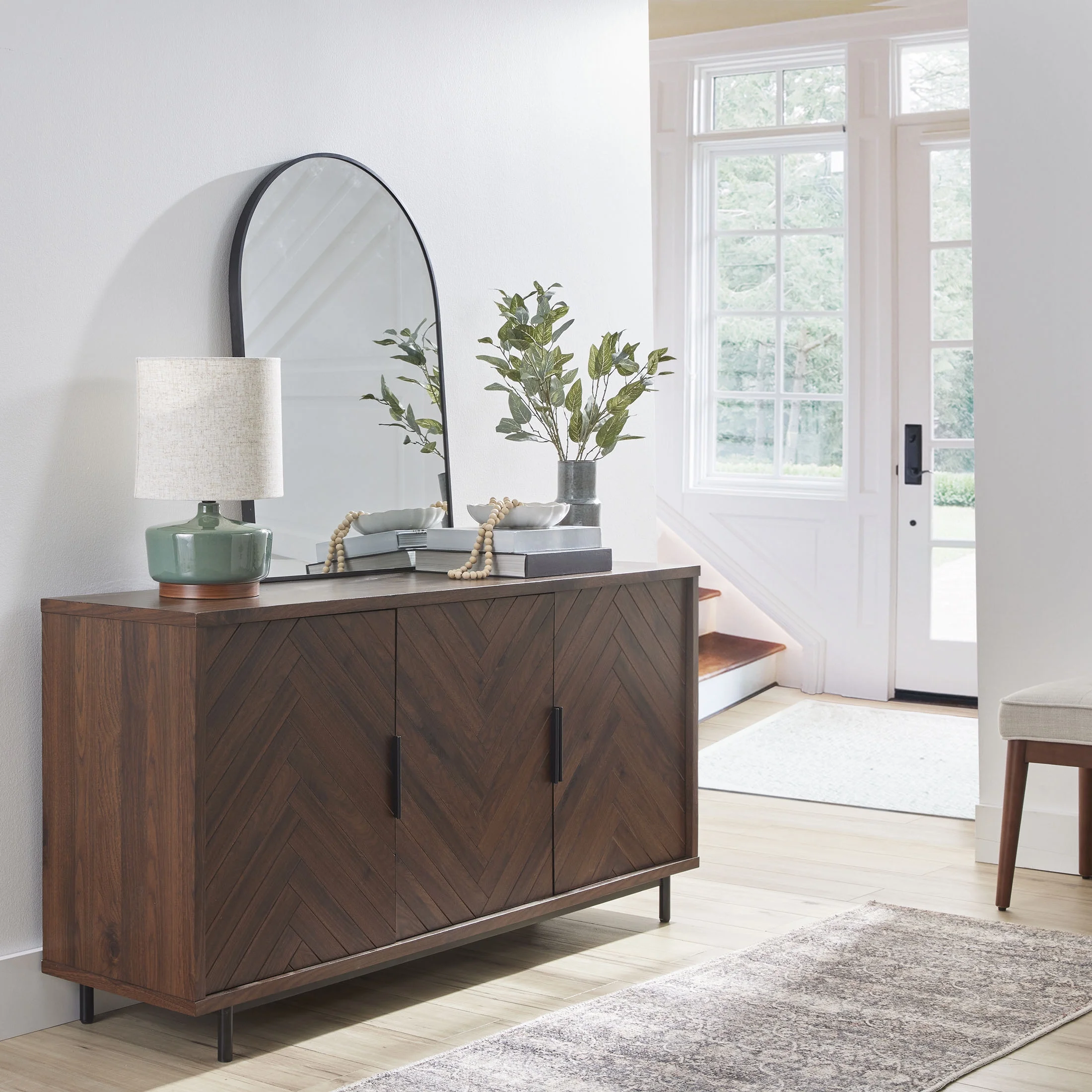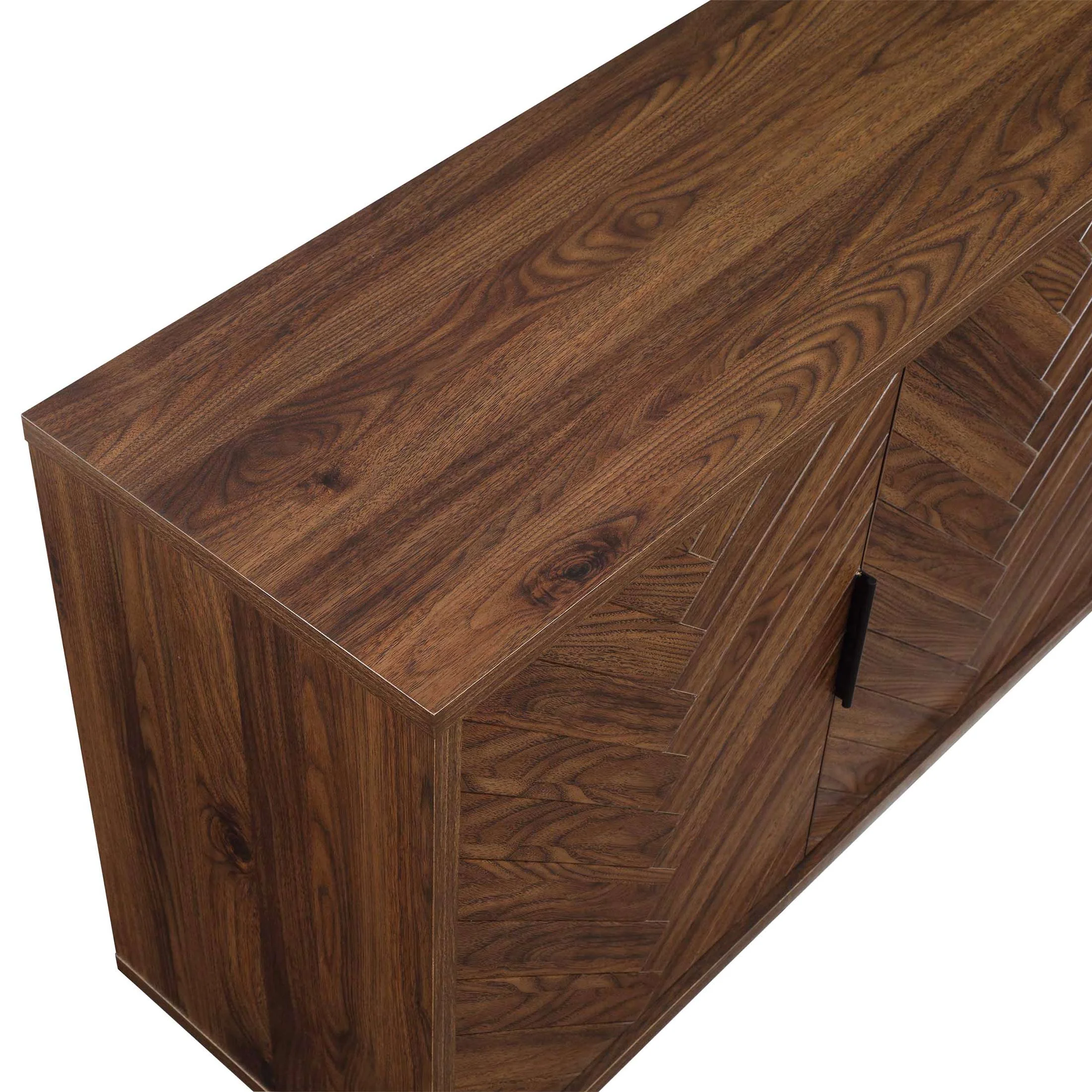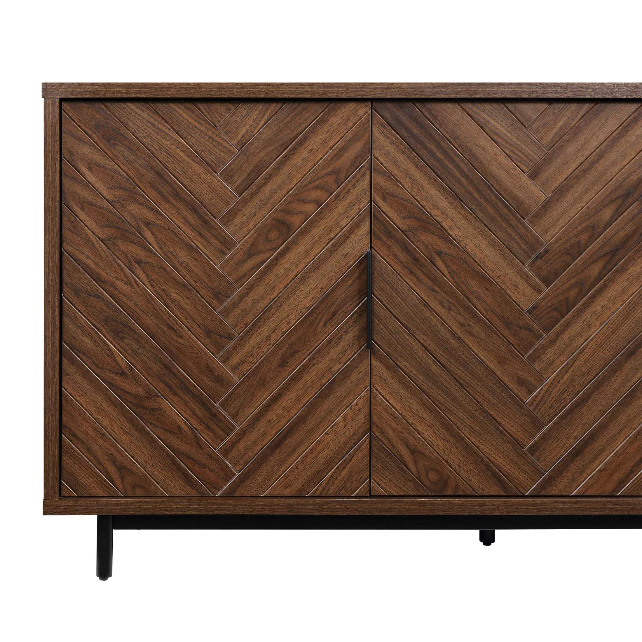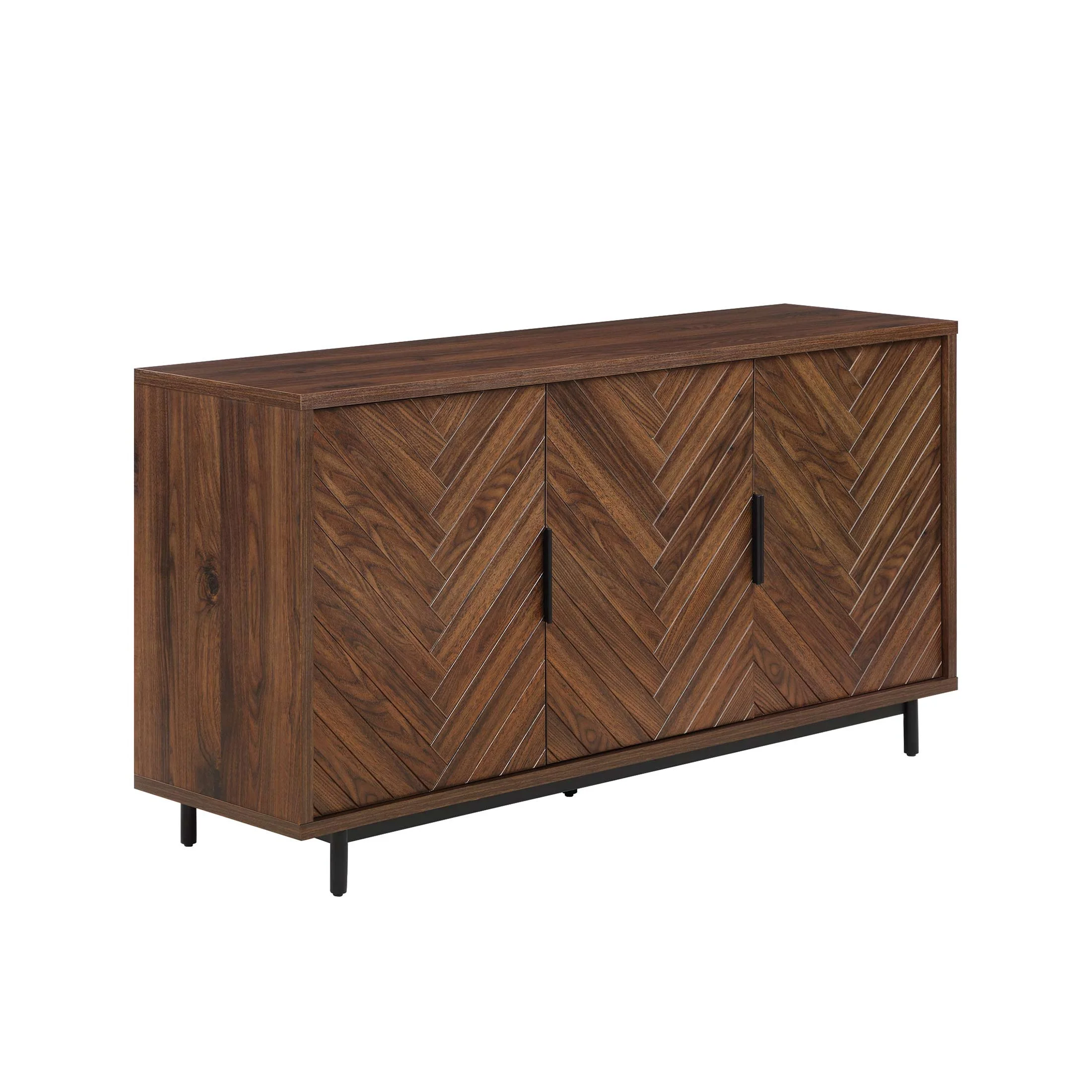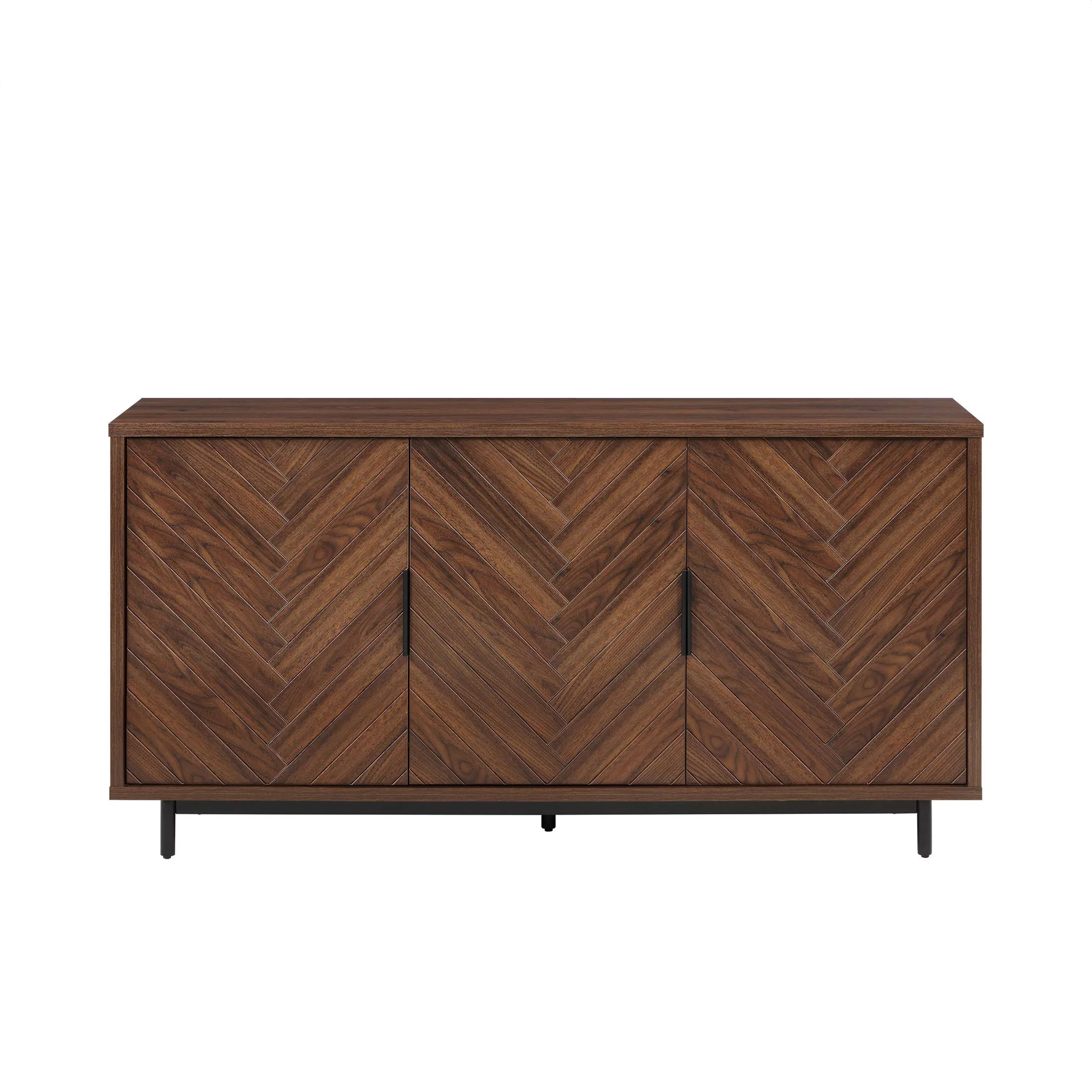 Fits most flat panel TVs up to 70 inch 3 spacious cabinets with adjustable shelves Herringbone pattern cabinet door fronts Matte black metal door handles with gun metal finish Soft closing euro-style hinges Multi-purpose storage solution can be used as a media console, accent cabinet or dining buffet Cable management cutaways Assembly required Dimensions: 59.5 in W x 15.9 in D x 30.25 in H (151.1 cm x 40.4 cm x 76.8 cm) Packaging Dimensions: 64.625 in x 22.75 in x 9 in Packaging Weight: 134 lb (64.8 kg) Model# BHF336158813003