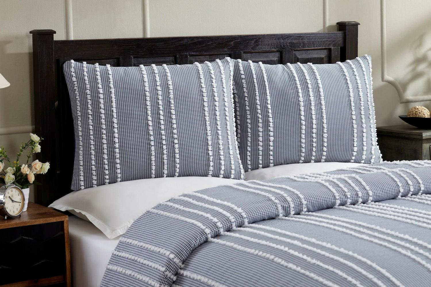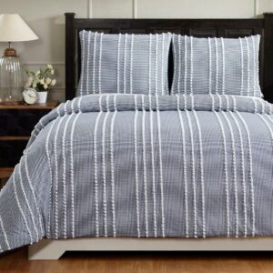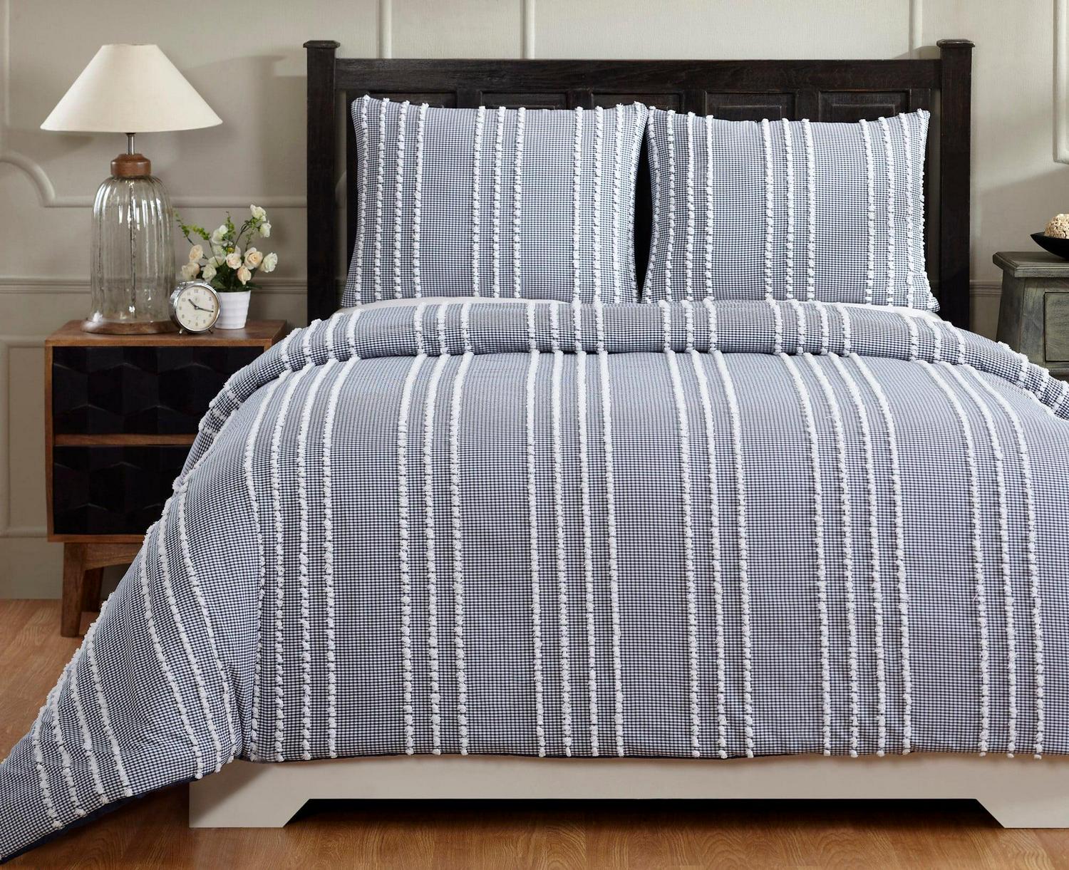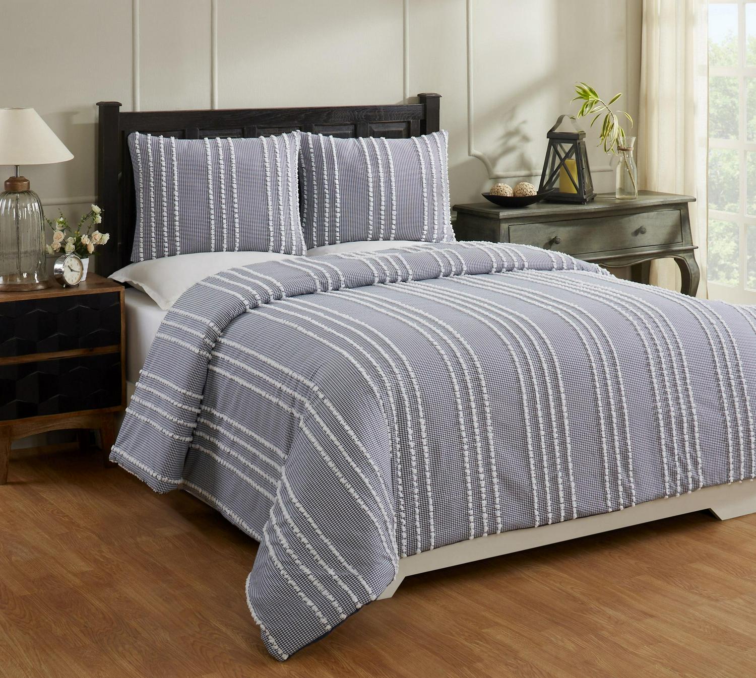 Upgrade your bedroom ensemble in a flash with this Winston Collection of comforter with sham. Manufactured with 100% cotton and filled with a thick layer of polyester, this cotton comforter is made with modern machinery and offers an eye-catching appeal. Its soft and plush construction provides exceptional warmth and comfort and will give your bedroom décor a beautiful look. This comforter with sham flaunts a big chenille tufted Clip-tuck stripe on the subtle shades of printed sheeting to create additional depth. It is easy to care for, this soft and plush comforter set is machine washable and offers a cozy feel to your bedroom interiors. This collection of comforter set is available in 2 colors and 3 sizes.