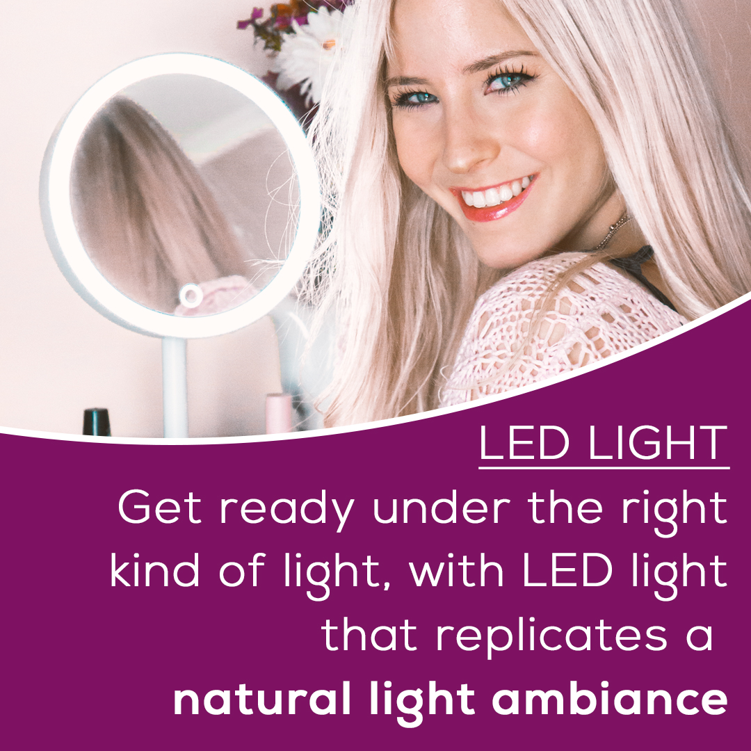 MAGNIFICATION: Use the magnification of your choosing, with the added magnetic mirror, which allows for some versatility. TOUCH SENSOR: With the technology to easily control the lighting in your space. Simply dim the light to your liking. STORAGE TRAY: A practical space for you to store your cosmetics and accessories as you get ready. DIMMER FUNCTION: We want you to look your best, so we want to offer the option of choosing your own light based on your environment. LED LIGHT: We want you to get ready under the right kind of light, we’ve integrated LED light that replicates a natural light ambiance. AUTO SHUT-OFF: Not to worry, even if you rushed out of your home and forgot our Cosmetic Mirror on, the battery won’t be consumed. WE’RE HERE FOR YOU: Our Friendly Florida based team is happy to assist you with whatever questions and support you may need. Our customer service is located right here in the USA!