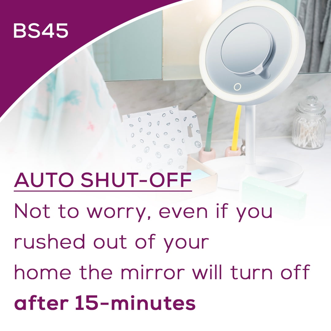 Beurer Illuminated 5x Vanity and Cosmetics Mirror, Touch Sensor Surface, Storage Tray, With Portable, Magnetic Magnifying MakeUp Mirror, White LED Light and Dimmer, Cordless, 360° Rotation, BS45