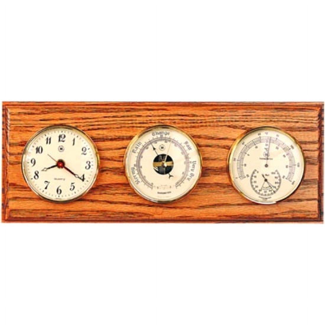 Barometric Pressure,Temperature,Time,Relative Humidity,Thermometer, hygrometer, quartz clock, and barometer,Aged ivory faces with smooth black text,Constructed of tarnish-proof brass on a solid wood base,Can be positioned either vertically or horizontally,Dimensions: 6W x 2D x 16H inches