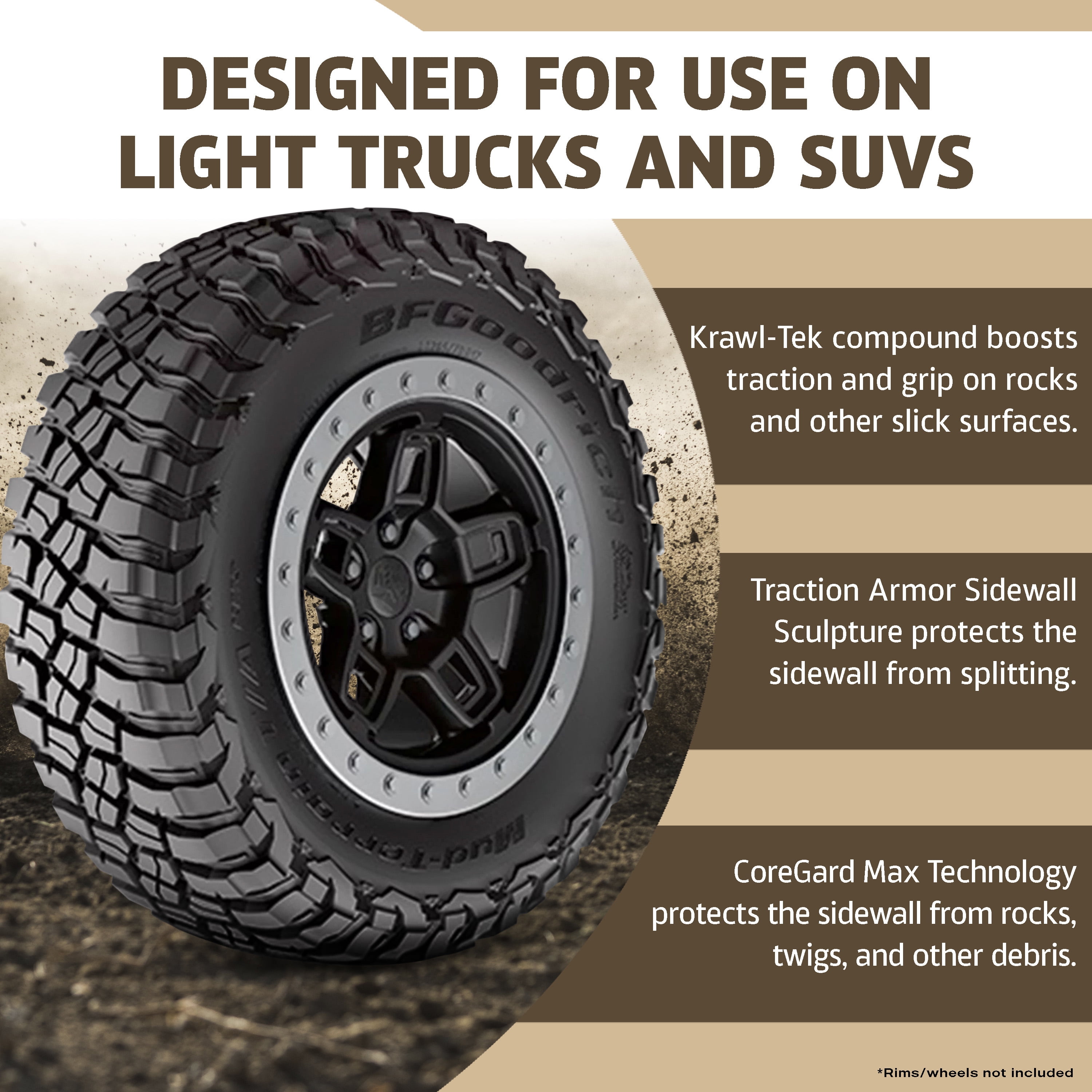 Bring on the unpaved road. The BFGoodrich Mud-Terrain T/A KM3 tire is must-have equipment for the serious off-road enthusiast, especially when conditions require extreme traction and toughness. Made to mud, built to climb and created to conquer, the BFGoodrich Mud-Terrain T/A KM3 tire was designed to power through mud and loose soil with ease thanks to its massive tread blocks that are uniquely engineered to deliver incredible grip from any angle of approach and Mud-Phobic Bars that release compacted mud for continued traction.