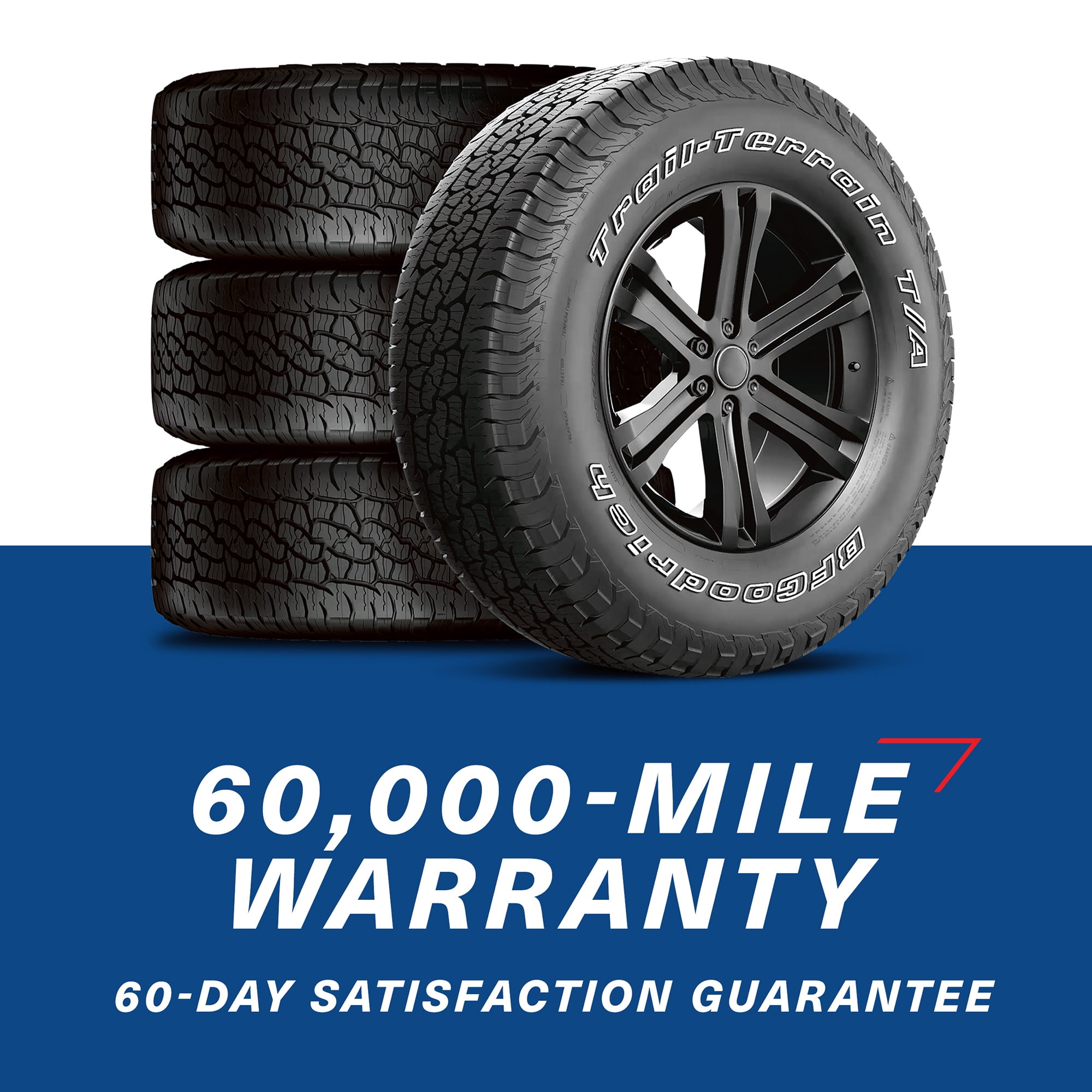 BFGoodrich Trail-Terrian T/A Tire BFGoodrich introduces the versatile and dependable BFGoodrich Trail-Terrain T/A tire. Road worthy and adventure ready, this rugged tire is durable enough for paved or unpaved roads. Built to last, the BFGoodrich Trail-Terrain T/A tire has an optimized footprint design featuring Full-Depth 3-D Locking Sipes that provide excellent tread block stability for even wear. As a result, you get a tire with longer tread life and a quiet, comfortable ride. Engineered so you can explore, the BFGoodrich Trail-Terrain T/A tire resists chipping and tearing in occasional gravel road usage. Plus, the serrated shoulder design makes it ideal for soft-soil traction in light off-pavement situations without compromising road noise. Don’t let adverse weather stand in your way either. The BFGoodrich Trail-Terrain T/A tire provides performance you can confidently rely upon, rain, snow or shine. The BFGoodrich Trail-Terrain T/A tire is backed by a 60,000-Mile Warranty and a 60-Day Satisfaction Guarantee, so you can be set for what’s next.