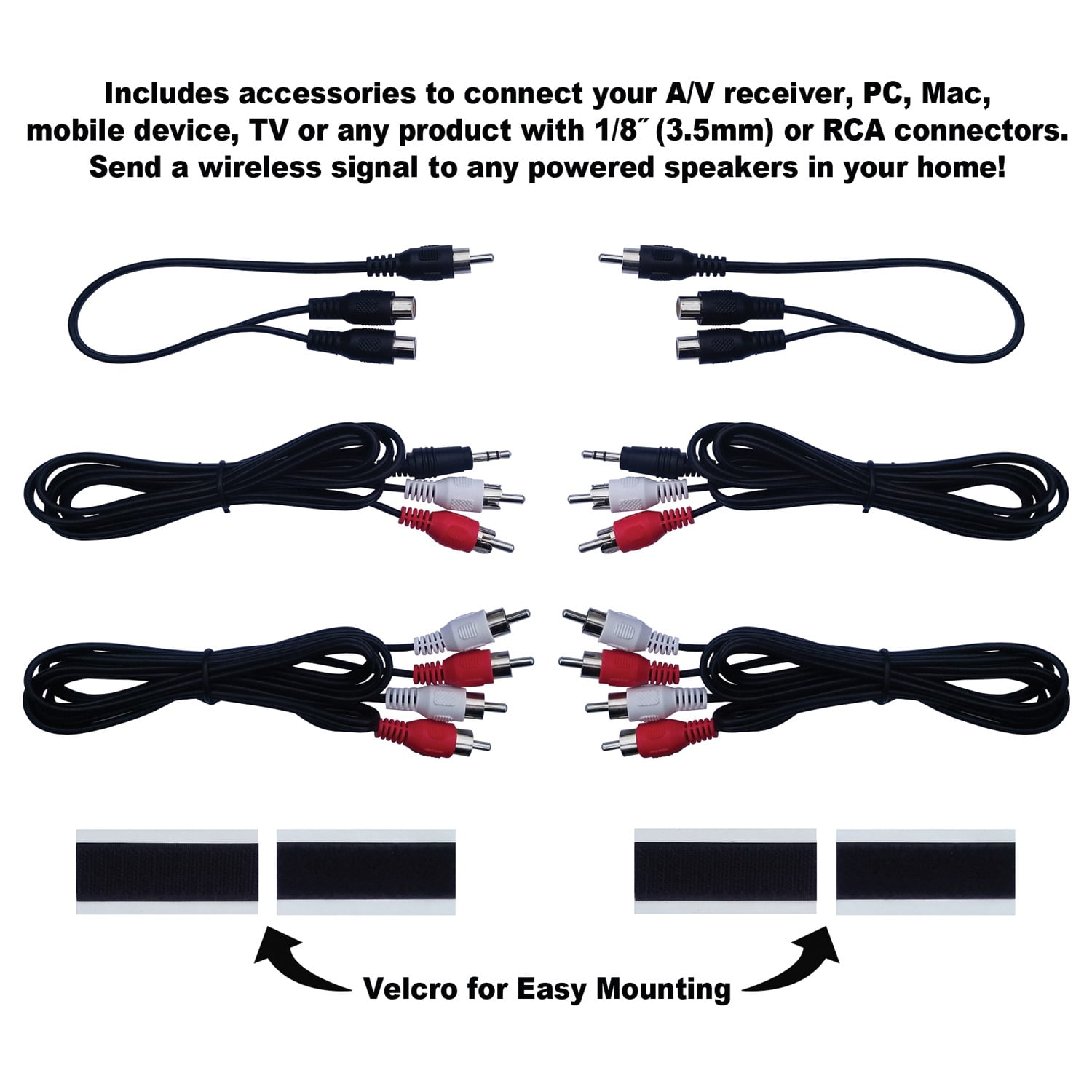 4-Channel Wireless Audio Transmitter/Receiver System Enables easy wireless hookup for powered subwoofers & powered speakers Solves wiring problems quickly & easily. Works with A/V receivers, Mac, PC, mobile devices & all other products with 3.55mm or RCA connectors No front-to-back of room wires or cables External antennas enable extended 80ft unobstructed wireless range & up to 60ft obstructed Includes self-adhesive Velcro strips, wireless transmitter & receiver, 2 external antennas, 2 USB AC power adapters, 2 USB cords, 2 RCA to RCA stereo patch cables, 2 RCA Y-adapter cables & two 3.5mm stereo to RCA cables No software required Signal-to-noise: 93dB RF band: 2.4GHz Compatible with most subwoofers, powered speakers, and A/V receivers Dimensions: 1 1/8″H x 3 7/8″W x 3″D Each Warranty: 1 Year Limited Warranty Note- for powered speaker hookup, you’re A/V receiver must have variable pre-amp out RCA jacks