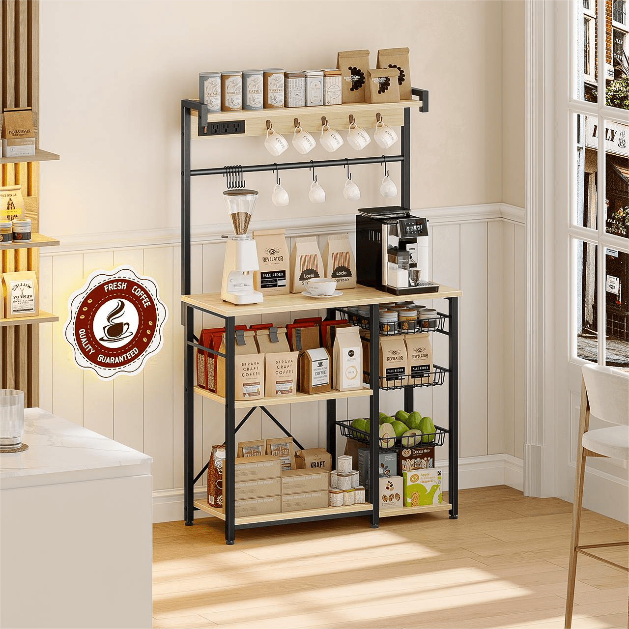 Biemlerfn 39″ Wide Large Bakers Rack with Power Outlets, 5 Tiers Coffee Bar Table with 3 Wire Basket, 15 Hooks, Microwave Stand Kitchen Storage Shelf, White Oak