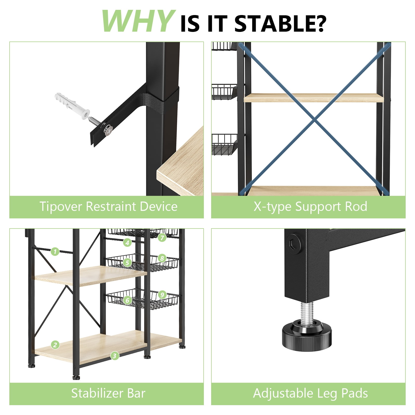 【Space Maximization】The compact 4-tier bakers rack offers an ideal storage solution for limited spaces. The top shelf is perfect for storing spices, oils, sugar, and tea, while the bottom two shelves are designed for everyday essentials or cookware. it is a perfect choice for your small kitchen. Size: 21.7 × 15.4 × 58.3 inches. 【Versatile Hanging Options】Equipped with 10 S-shaped hooks and metal pegboard, our kitchen storage shelf provides versatile hanging solutions. Hang cups, kitchen scissors, spatulas, spoons, and even pans at convenient heights, ensuring everything is within arm‘s reach for easy access during meal preparation. 【Adjustable Shelf】The middle kitchen shelf (max. load capacity: 80 lb) of this coffee bar can be adjusted up or down by 5.5” to fit kitchen appliances or supplies of various sizes, from a small toaster to your blender and microwave. 【Durable and Sturdy】Made from 12mm thick P2 particle board, our kitchen bakers rack combines a sturdy metal frame, X-shaped crossbars, adjustable feet, and tipover restraint devices, providing reliable stability. 【Quick and Hassle-Free Assembly】With a simple design and clear installation instructions, our microwave stand with storage can be easily assembled in about 10 minutes. Each accessory is labeled for easy identification. It is very suitable as a kitchen bakers rack, coffee bar, or living room storage shelf.