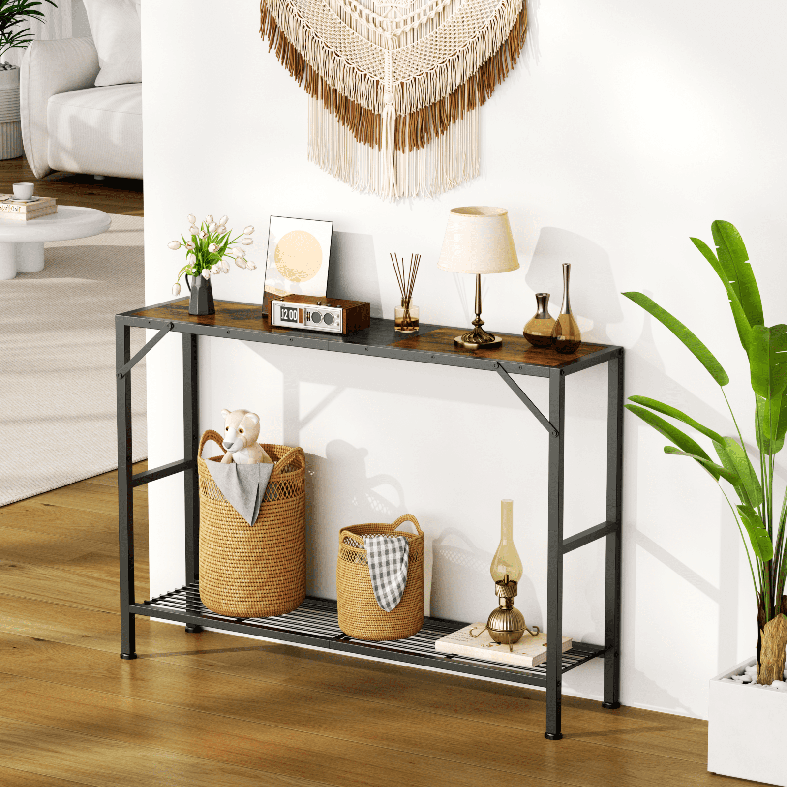 Biemlerfn 2-Tiers Industrial Console Table Perfect Partner for Small Space Are you still worried about limited space? This Biemlerfn Narrow Console Table will be a savior for your confined spaces. The 11.22-inch slim size allows it to be conveniently placed in any narrow passage, suitable for a entry table, hallway table, sofa table and so on. Besides, with the combination of classic wood finishes and industrial matte black, this skinny console table will greatly create a rustic and retro atmosphere to your home.
