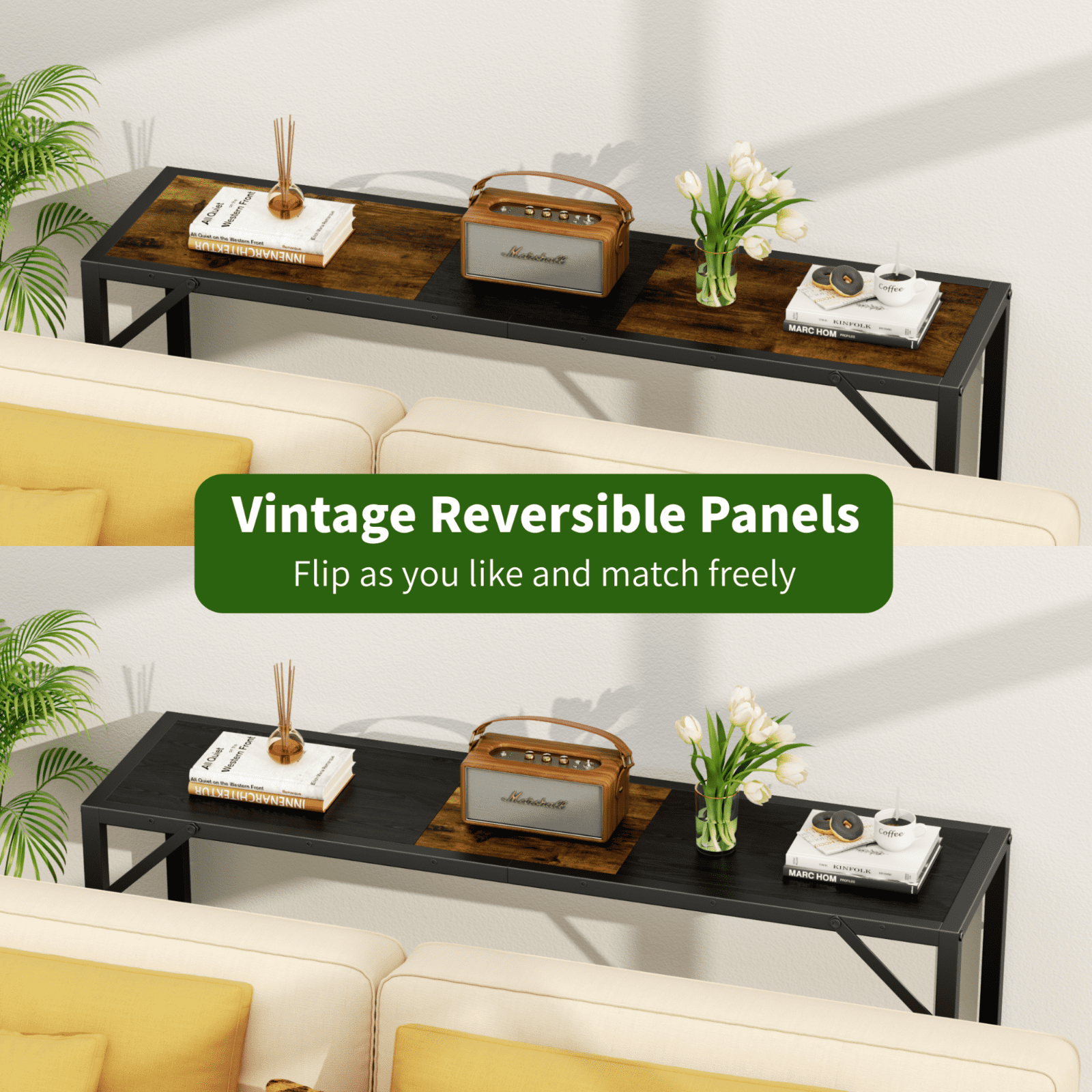 [Industrial Vintage Style]: This Biemlerfn console table blends a classic wooden finish with industrial matte black frames. The tabletop is made of three reversible panels and each panel has different colors on both sides, which allow you to choose your favorite combination according to your needs. Whether it is a brown and black splicing combination or a solid color combination, it can match to a variety of home styles and adds a vintage elegance to your home. [Sturdy Construction]: Made of sturdy metal frame and premium particle board, this Biemlerfn console table is stable enough to be used for a long time. The iron triangle bar and adjustable feet design will greatly double the stability of this table, so that this table can keep balanced even on uneven ground. [Multifunctional Narrow Table]: With a compact size of 41.73″×11.22″×32.08″, this console table is slim enough to fit easily in any smaller gaps. It is the perfect storage solution for tight spaces. Ideal as a sofa table, laptop desk, TV cabinet, entry table, hallway table, or even a plant table under the window. [Ample Space Storage]: 2-tiers open shelves design provides more storage space. The first tier will be an ideal place for your candles, keys, lamps, computers, and even more. The second tier offer extra space to put your books, plants, shoes, boxes ect. to keep your essentials, which will greatly help your desktop become neat and clean. [Easy Assembly]: The package contains clear and detailed instructions and tools needed for installation, and each accessory is labeled for easy installation. If you have any questions about our narrow console table, please feel free to contact us, and we will reply to you within 24 hours.