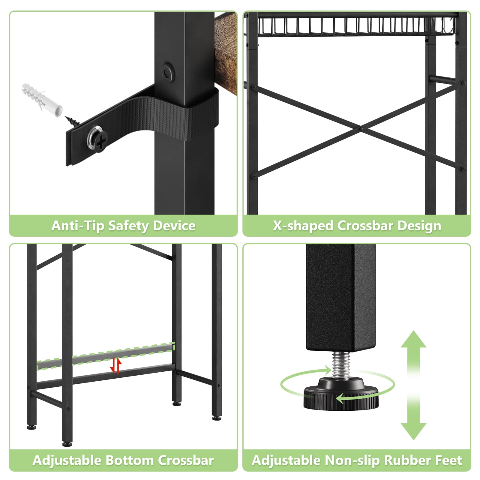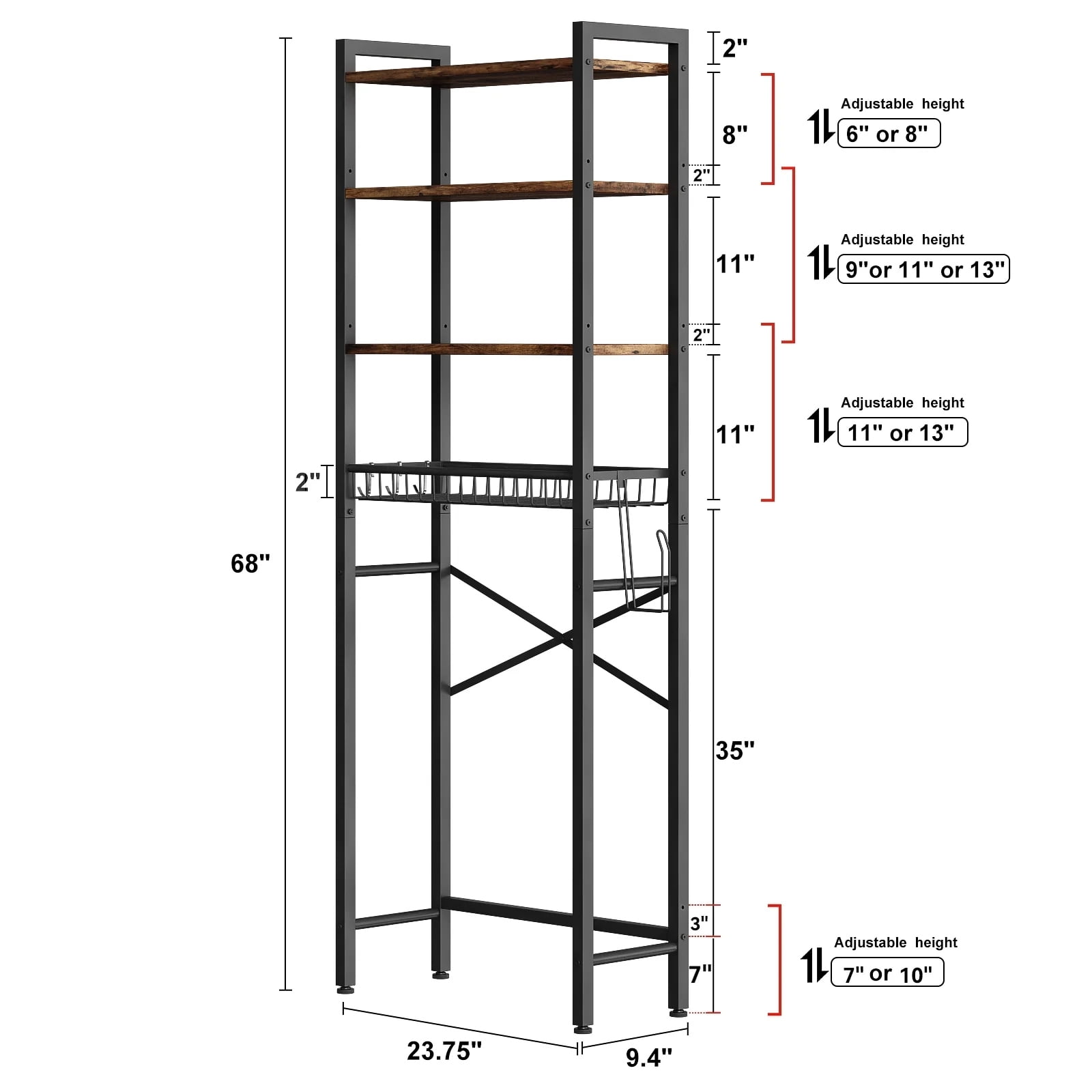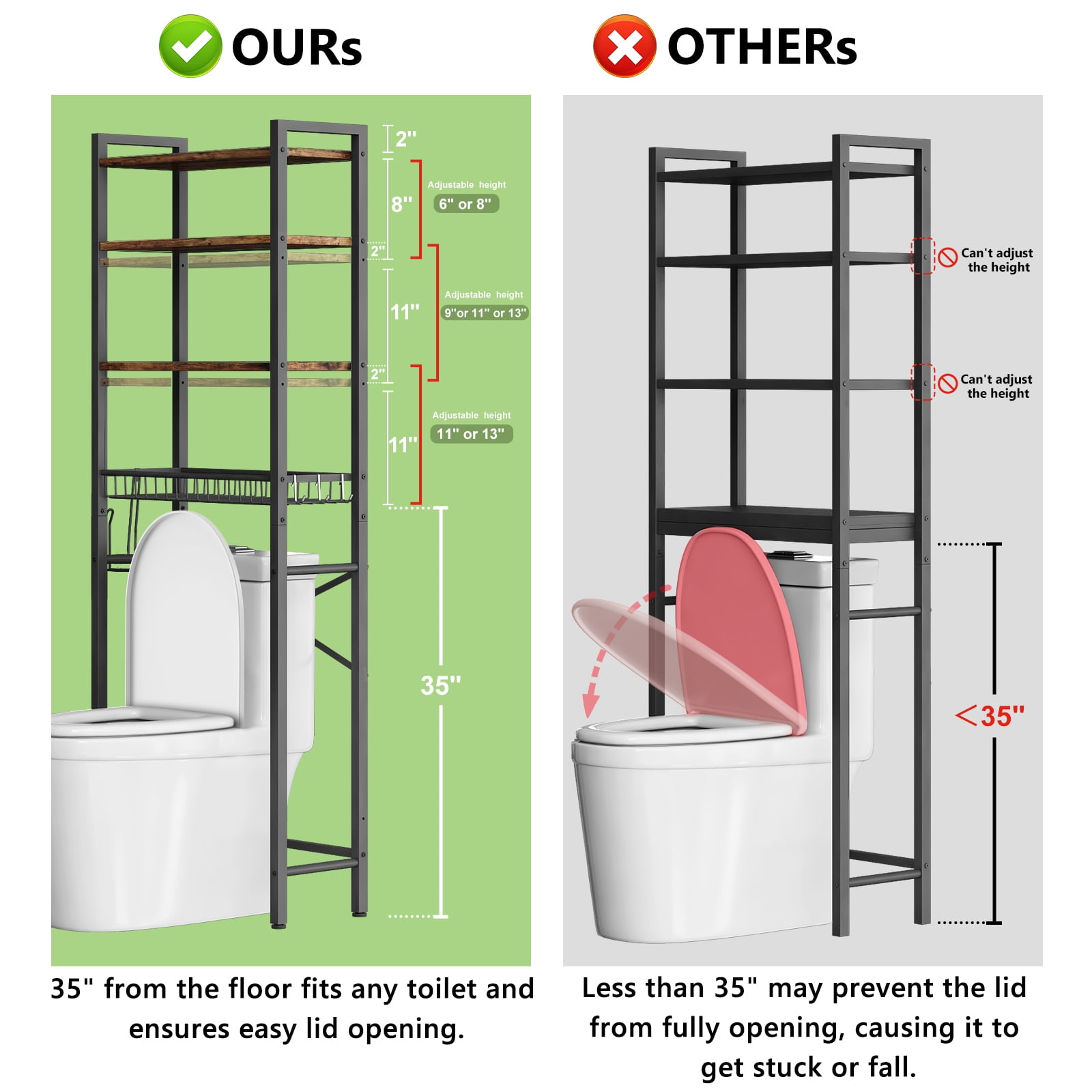 [4-TIER BATHROOM ORGANIZER]: Providing plenty of space to store bath essentials with this Kalrin toilet rack that boasts 4 tiers of storage. With the added convenience of a built-in toilet paper holder and three detachable hooks, you can keep your bathroom tidy and organized. Size of the over the toilet storage rack is 9.4″D x 23.75″W x 68″H, suitable for most of toilets on the market. [CONCENIENCE DESIGN]: The middle 2 shelves of the toilet rack can be adjusted to different heights, allowing it to fit various items, tall or short. The bottom drying mesh basket can store wet items such as shampoo and soap, and the raised edges protect your bathroom accessories from falling down. [HIGHT-QUALITY MATERIALS]: The Kalrin toilet rack is crafted with a high-quality carbon steel frame and eco-friendly particle board. The metal surface is protected with a powder coating, anti-rust, anti-corrosion. In contrast to inferior MDF boards, the particle boards we utilized are stronger. Additionally, their melamine coating ensures waterproof and moisture-proof properties, ensuring both durability and functionality. [STABLE CONSTRUCTION]: The sturdy X-shape metal rod in the back that improve the stability of the frame. Additional anti-falling accessory prevent over the toilet shelf from wobbling, further enhancing security, making them a dependable storage solution for families with children and pets. Each wooden shelf load capacity(each tier): 33lb. [VERSATILE TOILET STORAGE]: Suitable for multiple scenes such as bathroom, living room, kitchen, entryway, balcony, dormitory, hotel and porch. Of course, you can also use it as a storage cabinet, kitchen rack, plant stand, laundry organizer, many uses are waiting for you to discover! [EASY ASSEMBLY]: Assembling is a breeze! With a clear assembly manual and all the necessary tools provided, including numbered parts and Allen key, you won’t have any trouble during the installation, even if you’re not good at handiwork. [PREMIUM SERVICE]: We provide a 1-year warranty for all Kalrin products, if you encounter any problems, please contact us, we will reply within 24 hours and give you a perfect solution.