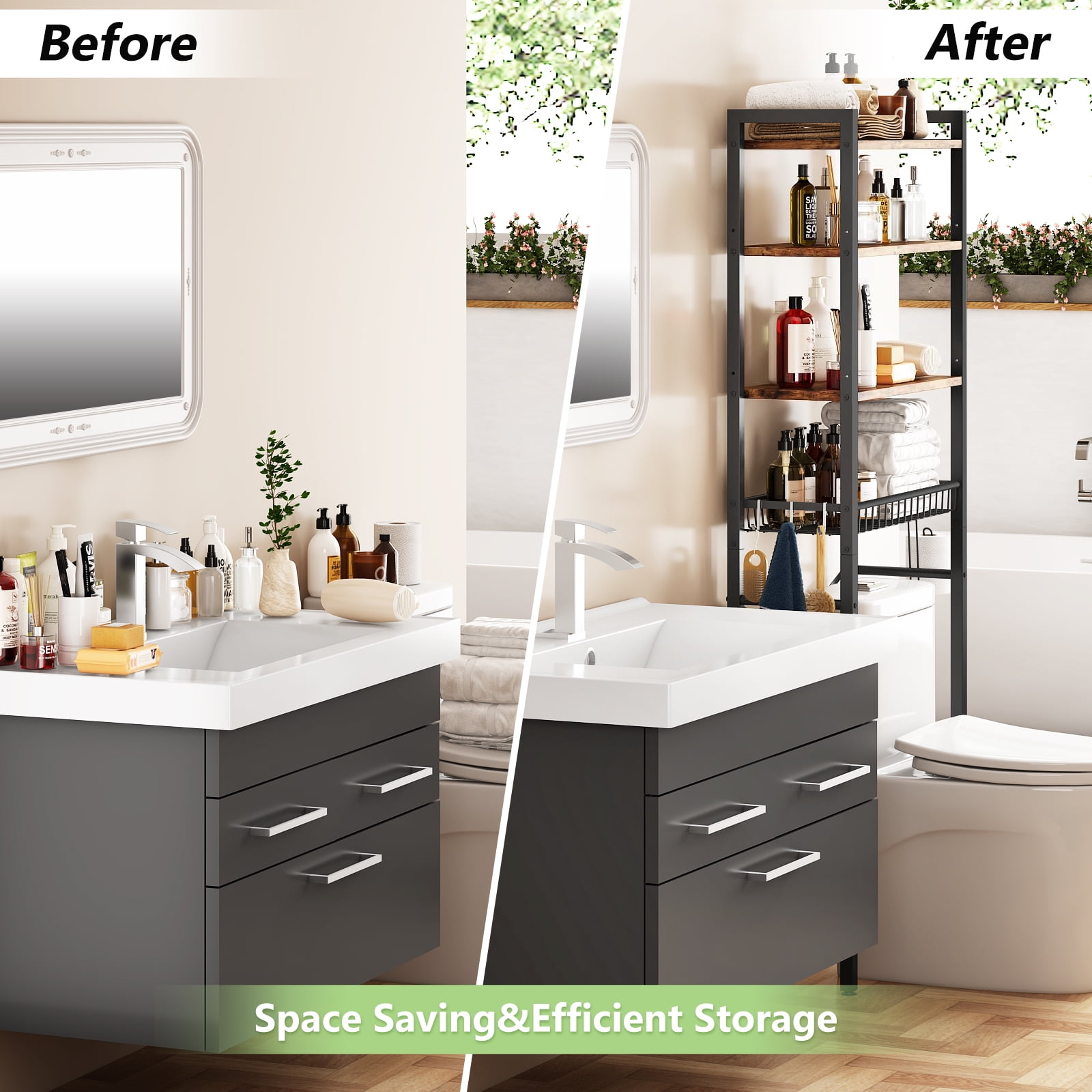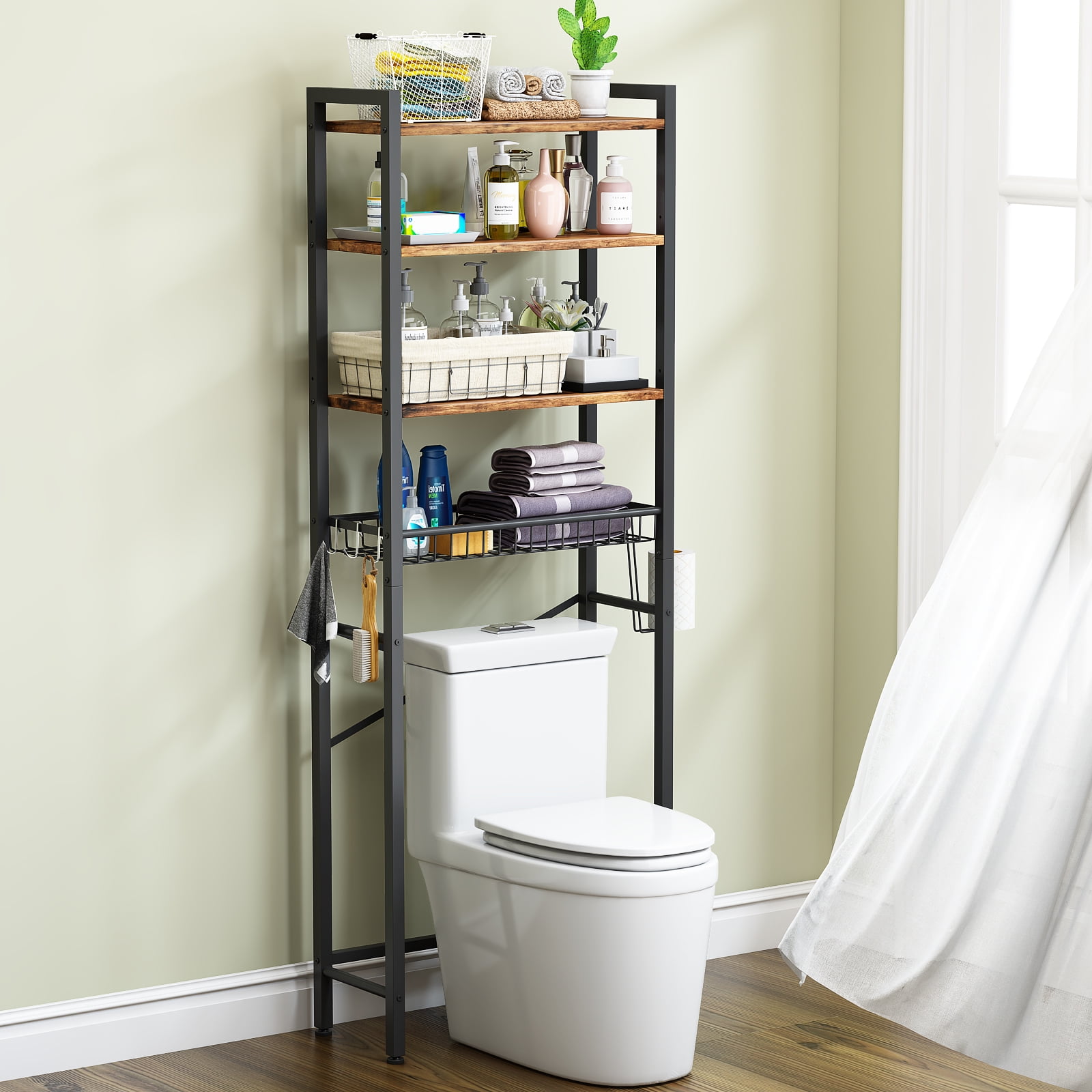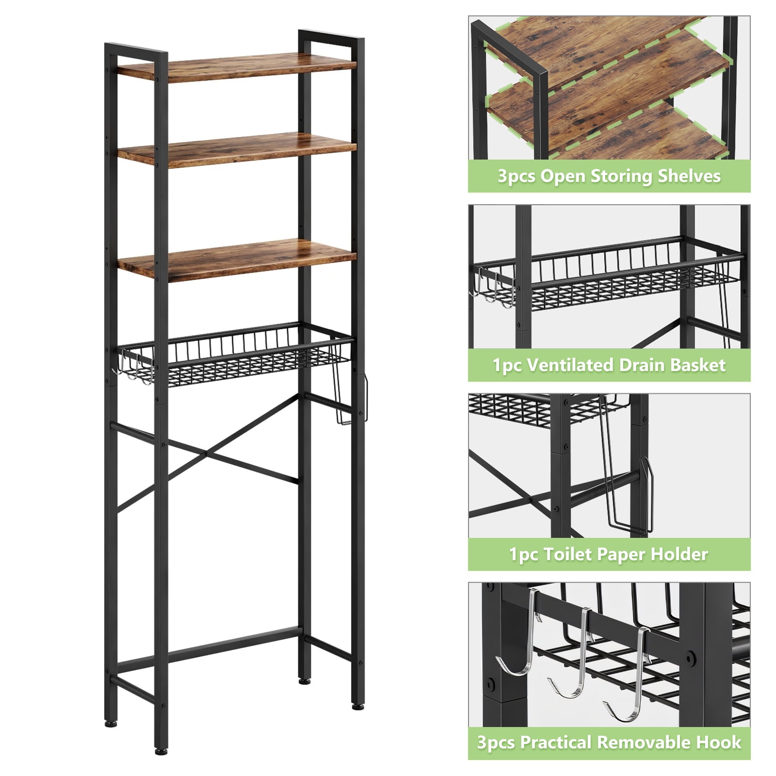 Biemlerfn Over The Toilet Storage Shelf, 4-Tier Wooden Bathroom Organizer Adjustable Saver Space Rack with Toilet Paper Holder, Vintage Brown