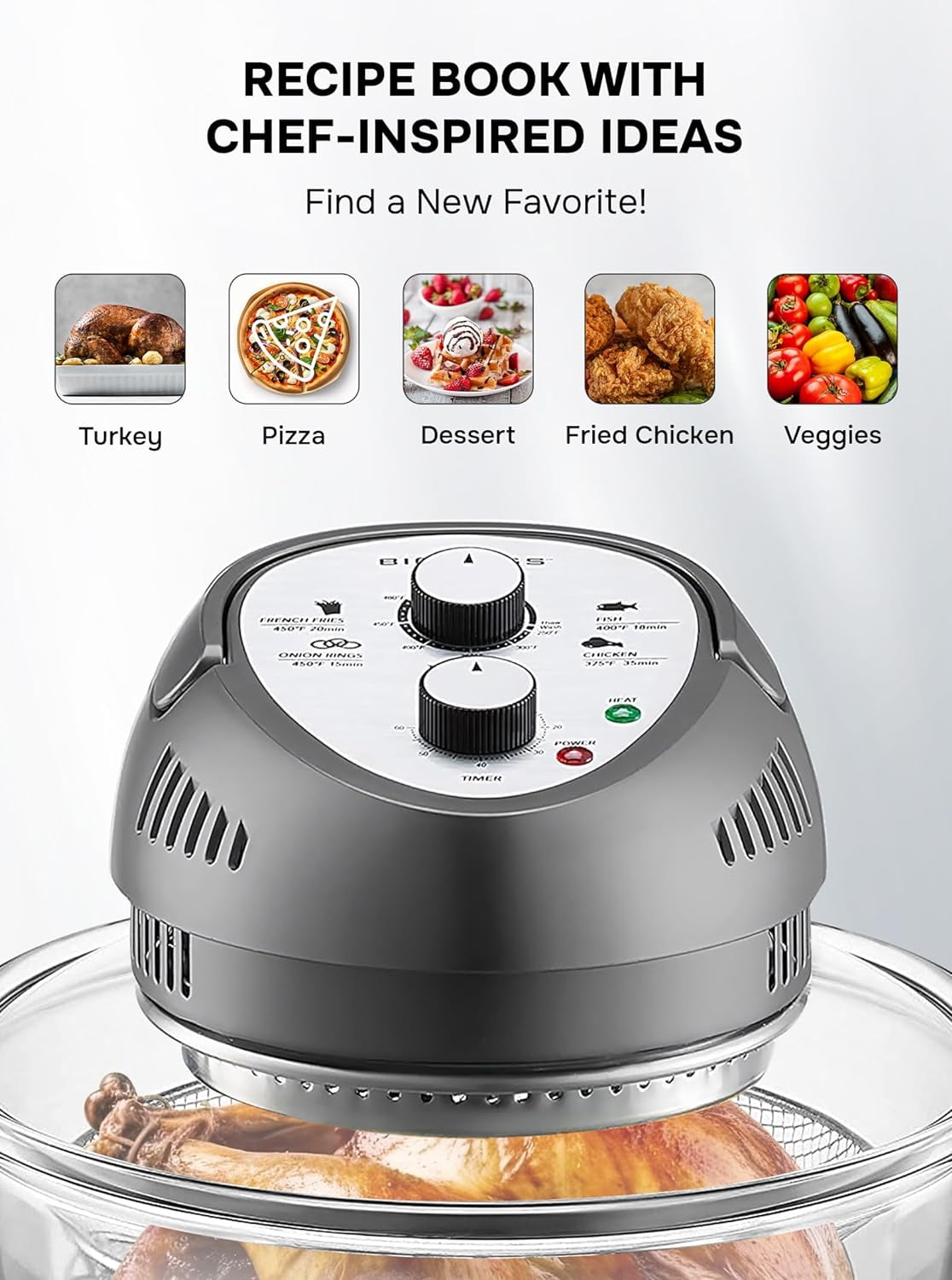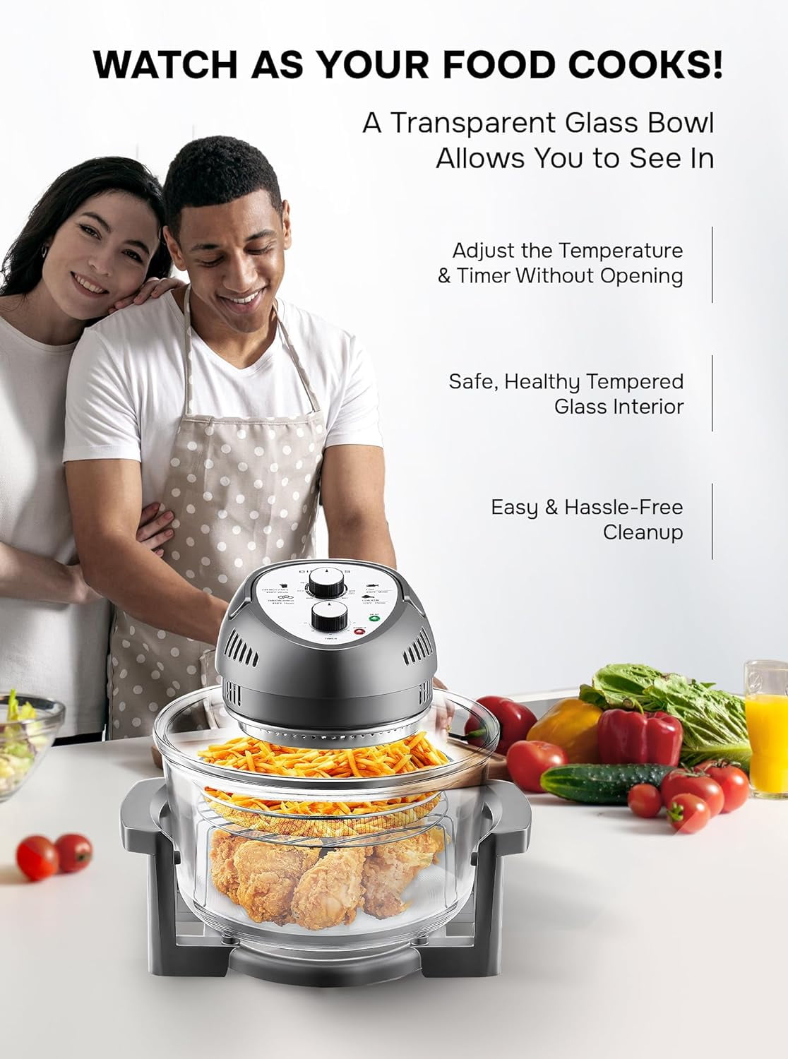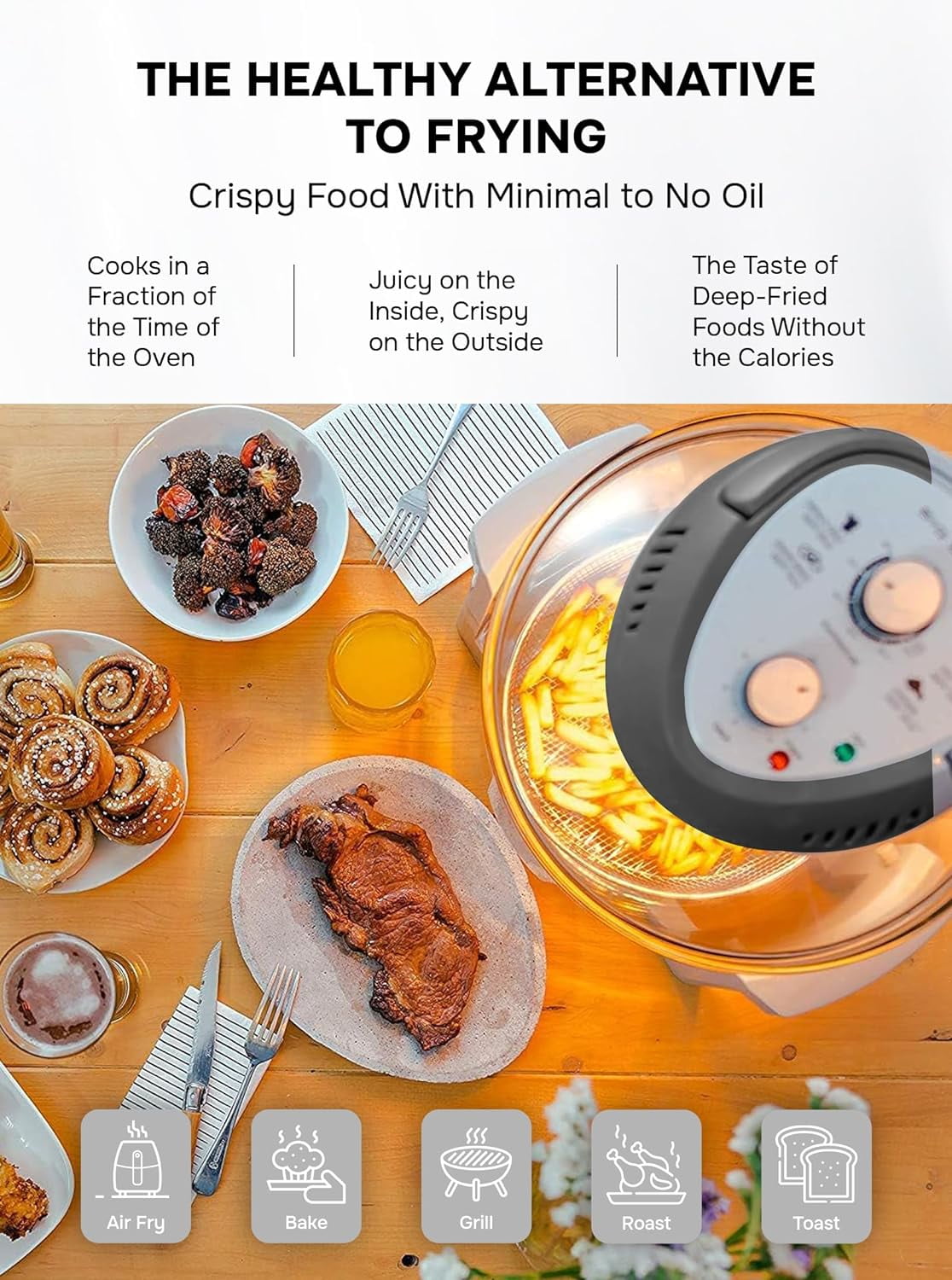 Air Fryer Toaster Oven: Perfect for a variety of cooking tasks. 16-quart capacity, ideal for whole chickens or small turkeys. Includes two cooking racks for multi-level cooking. Comes with a mesh basket for frying and roasting. Features a stainless-steel extender ring to increase capacity. Equipped with tongs for safe handling of cooking racks and food. Versatile Kitchen Appliance: Ideal for air frying, baking, grilling, roasting, and toasting with minimal oil usage. Experience a multitude of cooking methods all in one powerful 1300W unit. Advanced Heating Technology: Features triple cooking power—halogen for surface browning, convection for even heat distribution, and infrared for cooking from the inside out. Efficient and Fast: Heats from 180°F to 480°F with a 360° air convection system, cooking meals up to three times faster than traditional ovens. No preheating required. Easy to Clean: All removable parts are dishwasher safe, and the air fryer’s glass bowl and lid provide a hassle-free cleanup. Designed for Convenience: Transparent glass bowl and lid allow for easy monitoring of the cooking process, equipped with an adjustable timer and temperature control for perfect results every time.