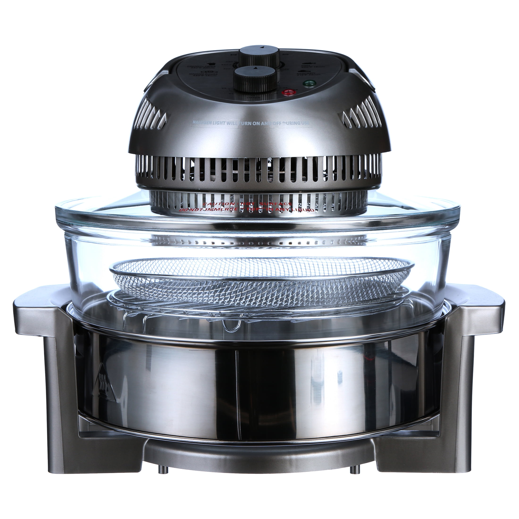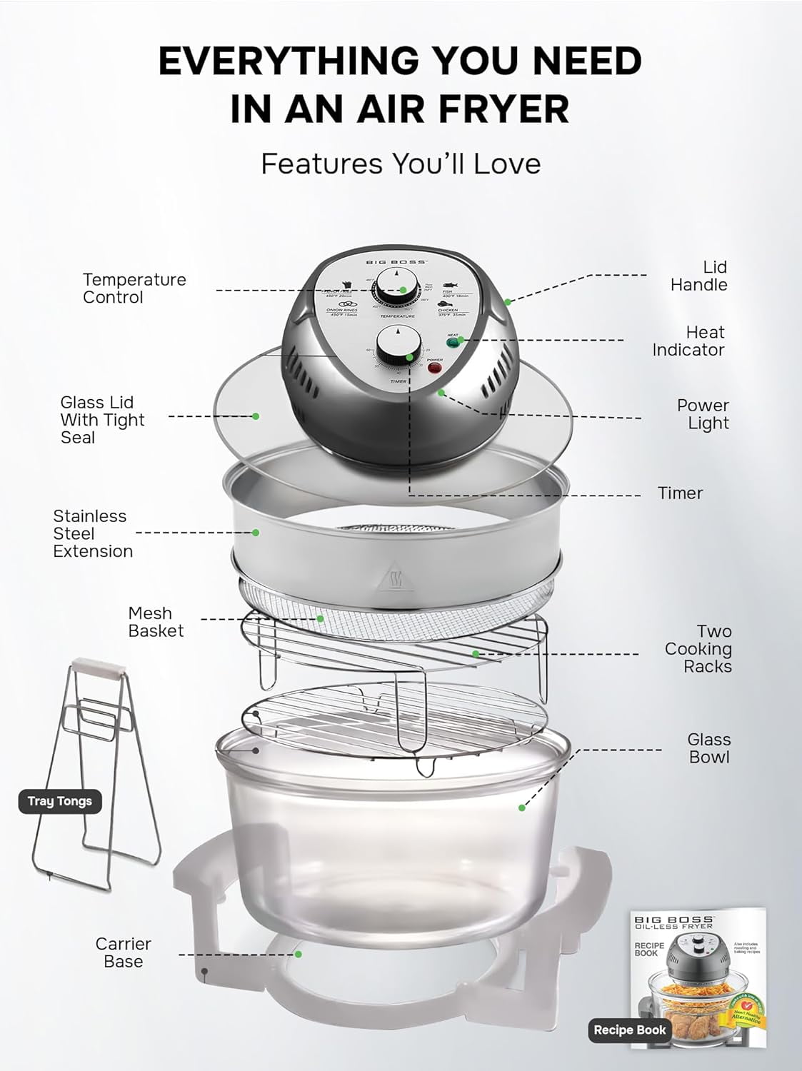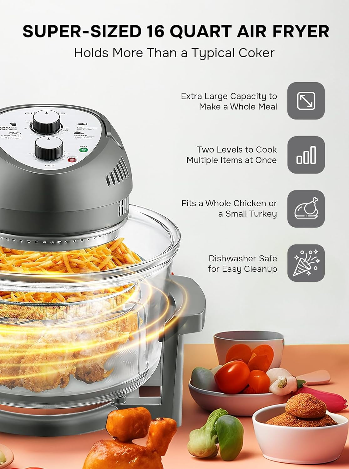 Big Boss Air Fryer Toaster Oven Combo 16Qt Kitchen Countertop Convection Rotisserie 1300W Large Glass Bowl Gray
