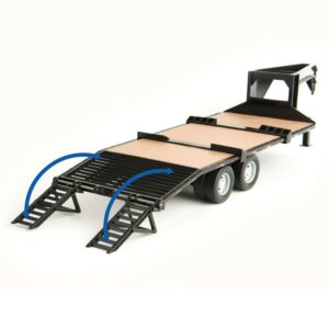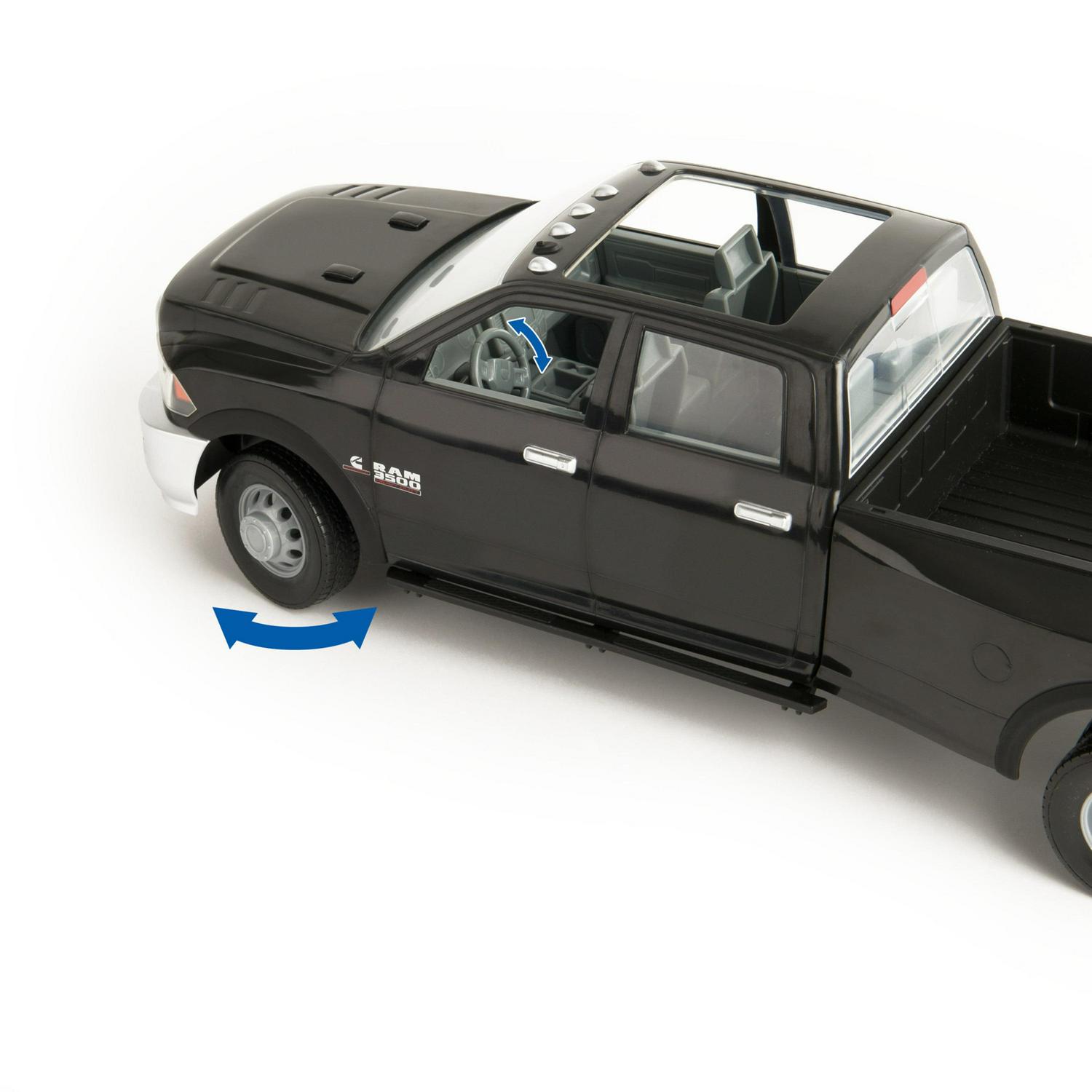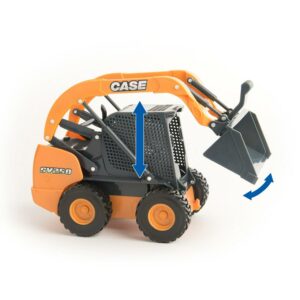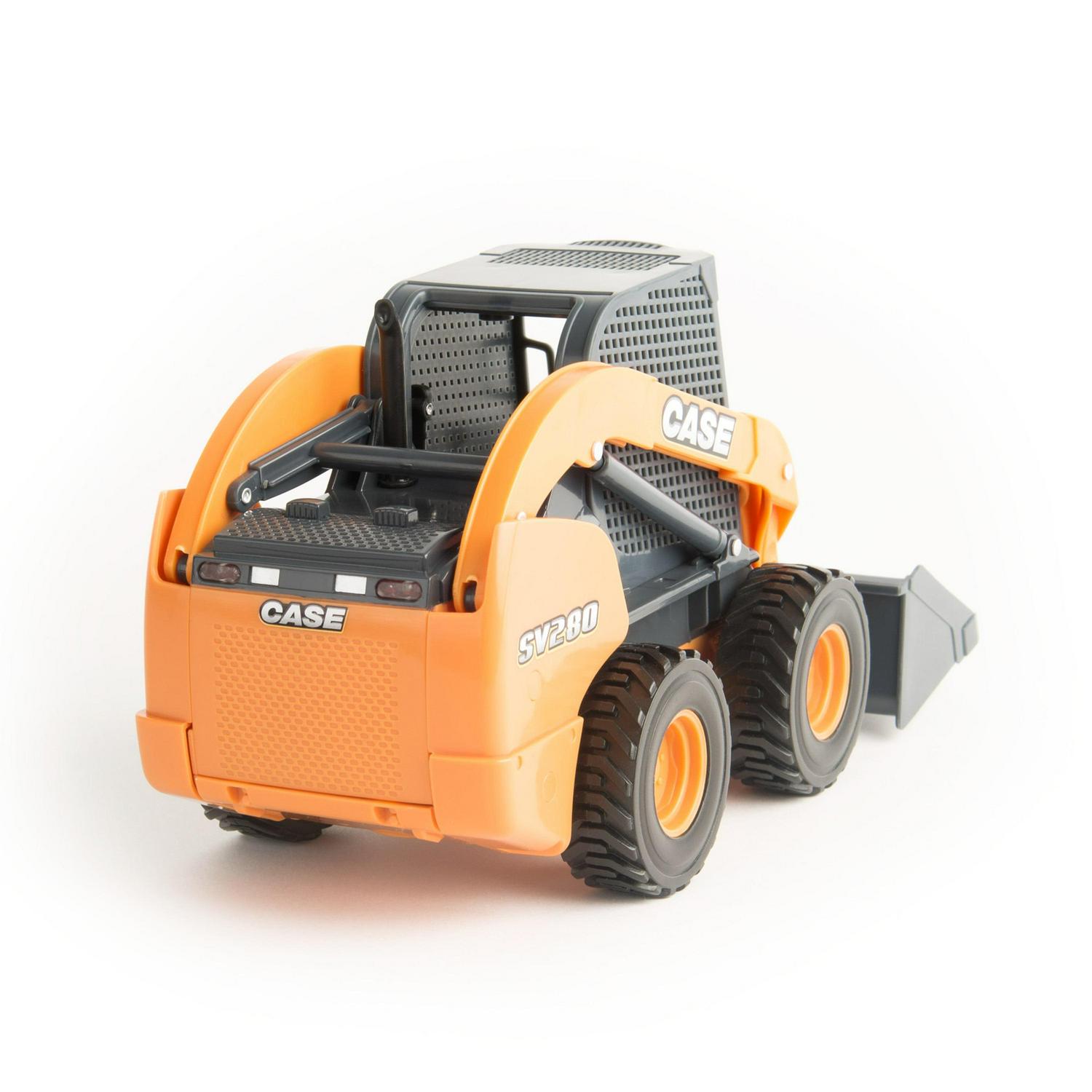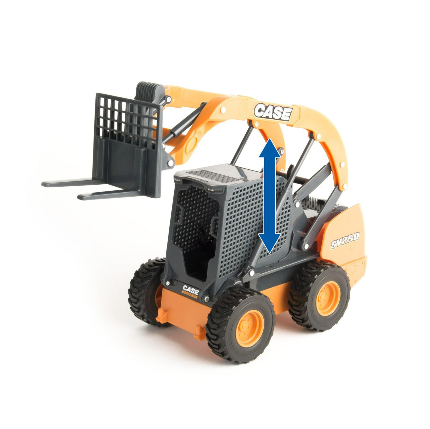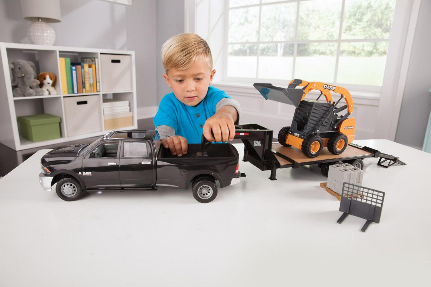 The ultimate in construction toy play, this 1:16 scale set features two different lights and sound vehicles that play very well together. The Ram 3500 Pickup with Gooseneck Trailer and the Case SV280 Skid Steer. In addition to lights and sounds, the Skid Steer also includes and interchangeable bucket and pallet fork so your little construction fan can easily choose the best tools to move the included pallet and cement blocks. The Gooseneck trailer features movable ramps for easy loading and unloading of the Skid Steer as well as adjustable jack stands. This construction toy set includes 3 AAA batteries so the fun can start right away.