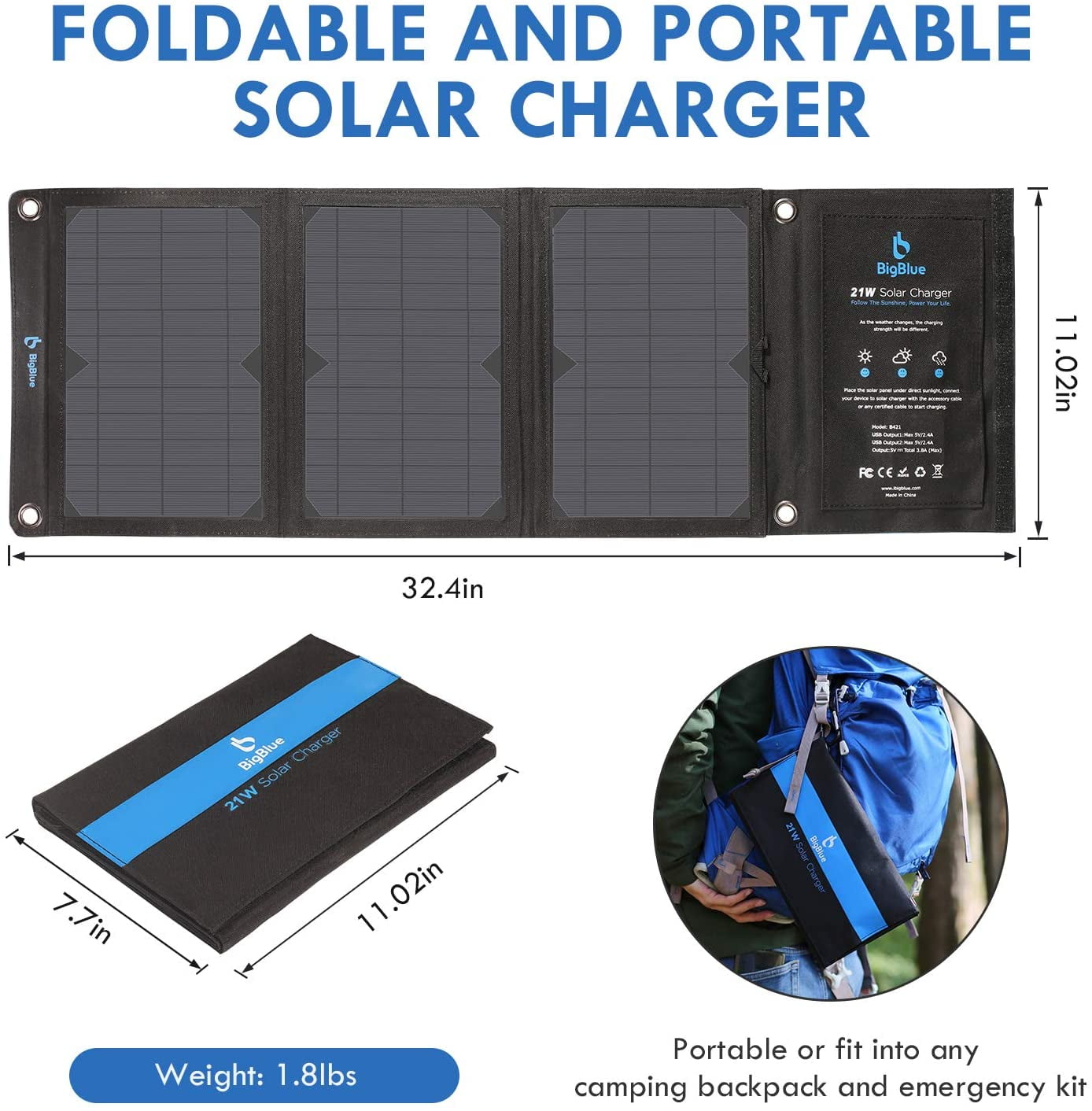 BigBlue 28W Solar Panel Charger With 3 USB Ports Compatible Device: • IPhone 13 / 12/ 11/ XS / XS Max / XR / X / 8 Plus / 8 / 7 Plus / 7 / 6S / 6 iPad mini 2 / 3 / 4 • Samsung Galaxy S22/ S21/ S20/ S10 / S10+ / S10e / S9 / S9+ / S8 / S8+ / Note 9 / Note 8 / Note 7 • Pixel 3/ 3a/ 2/ 1/XL, Nexus 6P/5X/9,LG G6/G5/G4/G3/V20, HTC 10, HTC One A9/M9’Google Pixel / Pixel 3XL, Nexus 5X / 6P, Sony XZ2 Premium, Sony XZ3,Tablets, Driving recorder, Navigator, Camera • Huawei P10 / Mate 9 / Mate 20X / Mate 20 Pro, USB LED flashlight, Tablets How to Use It? 1. Unfold four solar panels in the direct sunlight and no shadow or cover( The best angle is 45° toward the sun) 2. Then connect your phone or other 5V electronic devices to the USB output port. 3. The red LED light will go on when the solar panels works normally; It will flash when there are overcurrent or short circuit. Specification: • Conversion Efficiency: ≥23.5% • Solar Cell: SunPower • USB Output Voltage: 5V •Total Max Output Current: 4.8A •Folded Size: 11.1*6.3*1.3in (28.2*16*3.4cm) •Unfolded Size: 33.1*11.1*0.2 in (84*28.2*0.5cm) •Net Weight: 610g Package: • 28w Solar Panel Charger*1 • Buckles* 4 • USB cable*1 • User Manual*1 FAQ Q: Can they be chained with each other? A: They can be chained with each other using the buckles that comes with. But it is not possible to improve the power of the charge by using two solar chargers together. Each one has its own inner structure that can’t be connected with another one. Q: Is this rugged enough to be kept folded in a typical backpack with other gear pushing against it without damage? A: Of course it is very rugged, but please be careful to not over bend or scratch the panels. Q: Would it be Safe to charge 3 mobile battery packs/mobile batteries at once with this? A: Might take a while but it has 3 usb connections. Q: Do all four panels have to get sun for one usb port to charge? A: All the solar panels need to be exposed under direct sunlight, otherwise, the solar panels that are not exposed to the sun will become resistors, making it impossible to charge. Q: Do the panels have auto-restart while in the sun? A: Of course. It starts charging again the moment it produces enough output for the attached device to charge.