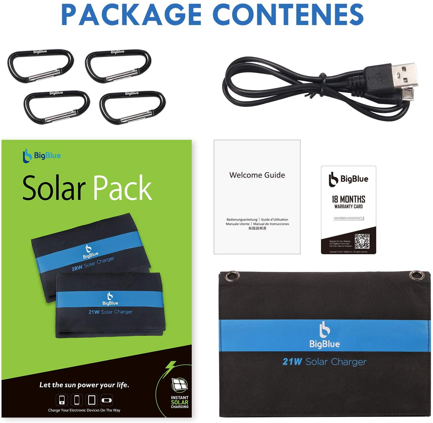 ⚡High Solar Conversion Highly efficient SunPower solar panels convert up to 24% of solar power into free energy in enough sunlight, which is the most durable panels at present, standing up to elements and wear and tear better than conventional panels. This special PET polymer surface protects solar panels from occasional rain or wet fog and three ports are covered with rubber covers to protect them from dust or water damage. ⚡Upgraded Triple USB-A Ports Each maximum output is 5V/2.4A and the total maximum current is at 5V/4.8A. BigBlue 28w solar charger allows you to charge multiple devices at once. It comes with smart charge technology which can recognize your device smartly then provide optimal charging speed vary with different devices. BigBlue ensures 100% safe charging with overcharging, overheating and short circuit protection. ⚡Portable Camping Folding Solar Panel BigBlue USB solar charger is a great option if you’re taking an extended camping trip or if you’re traveling somewhere with an unreliable power grid. ⚡Wide Compatibility Attached a USB cable for almost all 5V Android devices & some DSLRs, or Apple devices (Note: needs extra original cable for Apple devices). Our solar cell phone charger can’t store the electricity, please unfold all solar panel in outdoor direct sunlight, then connect your device to USB output port. Note: our portable solar charger can’t charge the laptops and iPad Pro. ⚡Package and Support You will get BigBlue 28W Solar Phone Charger, 50cm USB Cable, User Manual and friendly Customer Service.