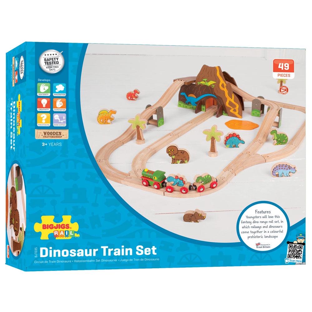 Go on your own Jurassic adventure with our Dinosaur Train Set. Watch as the wooden railway and dinosaurs come together in a colourful, prehistoric landscape. This 49 piece wooden train set includes high-quality wooden train tracks, a dinosaur railway engine and two carriages, volcano tunnels, a group of wooden dinosaurs and trees. Train play is a great way to encourage creative and narrative thinking, hand-eye coordination, imagination and coordination, develops fine motor skills and encourages problem-solving. This quality dinosaur train set makes the perfect gift for dinosaur mad kids. Magnetic couplings on the toy train ensure compatibility with all other engines and carriages in the Bigjigs Rail range. Additional wooden train accessories are available to expand this set. Most other major wooden railway brands are compatible with Bigjigs Rail. Made from high quality, responsibly sourced materials. Conforms to current European safety standards. Dinosaur Train Set product features: 49 piece wooden train set Includes wooden tracks, a dinosaur railway engine and two carriages, volcano tunnels, a group of wooden dinosaurs and trees Magnetic couplings ensure compatibility Most other major wooden railway brands are compatible with Bigjigs Rail 61.2cm L x 20cm H x 95cm W 3 years +