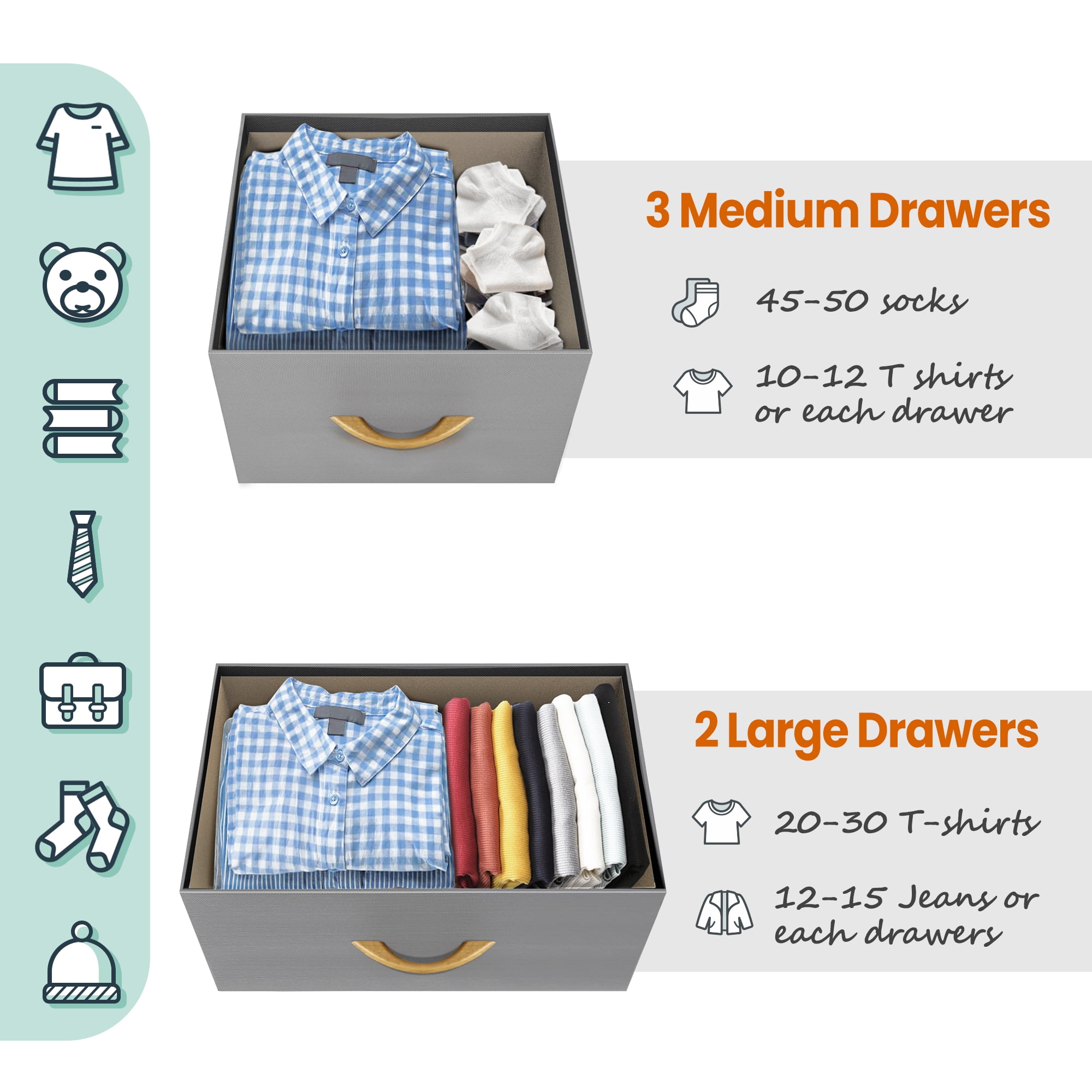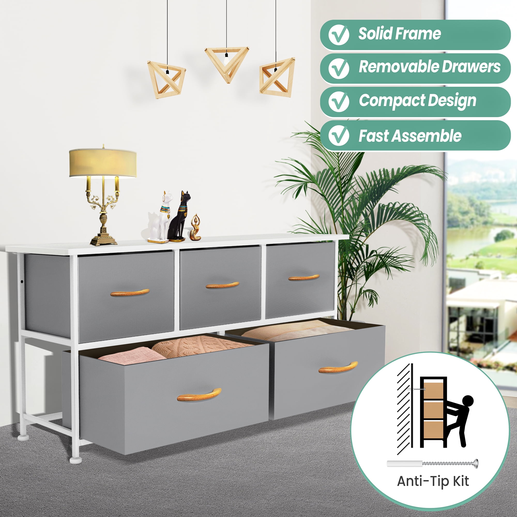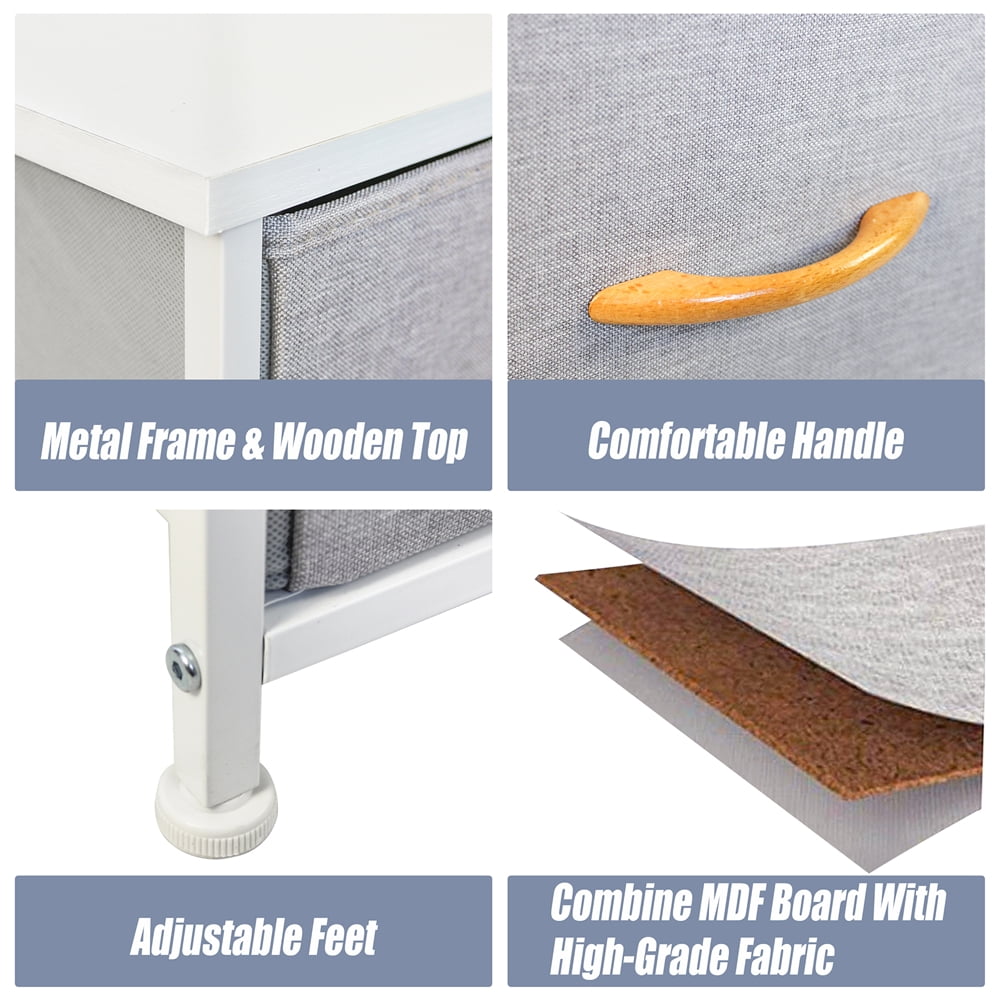 FEATURES: The wooden top provides a hard surface for displaying lamps, alarm clocks, books, eyeglasses, charging stations, and more. The entire unit is portable, lightweight, and easy to relocate to different spaces. 5 DRAWERS IN 2 SIZES: Removable and foldable drawers could store clothes, toys, and other household items. Different sizes meet different needs. Easy to open and close. EASY TO ASSEMBLY: The package comes with all the tools and accessories. Our detailed instructions will show you how to install it. This dresser only takes a few minutes to assemble. Powerful metal frame. Durable MDF wooden top. 5 removable and foldable drawers with wooden handles. 4 adjustable plastic legs that prevent scratches to your floor. A great addition to any bedroom, closet, hallway, and more for instant storage. Specifications Dimension: 39.3 ” W x 11.4″ D x 21.6″ H Material: Metal Frame + MDF board & non-woven Materials Fabric Drawer + wooden handle Product Care: Wipe clean with a wet cloth and let it dry.