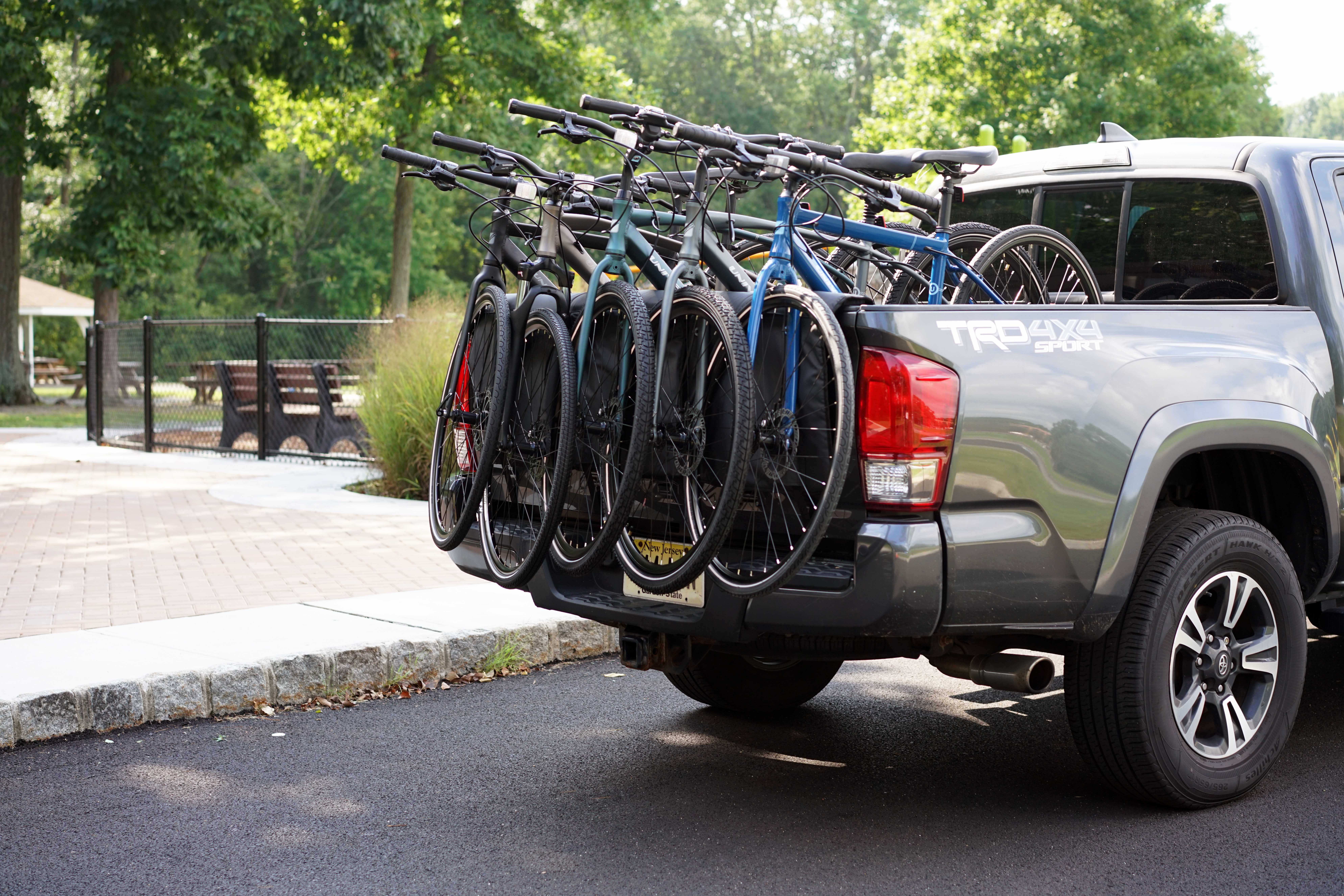 This is a durable weatherproof padded tailgate cover from Bike Shop Top made with a heavy-duty weatherproof PVC top over a soft polyester fleece backing and it attaches to your truck with Nylon straps. These straps feed from the inside of the truck bed instead of the outside which makes for much easier installation and the buckles also have covers to protect your forks from scratches. There are 5 Velcro straps to safely secure 5 bikes that are 2″ wide for better stability while holding bikes. It also has a handy large interior tool pouch that has heavy duty Velcro closures. It measures 54″ wide, 38.5″ long and the EPE foam padding is 1.5″ thick. In addition, it was made extra big so that it won’t cover up a back-up camera when open and tucked under the cover, if applicable.