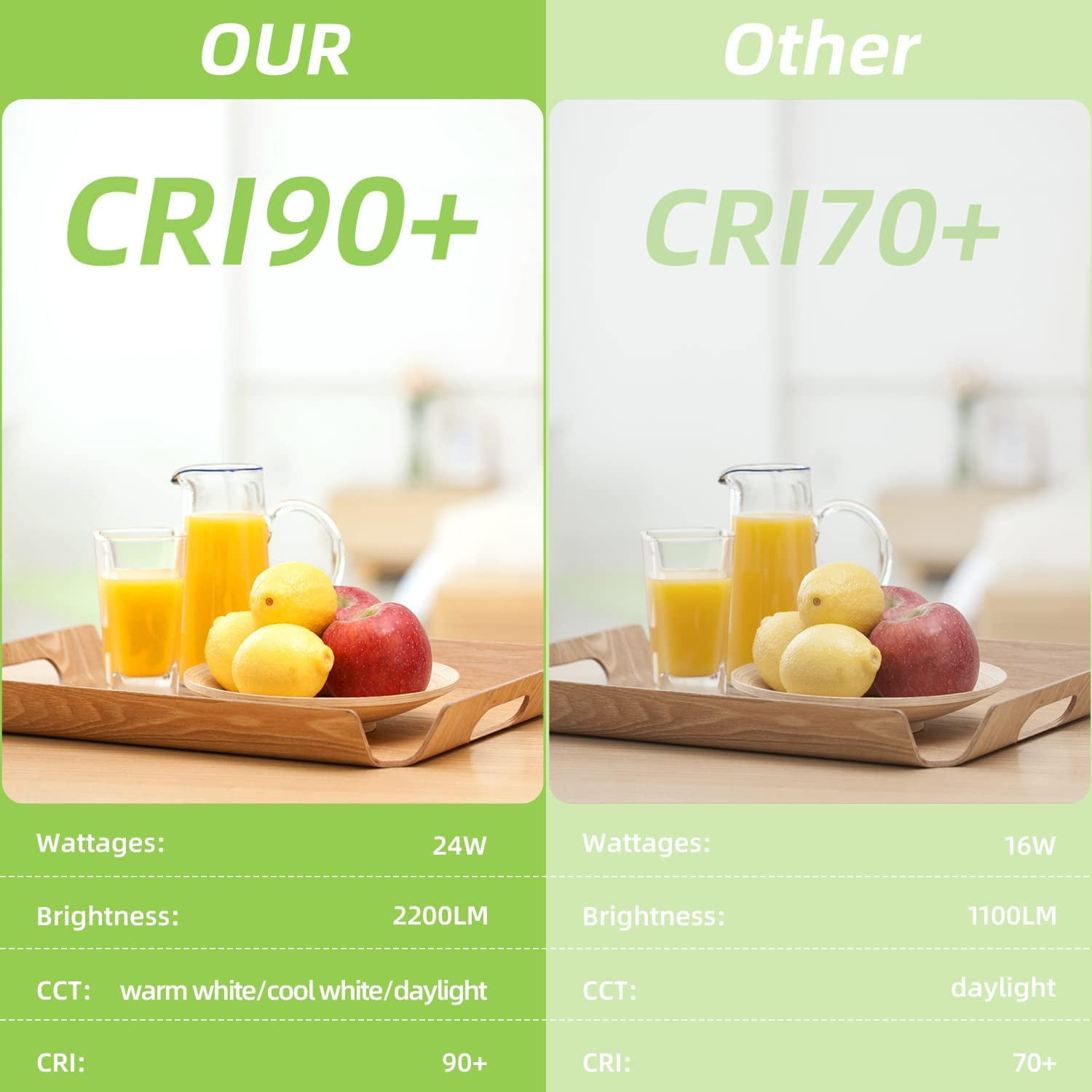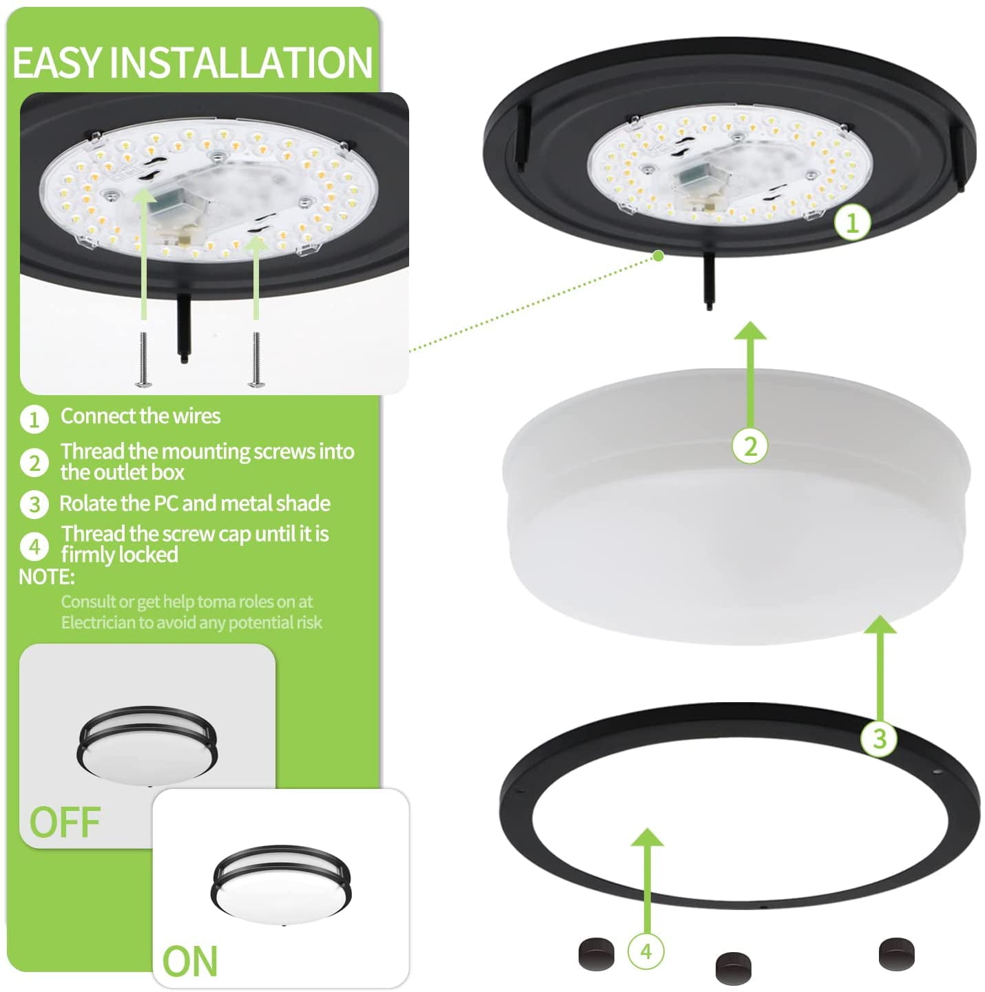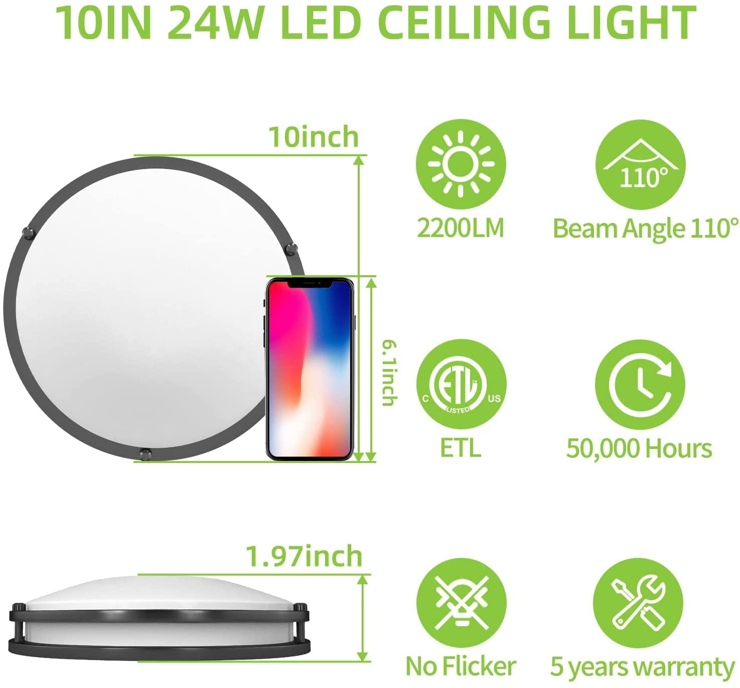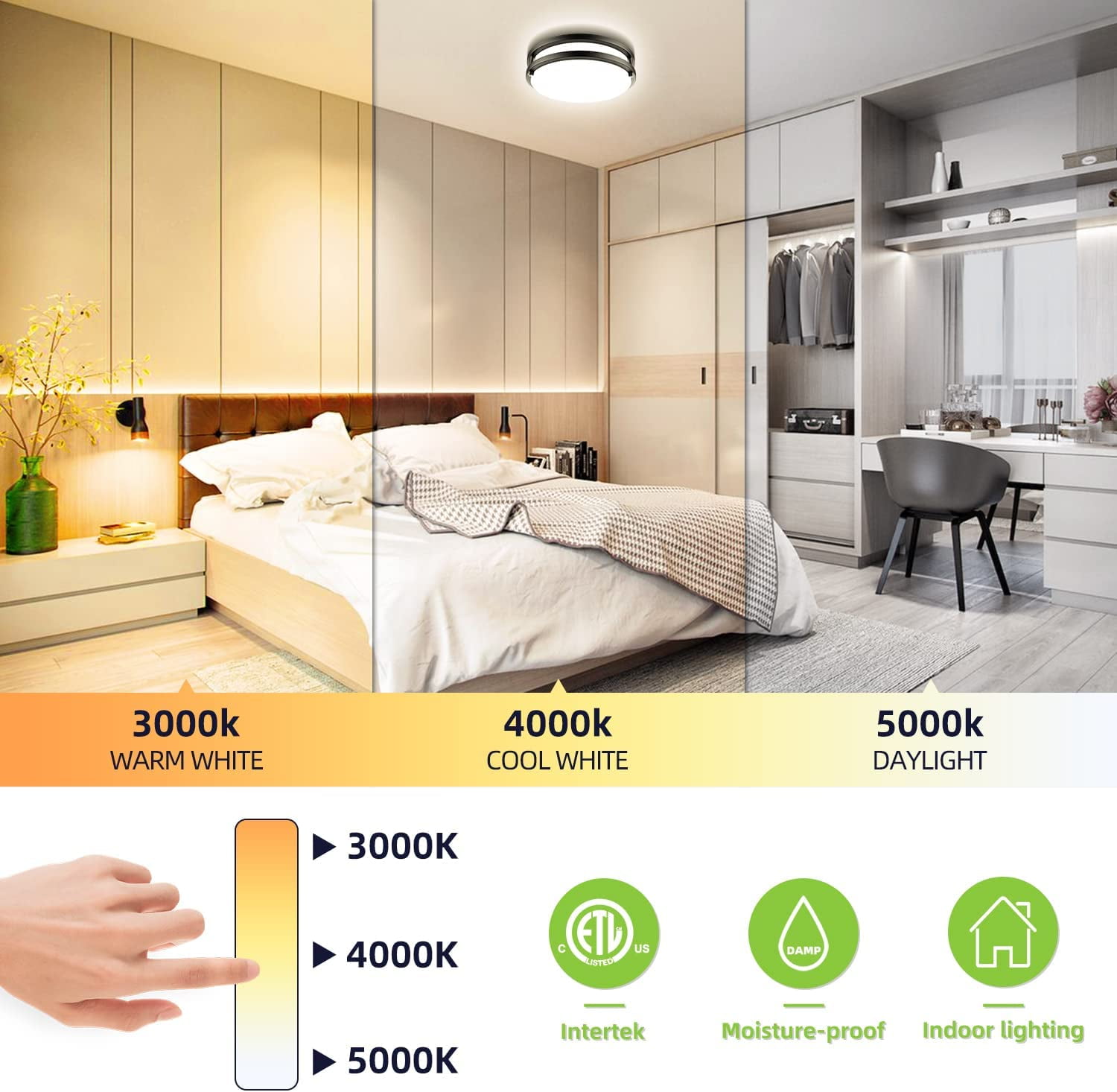 3 color changing temperature, warm white(3000k), cool white(4000K), and daylight white(5000k) Brightness 5-100% dimmable 24W makes your room brighter 50,000 hours life span, 24W energy- efficient LED lights Installation pretty straight forward went together easy, came with wire nuts Warranty for 5 years. We provide return service without reason and will do our best to provide you with a satisfactory shopping experience Package List: 2 x 24W LED Flush Mount Ceiling Light Fixtures 2 x Mount Hardware (pack) 1 x User Manual Product Specifications: Beam angle: 110 Input voltage: AC 120V Power consumption: 24W Material: Aluminum + Plastic+ Acrylic Lumen: 2200LM Rated Lifespan: 50000 hours Equivalent: 250W incandescent light bulb Dimensions: 10 x 10 x 3 inches