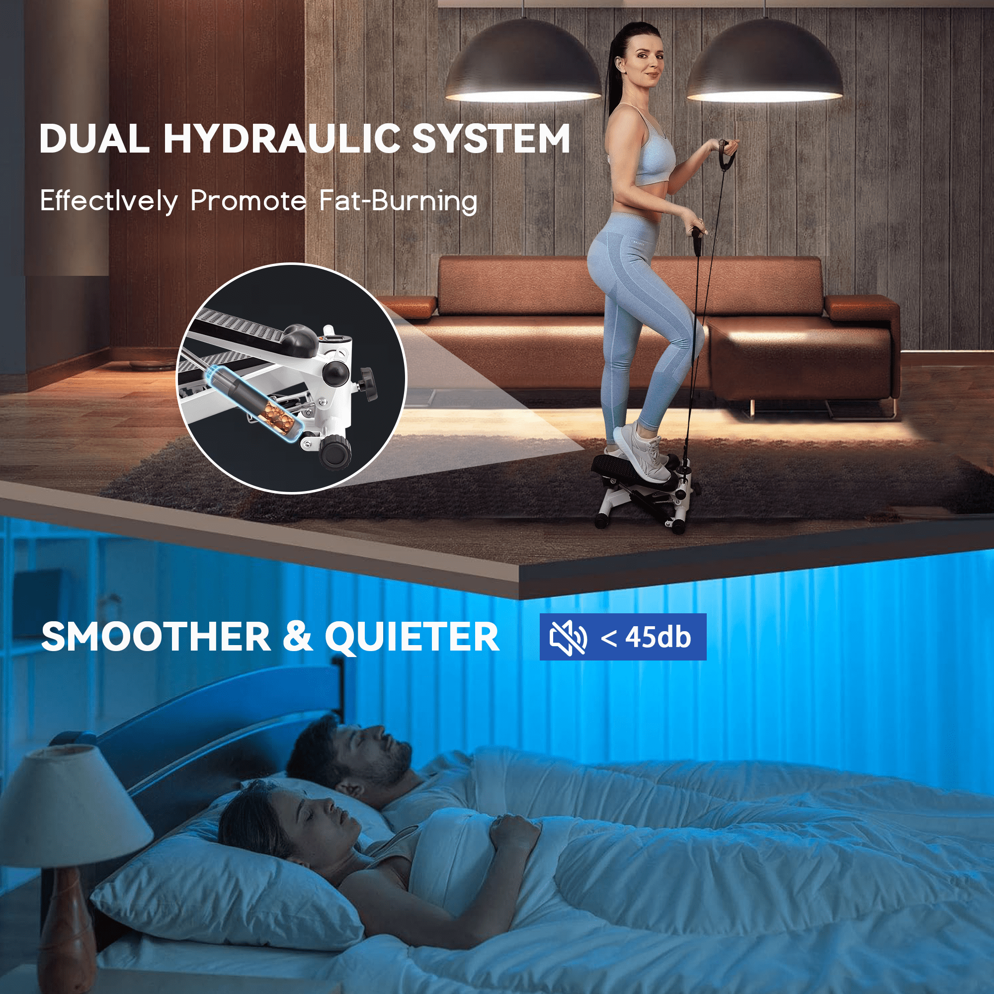 15 MINS FAST FAT-BURNING – By simulating stair climbing movements, 2023 Upgraded BIMZUC stair stepper offers a low-impact but high-efficiency aerobic exercise. In just 15 minutes, it enables you to exercise your CALVES, THIGHS, GLUTES, ABDOMEN, BACK, ARMS, SHOULDERS, etc, helping you shape a toned body. DUAL HYDRAULIC DRIVE SYSTEM & SUPER QUIET – BIMZUC stepper utilizes a dual-hydraulic drive system that provides stable resistance.The Shock-absorbing rubber pads at the end of the pedals effectively reduce the noise, creating a quieter and more enjoyable workout environment while prioritizing your safety.Pay attention that the hydraulic tube need rest after 20-minutes exercises. TWIST STEPPER WITH RESISTANCE BANDS – Compared with other steppers in the market, our mini stepper can allow you to twist the waist at the same time, making your whole body movement larger. Perfect for weight-loss, body-shape,and daily exercise. This resistance band can be removed at any time. SAVE TIME AND MONEY – Bid farewell to bulky and expensive equipment. BIMZUC stair stepper machine is designed for those who value an active lifestyle but struggle to find time for outdoor activities or gym visits. With small but mighty design, you can exercise at any time and anywhere, effortlessly incorporating more movement even on busy days. ABSOLUTE STABILITY & 331LBS LOADING CAPACITY – The loading structure of the BIMZUC stepper is made of 1.5MM thick commercial steel, which ensures absolute stability and 331LBS loading capacity. LED MONITOR – TRACK YOUR PROGRESS – The LED monitor on the mini stepper can clearly record exercise time, count, calories burned total count,and distance in mile. It is convenient for you to know your exercise situation and make your next exercise plan.