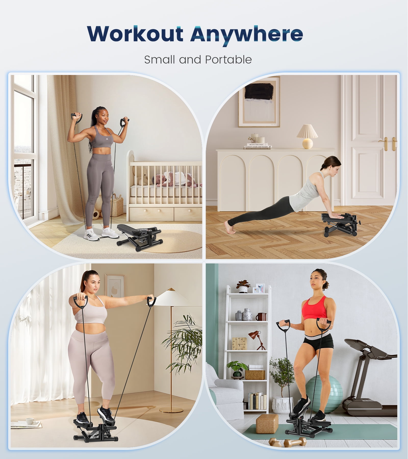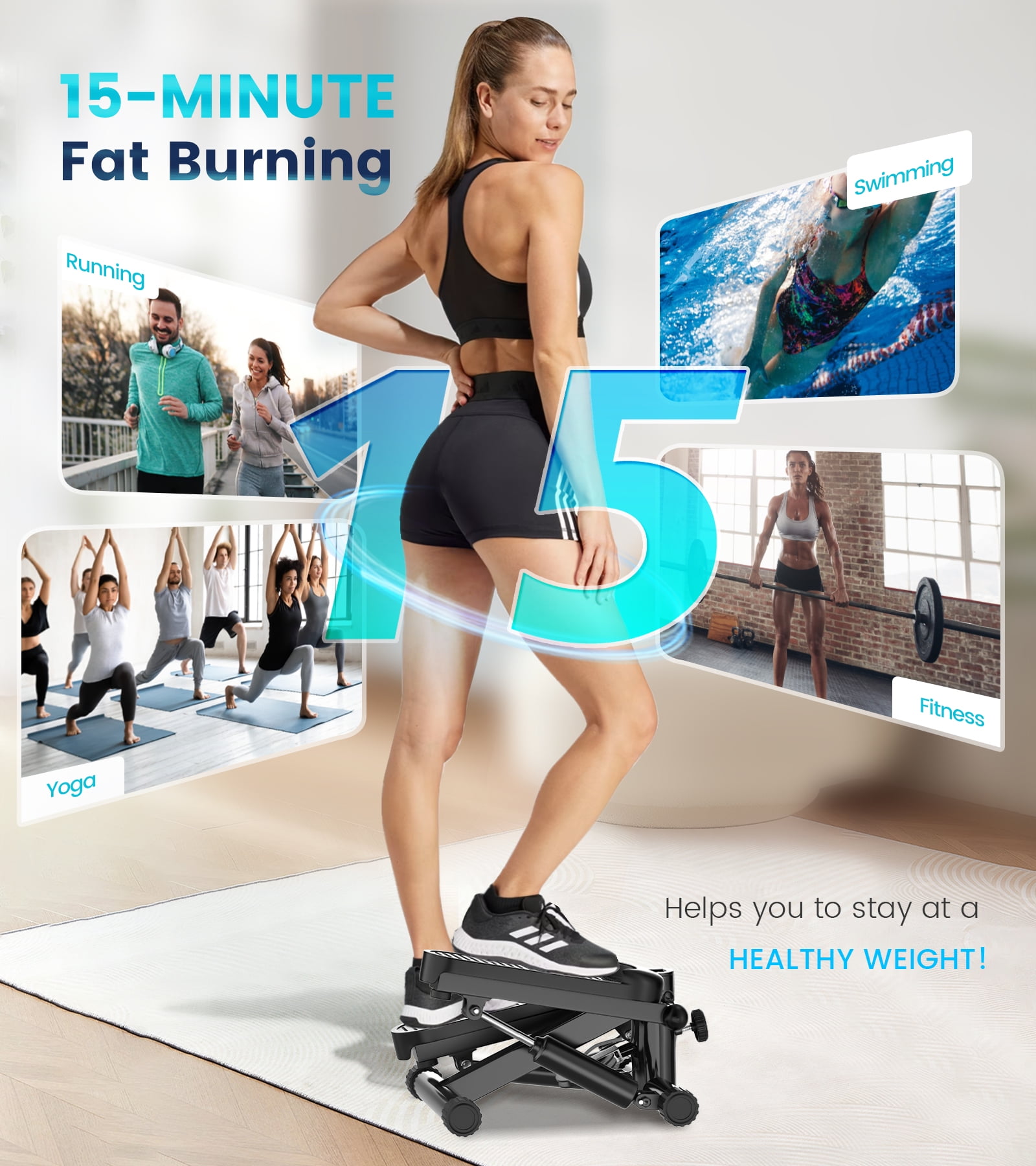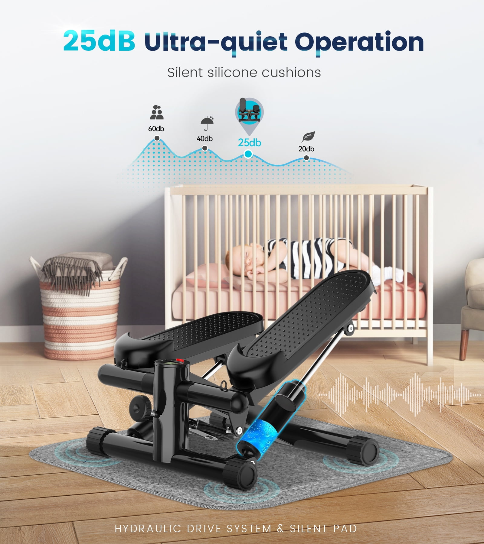 BIMZUC Steppers For Exercise – Mini stepper’s smooth hydraulic system will maintain high resistance for 30 minutes in each exercise cycle to help you burn fat quickly and get full body exercise. The resistance will gradually decrease after 30 minutes to help you keep in the cardio state and achieve the best exercise effect. It is an ideal exercise equipment at home! Max 331LBS Loading – The loading structure of this stair stepper is made of 2.2MM thick commercial steel & advanced hydraulic system, which ensures absolute stability to protect you from accidental falls, this also gives this mini stepper a maximum load-bearing capacity of 331 pounds, which is suitable for all weight groups. Super Quiet Design – This mini stepper exercise machine offers smooth and ultra-quiet hydraulic drive system and ensures stability and increased resistance while reducing noise from friction. During exercise, it operates at a decibel level of 25 dB, ensuring a quiet workout that does not disturb other people. Comes with a free stepper mat, which is a equipment extra you get to avoid scratching the floor and generating noise. LED Monitor Tracks Your Workout – Stay informed with the smart LCD monitor, tracking the count of steps, exercise time, and calories burned. Make your exercise more effective and aligned with your goals, and provide you with a more scientific and data-driven approach to weight loss and exercise. Equipped with resistance bands to increase the possibility of twist workout. Adjustable Stepper Pedal Height – There is a stride adjustment knob in front of the stepper. You can adjust the height of the steps according to your needs. A low stride makes it easier to step, and a high stride will best simulate the feeling of striding upstairs, in this mode, the exercise effect is almost twice that of the other steppers without an adjustable function. 100% Pre-Assembled – This stepper is ready to use right out of the box, no installation is required at all. It’s 100% pre-assembled, so when you receive it, you can skip the hassle of installing it, all you need to do is open the box and enjoy the sport! Choose the BIMZUC stepper to help you enjoy the pure joy of exercise!