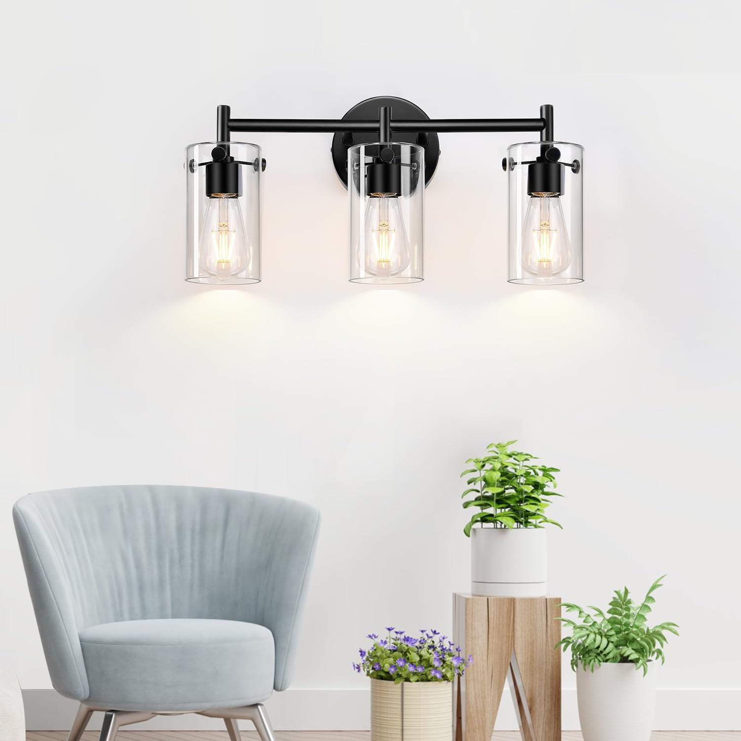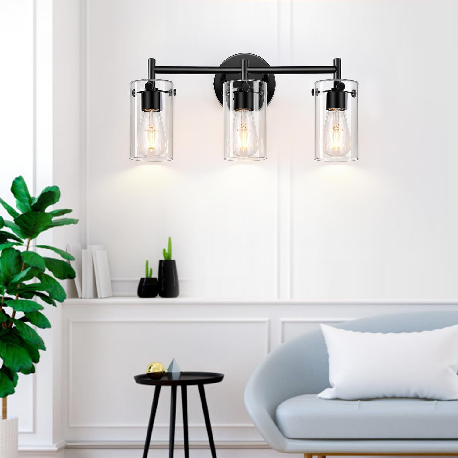Binsuca Bathroom Light Fixtures, 3-Light Matte Black Bathroom Vanity Light, Black Bathroom Lights Over Mirror with Clear Glass Shade, Bathroom Wall Sconces for Mirror Bedroom Living Room Hallway
