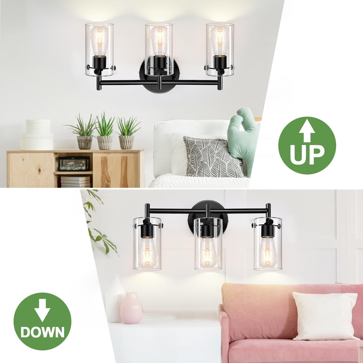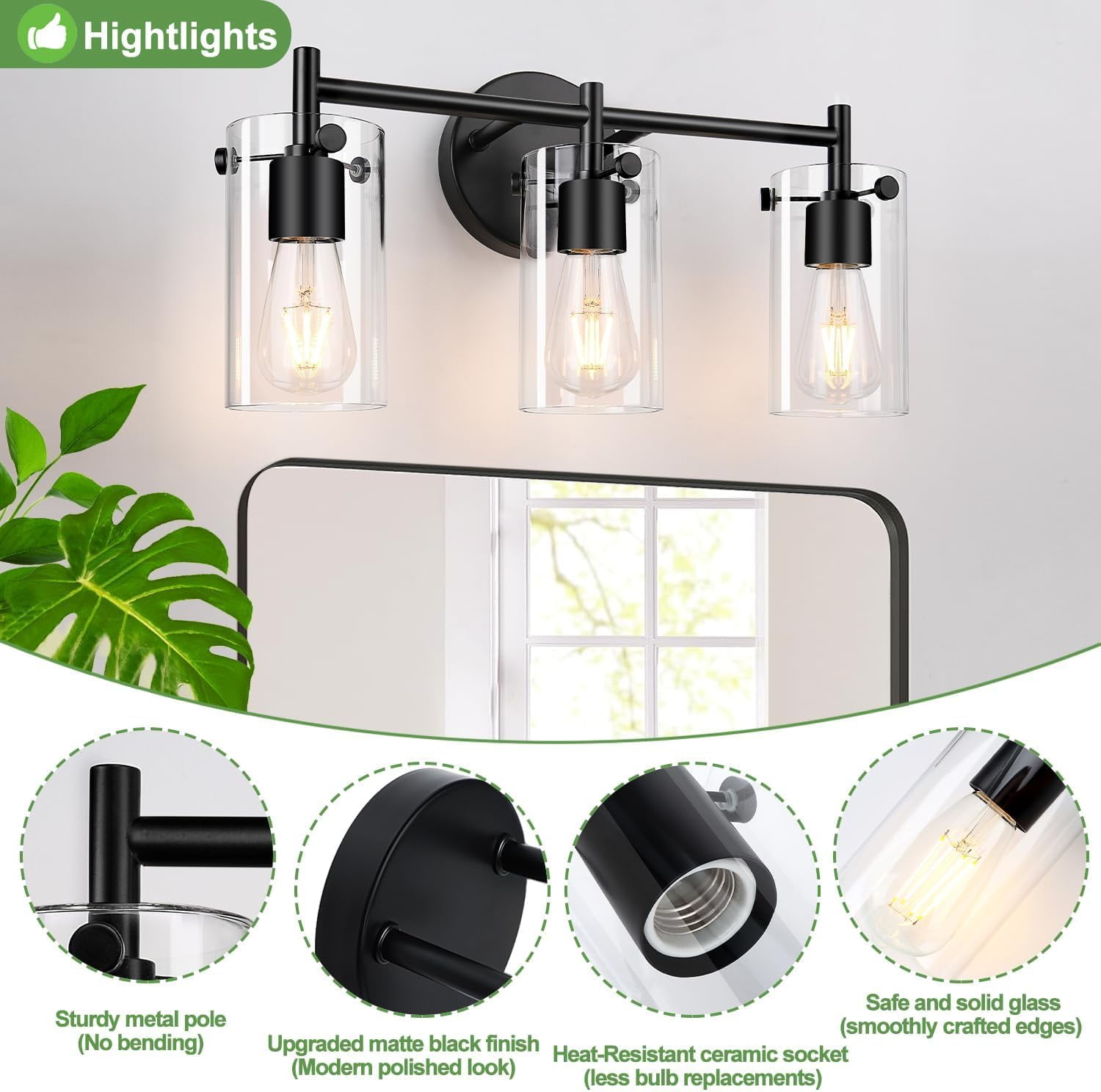 Superior Durable Metal:Our wall light fixtures have a high-quality matte black finish and tarnish and scratch-resistant coating. They also have a strong metal pole that maintains their sleek look over time. Matte Black Metal Screws:Our wall bathroom light fixture includes sturdy metal screws that secure the glass shades and a ceramic socket, reducing the need for frequent bulb changes. This option is cost-effective and safe. Thick & Solid Glass:Our mirror vanity light fixture features an ultra-clear, thick glass shade. This solid glass construction enhances its overall sturdiness and durability. In the unlikely event that the shade arrives broken, we offer hassle-free replacements without requiring a return, ensuring your complete satisfaction. Unique Modern Industrial Style: The bathroom light fixtures are built in a sturdy matte black lamp body with clear glass shades, better decorate your home. Committed to creating high-quality bathroom lights No-Worry Purchase: Good quality packages are selected to protect the bathroom light fixture from inside to outside during transportation, we have checked every bathroom light before shipping to make you smile with this purchase.
