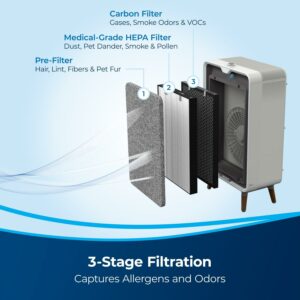 – 3-Stage Filtration for Simply Clean Air . Includes a fabric pre-filter, activated carbon filter, and an HEPA filter to capture large and fine particles, home odors, odors from pet, and VOCs.