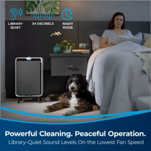 – Medical-grade HEPA Filter. Captures 99.97% of particles 0.3 microns and smaller when on lowest fan speed, helping to remove airborne allergens and irritants like dust, pet dander, pollen, and smoke like that from wildfires, cooking and smoking.