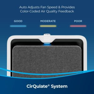 – Automated CirQulate System. PM 2.5 particle sensor monitors and provides color-coded, indoor air quality readings and adjusts to the appropriate fan speed for continuous clean air.