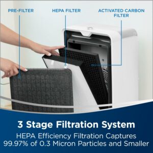 – 3 Stage Filtration. Includes a Fabric Pre-Filter, an Activated Carbon Filter, and a HEPA Filter which captures 99.97% of 0.3 micron particles and smaller when on lowest fan speed, including pollen, dust, smoke, hair, and pet dander.