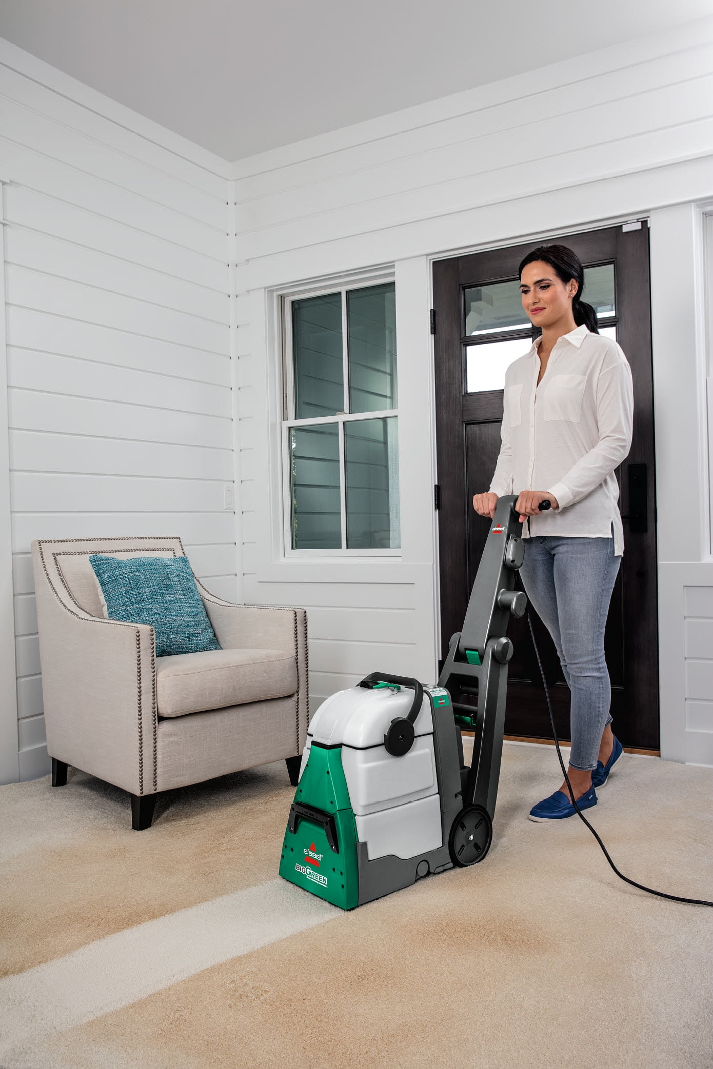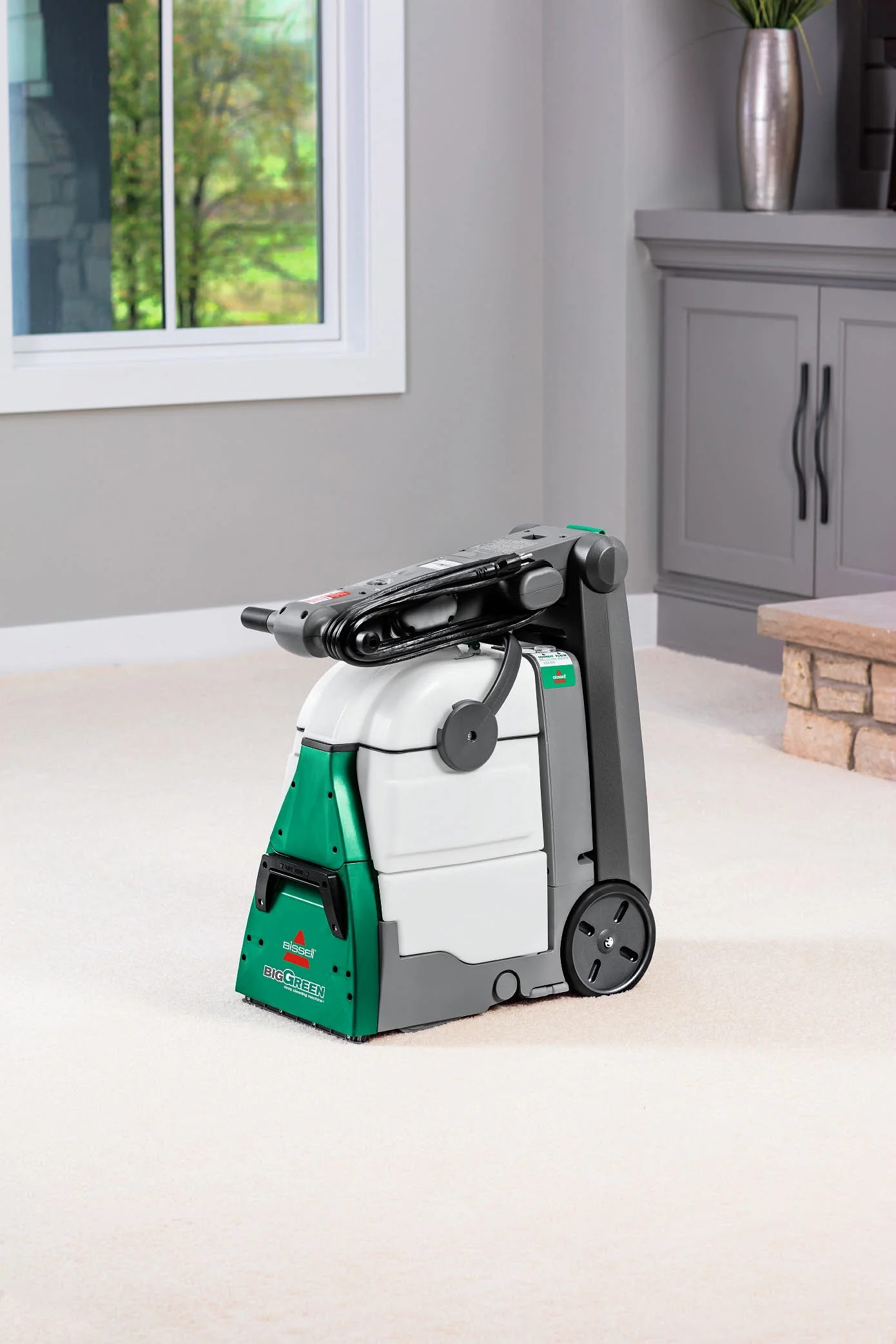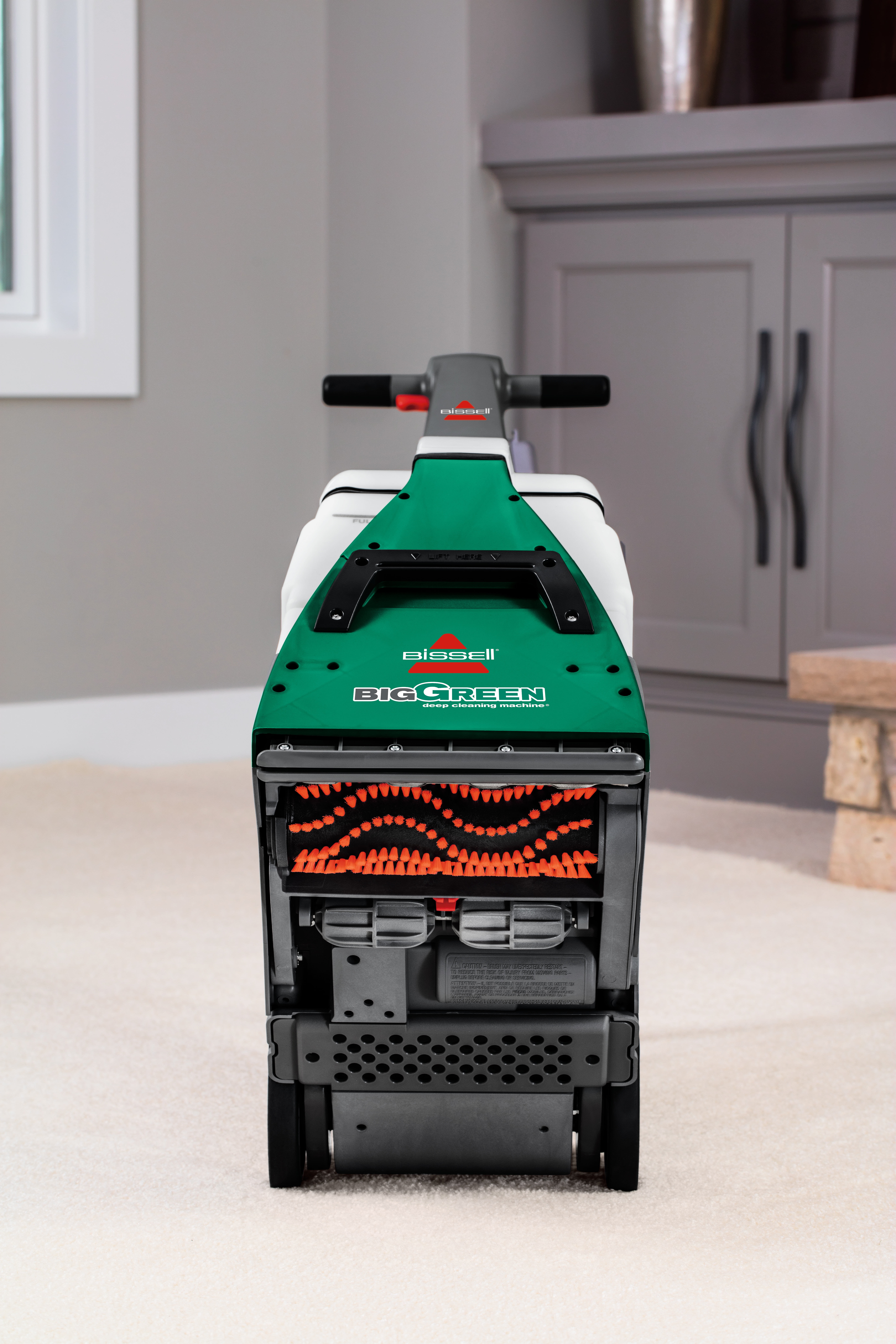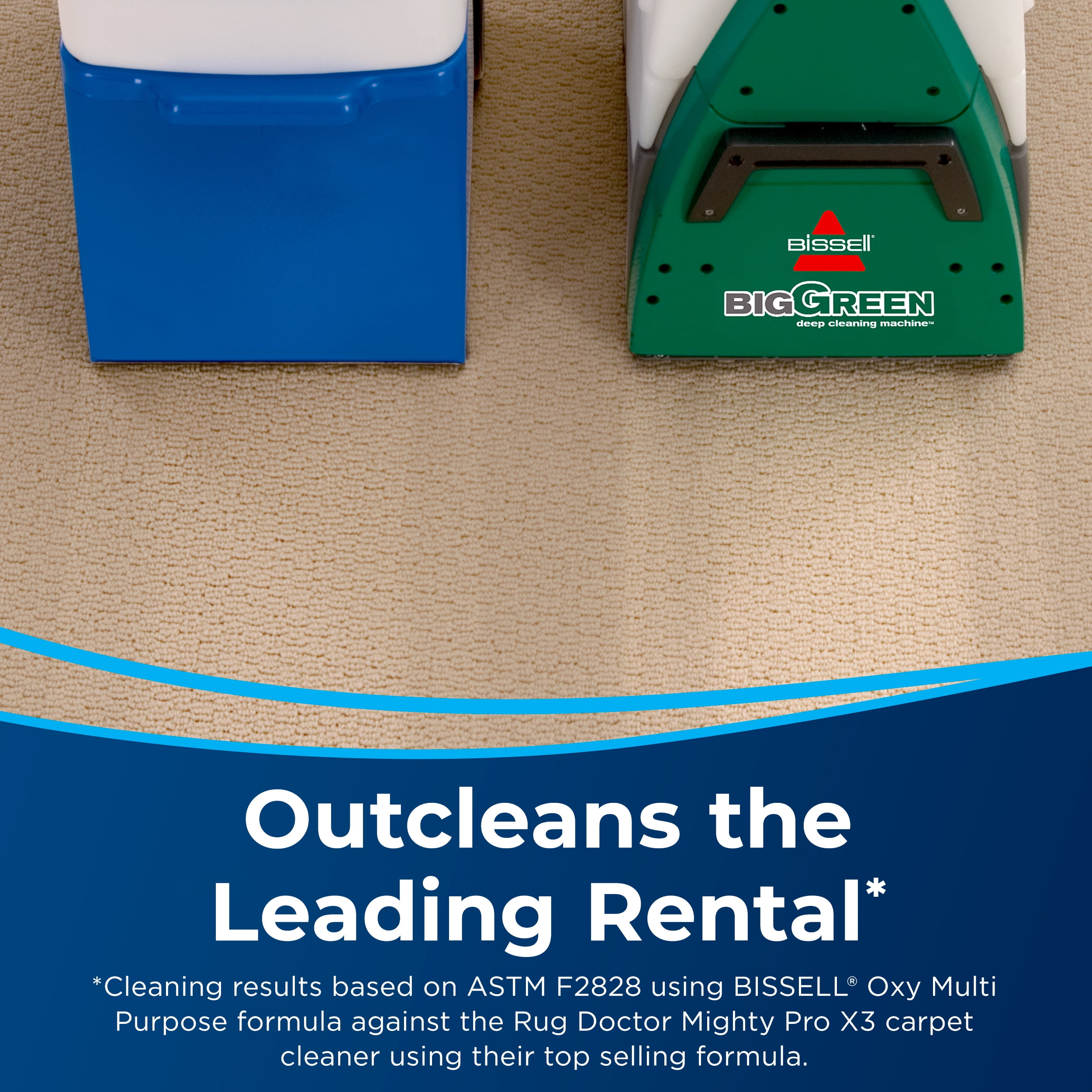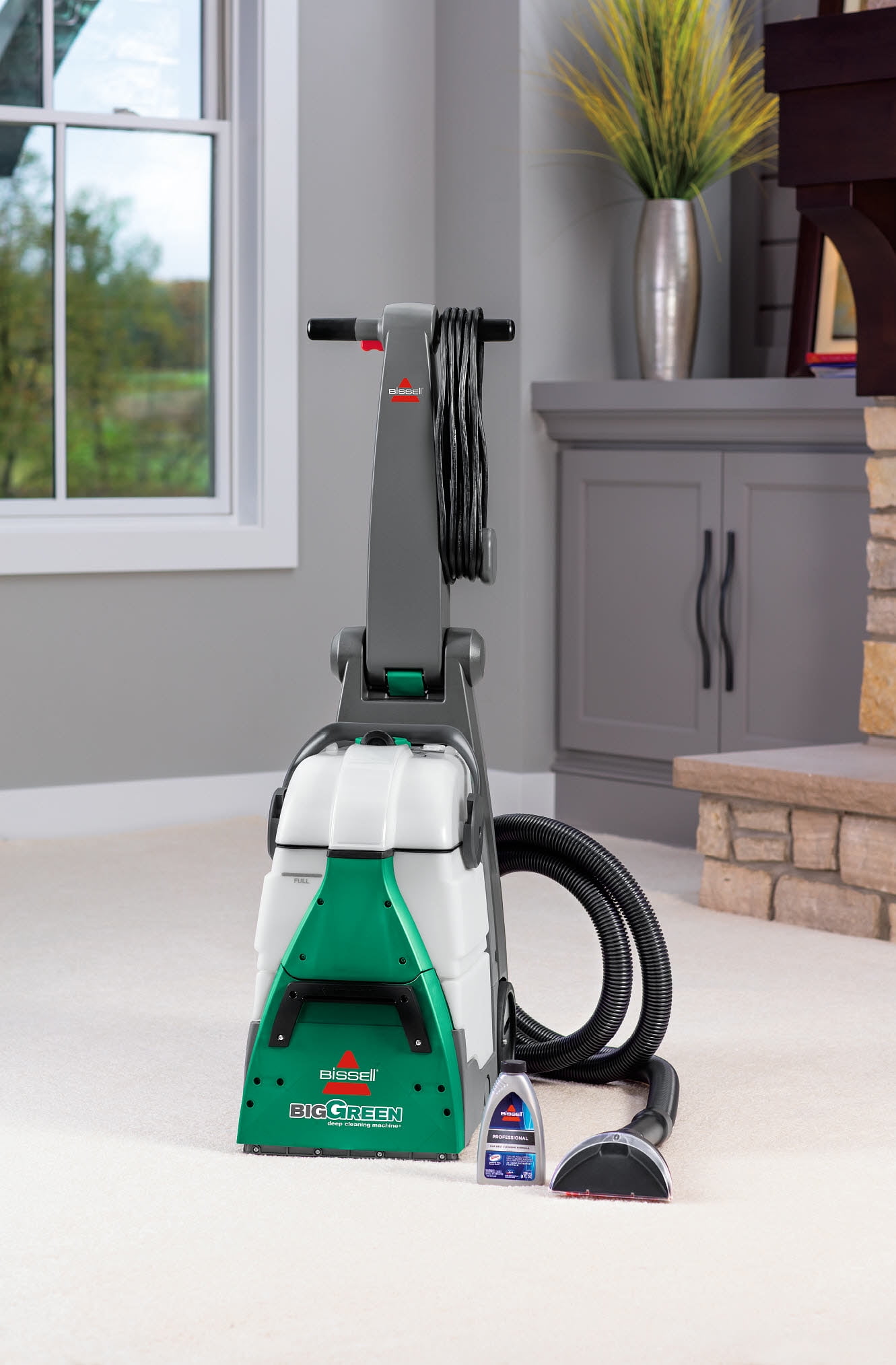 Bissell Big Green Machine Professional Carpet Cleaner Machine, 86T3: Every Purchase Saves Pets™. BISSELL® proudly supports BISSELL Pet Foundation® and its mission to help save homeless pets. Outcleans the Leading Rental.* Get professional style cleaning results. 8-Row XL DirtLifter® Power Brush. Penetrates carpet fibers to loosen and lift away embedded dirt. 6″ Tough Stain Tool & 9′ Long Reach Hose. Easily clean upholstery, stairs and other hard-to-reach places. Remove Tough, Ground-In Dirt & Stains. Comes with three 8 oz. trial-size bottles of BISSELL® PRO MAX Clean + Protect Formula. Two Large-Capacity Tanks. Keep dirty water separate from clean water while deep cleaning. Clean Comfortably. Adjustable handle lets you comfortably maneuver the machine. 25′ Power Cord. Reach more spaces and places while cleaning. *Cleaning results based on ASTM F2828 using BISSELL® Oxy Multi Purpose formula against the Rug Doctor Mighty Pro X3 carpet cleaner using their top selling formula.
