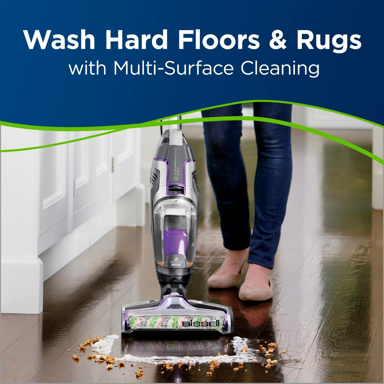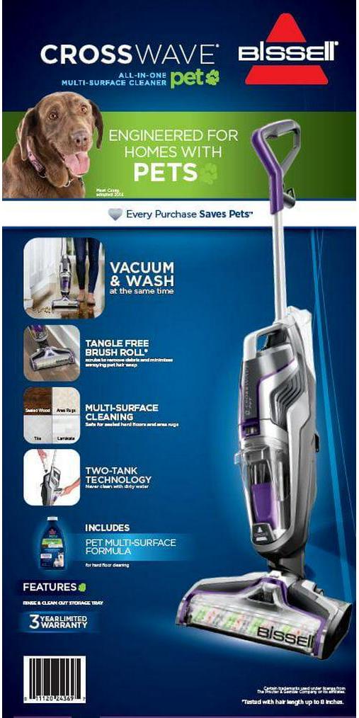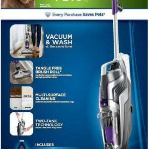 Vacuums and washes your floors at the same time. Designed for pet clean up, Multi-Surface Pet Brush Roll, Multi-Surface Pet Cleaning Formula, a Rinse & Clean Out Tray, and a Pet Hair Strainer for an easy cleanup. The Pet model includes specialized pet cleaning solutions to help remove pet odors.