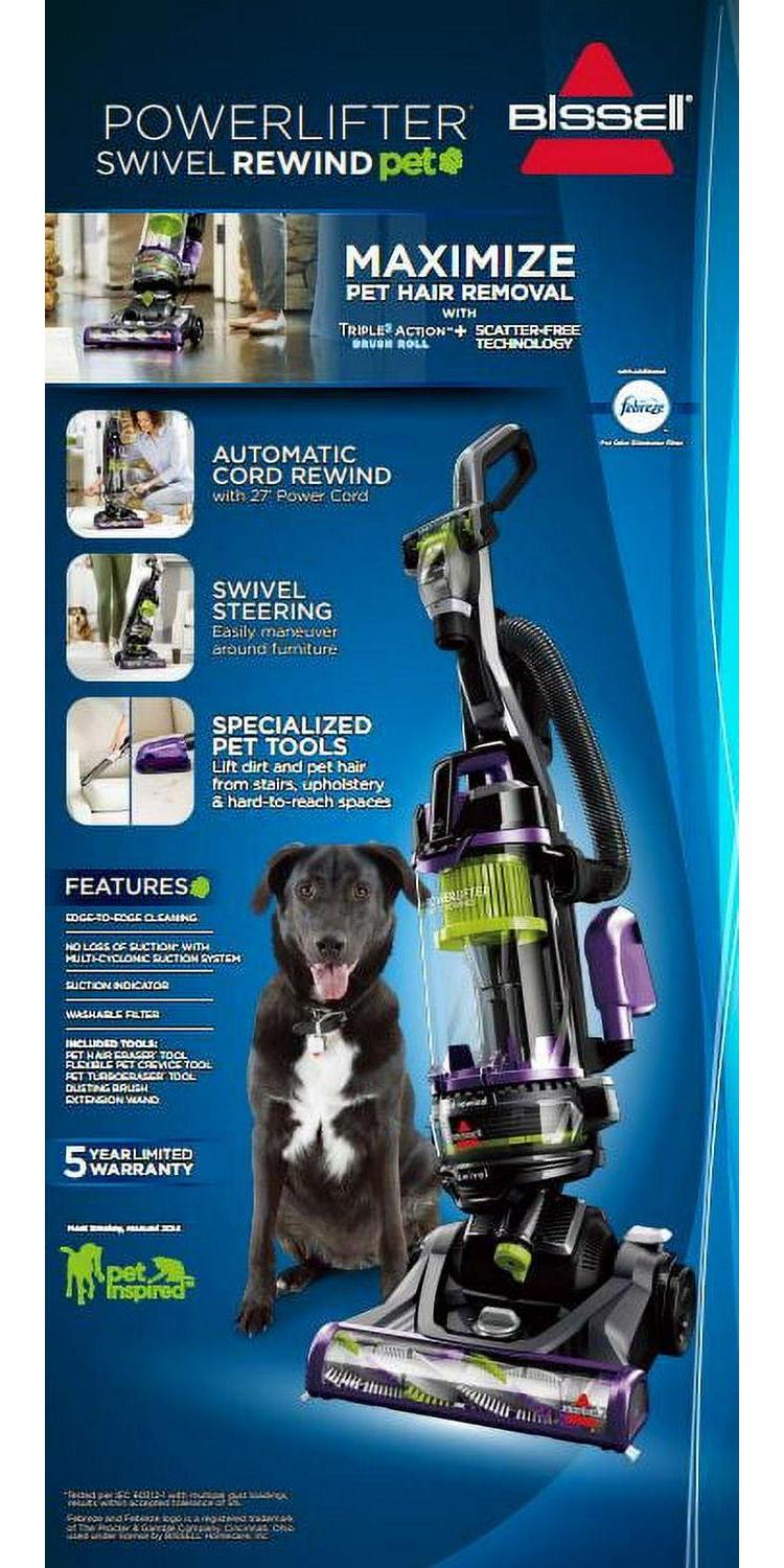The BISSELL Powerlifter Swivel Rewind Pet Vacuum gives a whole new meaning to convenient cleaning From the second you start using it, you’ll notice its lightweight design and swivel steering work in your favor, giving you easy maneuverability, which makes cleaning quick and less of a chore Plus, with specialized pet tools, you can effortlessly switch from cleaning your floors to those above floor spots like blinds, corners, and upholstery that easily collect pet hair and dust Powerlifter Swivel Rewind Pet also comes with our innovative multi-cyclonic suction which keeps dirt and debris secure in the dirt tank and away from the filters and motor, so they last longer Then when it’s time to pack things up, simply press the automatic cord rewind button and store it away until next time.