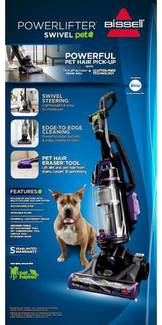 The BISSELL Powerlifter Swivel Pet gives you the outstanding performance you’d expect from an expert floorcare company at a great price It has specialized pet tools and features, so you know its designed for homes with pets The Triple Action Brush Roll lifts, loosens, and removes embedded pet hair and its silk-like bristles work gently on hard floors to remove fine debris while also keeping it contained with Scatter-Free Technology Just as its name suggests, the Powerlifter Swivel Pet has Swivel Steering that gets around and under furniture and other obstacles in your home Pair that with Edge-to-Edge cleaning capabilities and you can clean with confidence that you’re getting more with each pass giving you a new outlook on convenient cleaning.